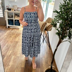 Vestido en media manga amplio. Talla única recomendada 38/42. Medida de contorno de pecho 100. Ana lleva habitualmente talla 40 y mide 1.71m