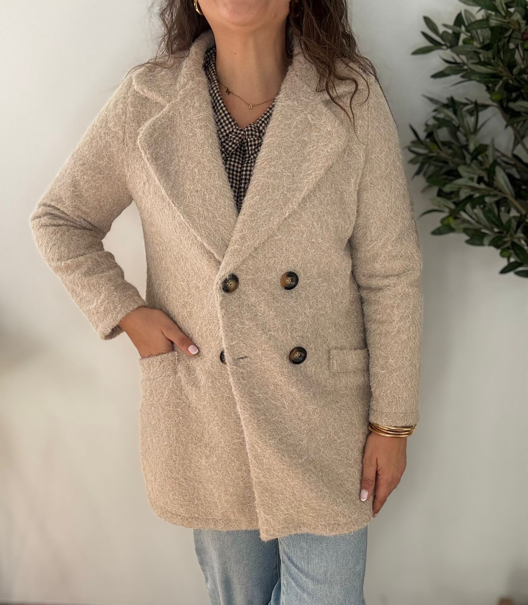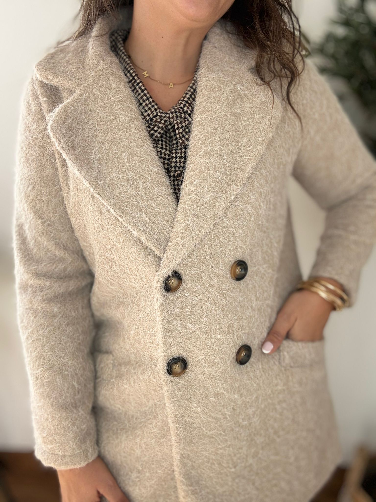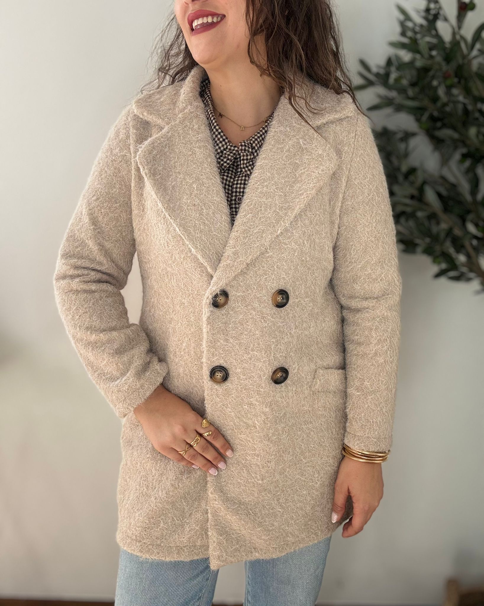 Abrigo calentito de lanita abotonado. Tiene bolsillos. TU RECOMENDADA 36/44. Ana lleva habitualmente talla L 40/42 y mide 1.71m Medidas del abrigo (cerrado) contorno de pecho 110, cadera 120 y largo 90cm
