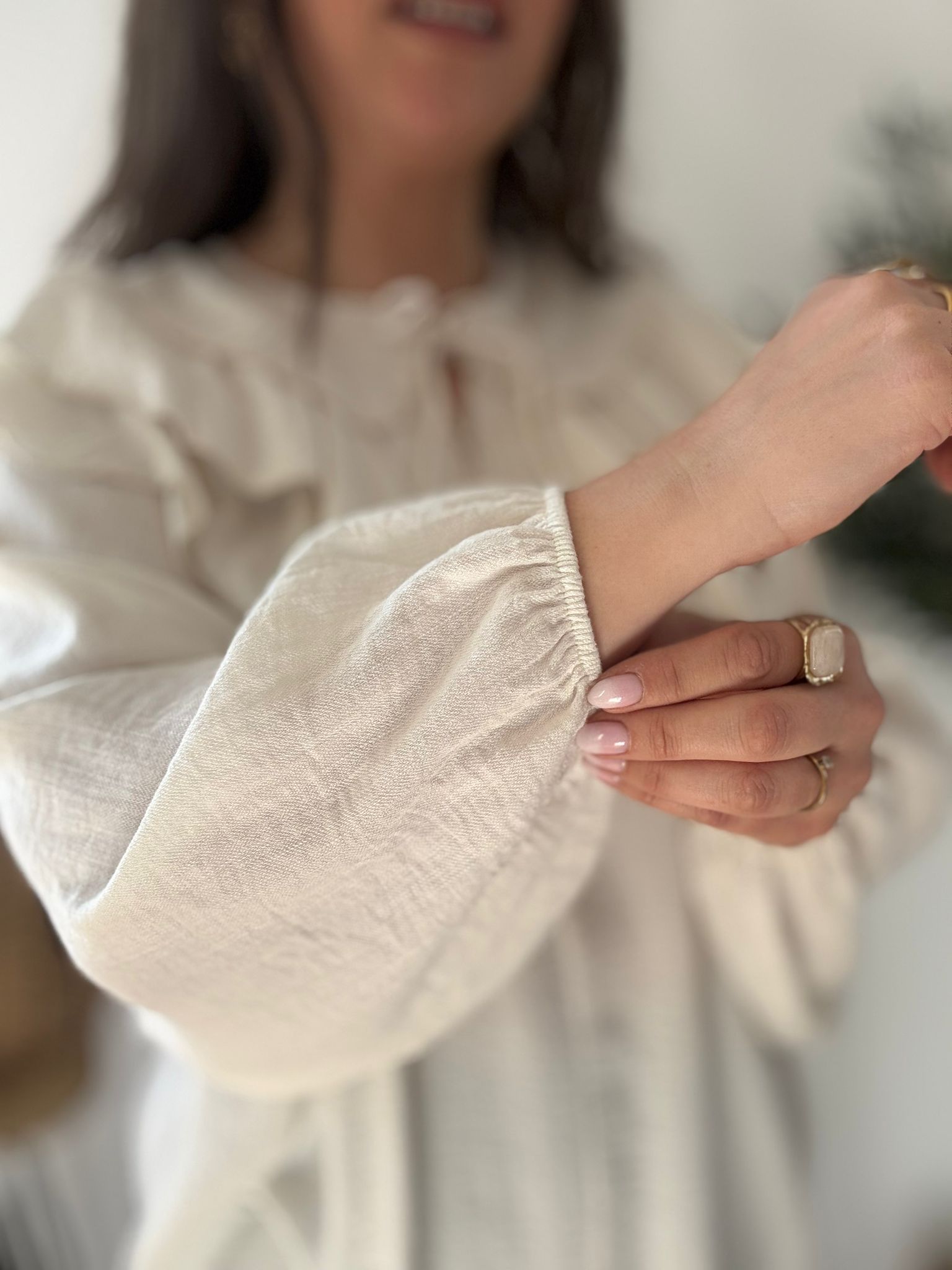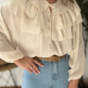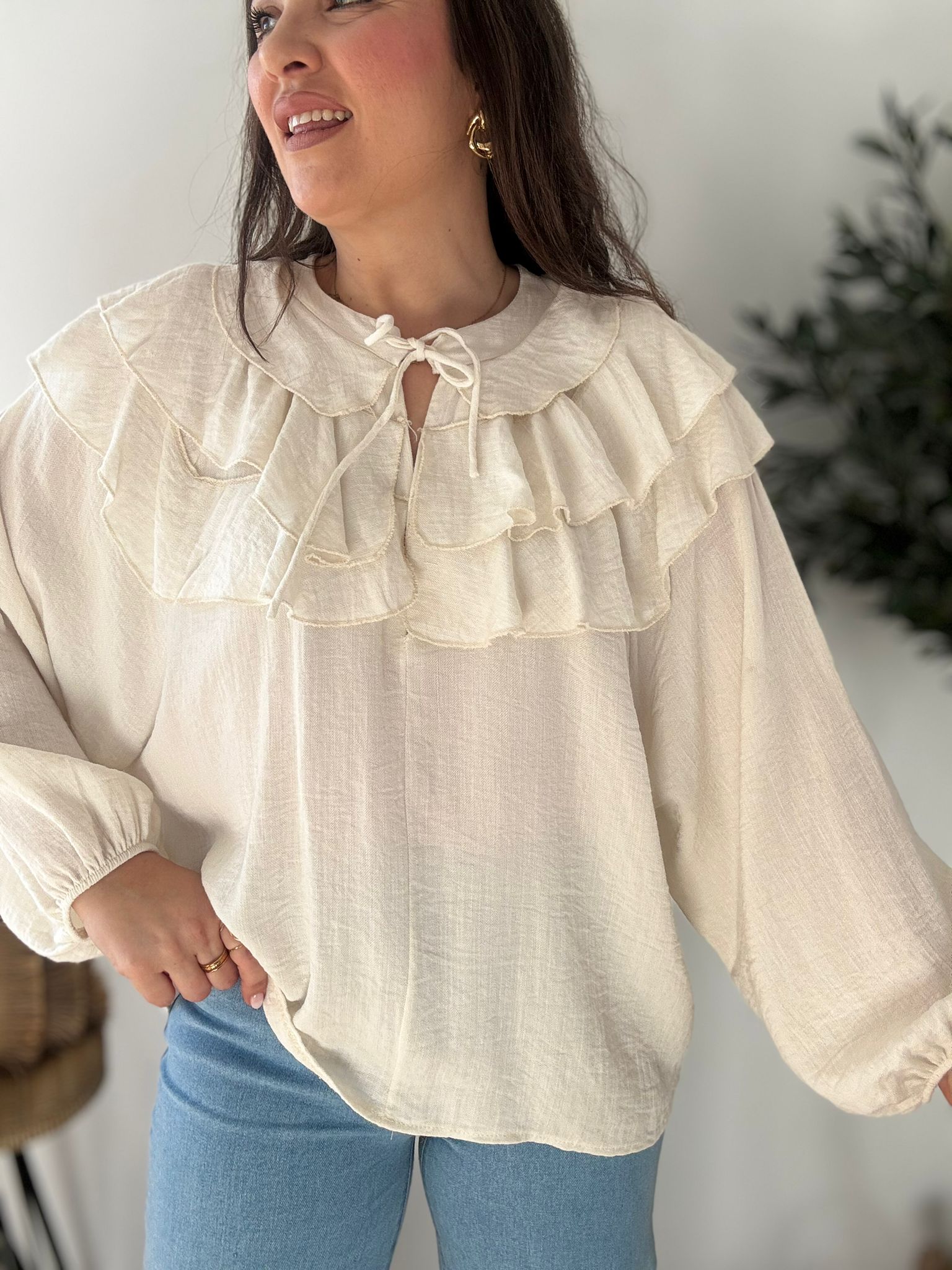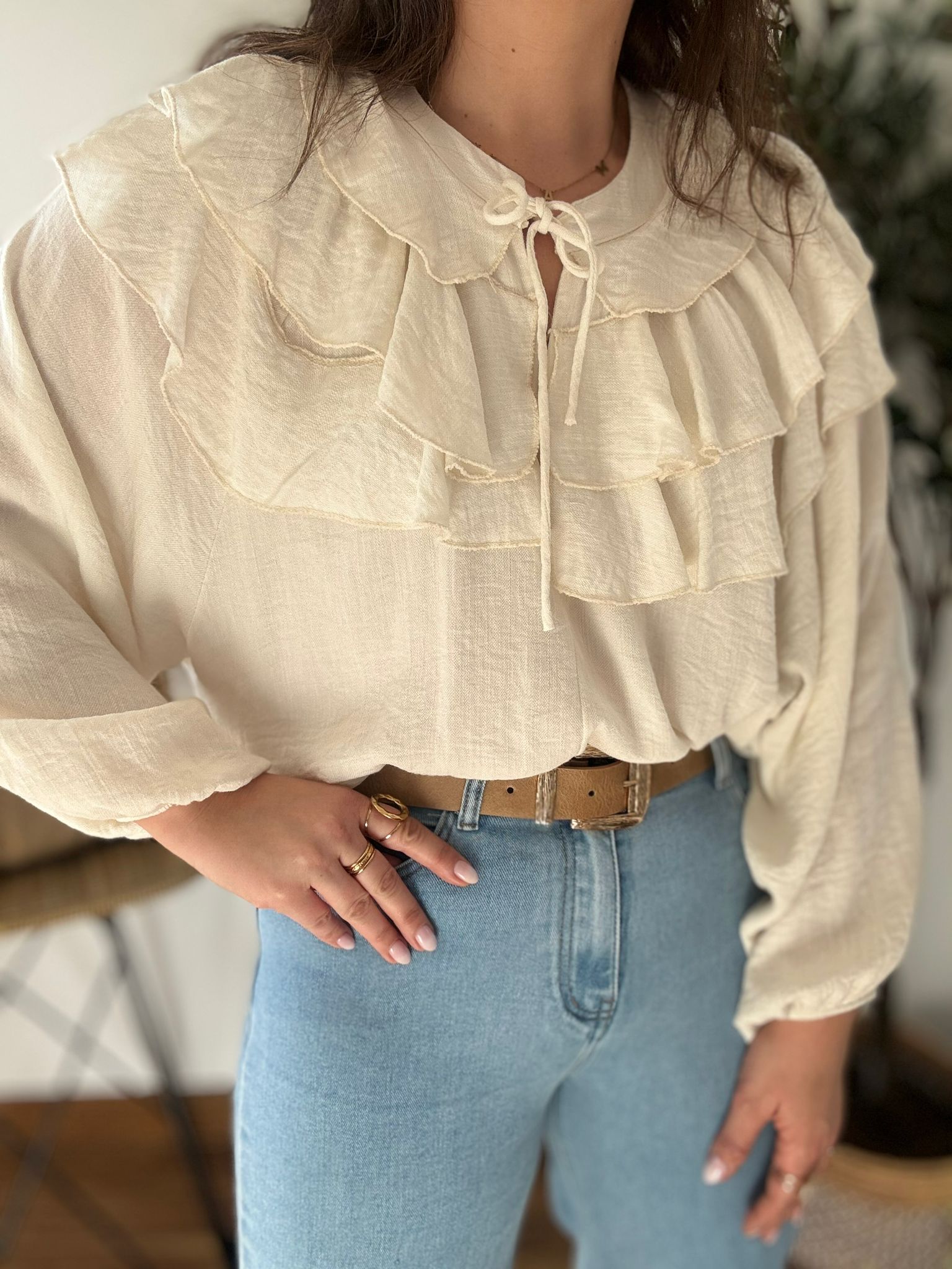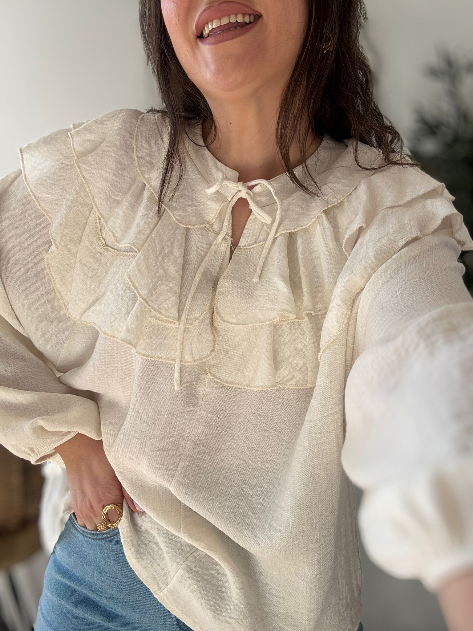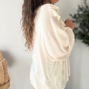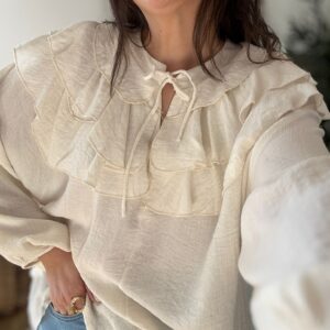 Maxi blusa con detalle de volantes y escote con lazada. Lleva puños engomados. Tejido 100% viscosa. Es bastante amplia. TU RECOMENDADA 38/46. Ana lleva habitualmente talla L/40. Medidas de la blusa: contorno de pecho 130 y largo 65cm