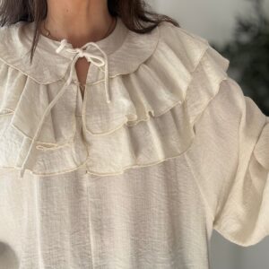 Maxi blusa con detalle de volantes y escote con lazada. Lleva puños engomados. Tejido 100% viscosa. Es bastante amplia. TU RECOMENDADA 38/46. Ana lleva habitualmente talla L/40. Medidas de la blusa: contorno de pecho 130 y largo 65cm