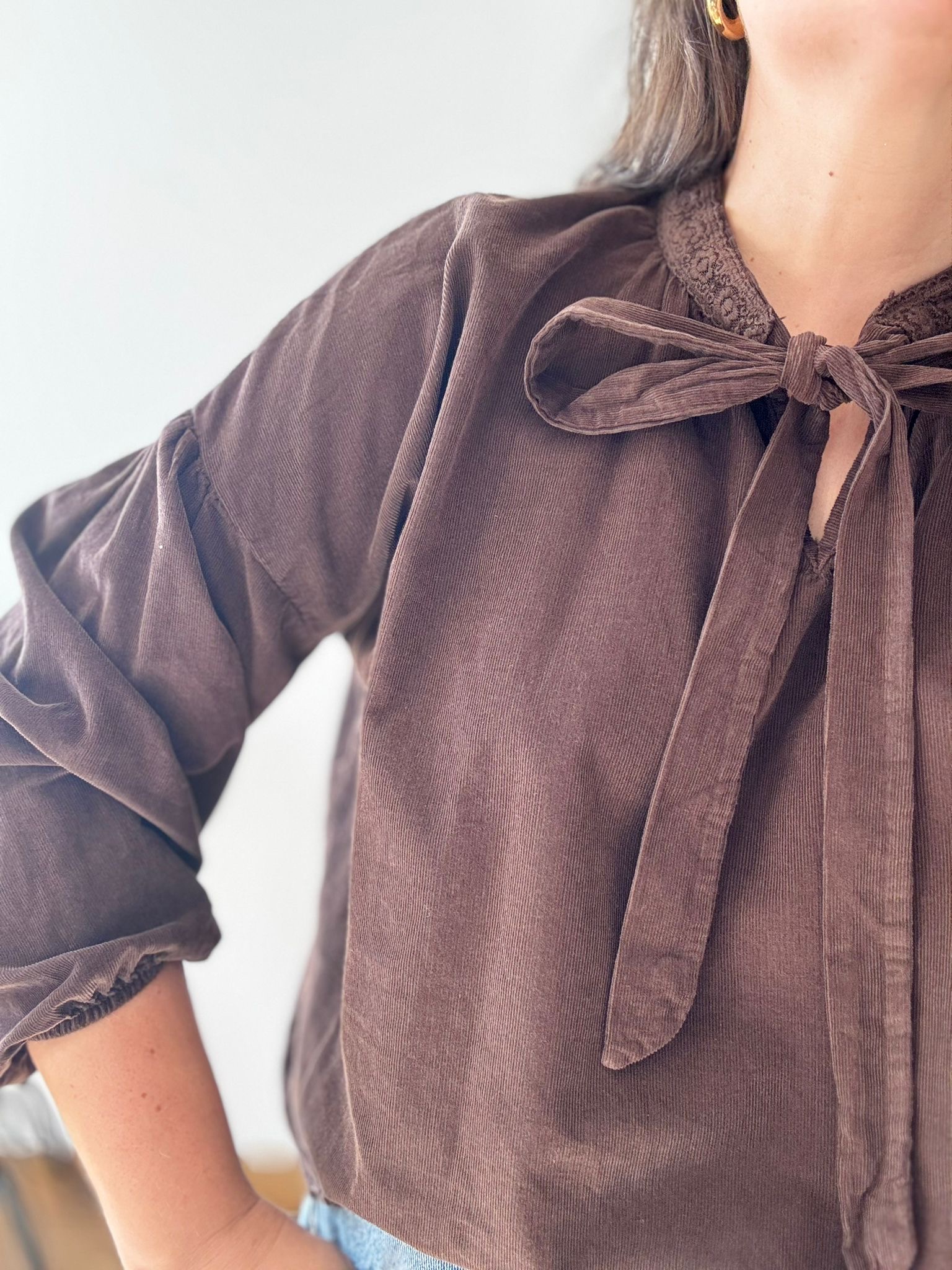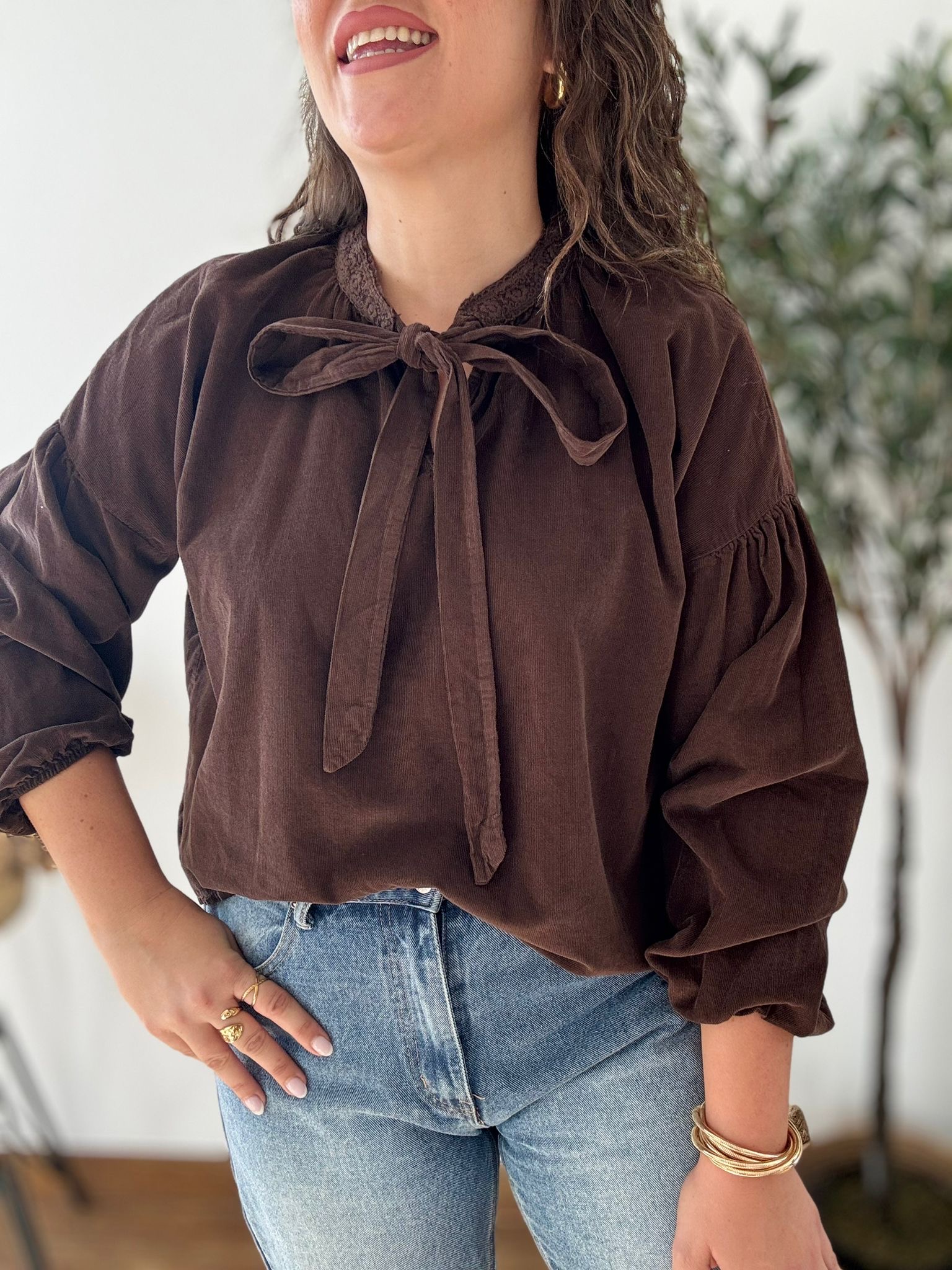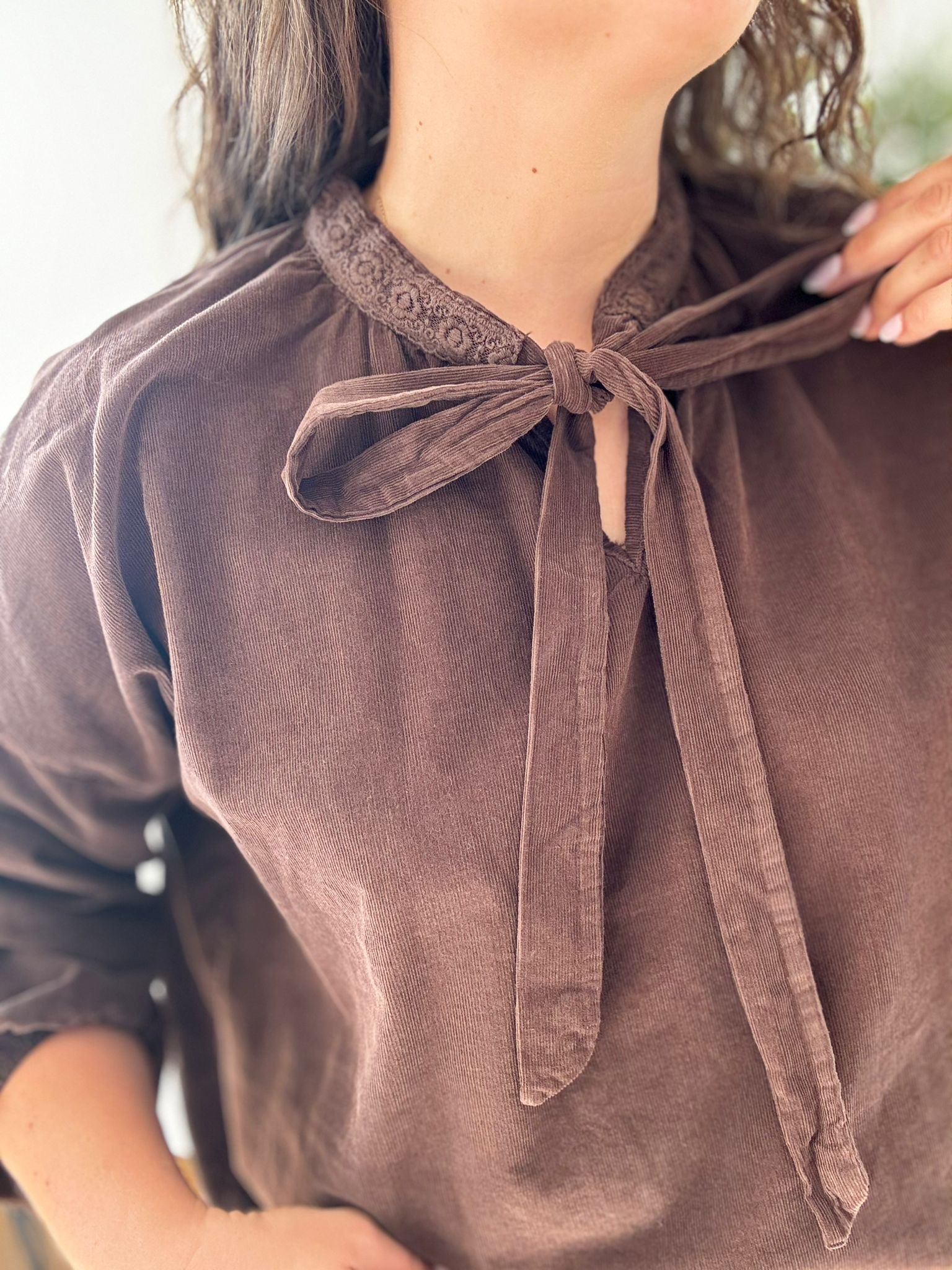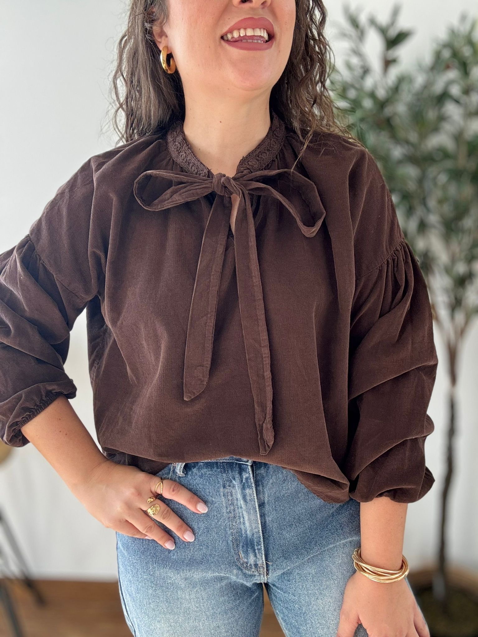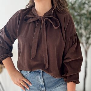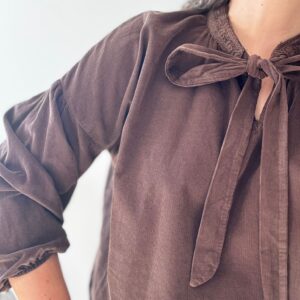 Blusa de micropana con detalle de bordados en el cuello y lazada. Lleva puños elásticos. TU RECOMENDADA 38/44. Ana lleva habitualmente talla L 40/42. Medidas de la blusa: contorno de pecho 130 y largo 58cm