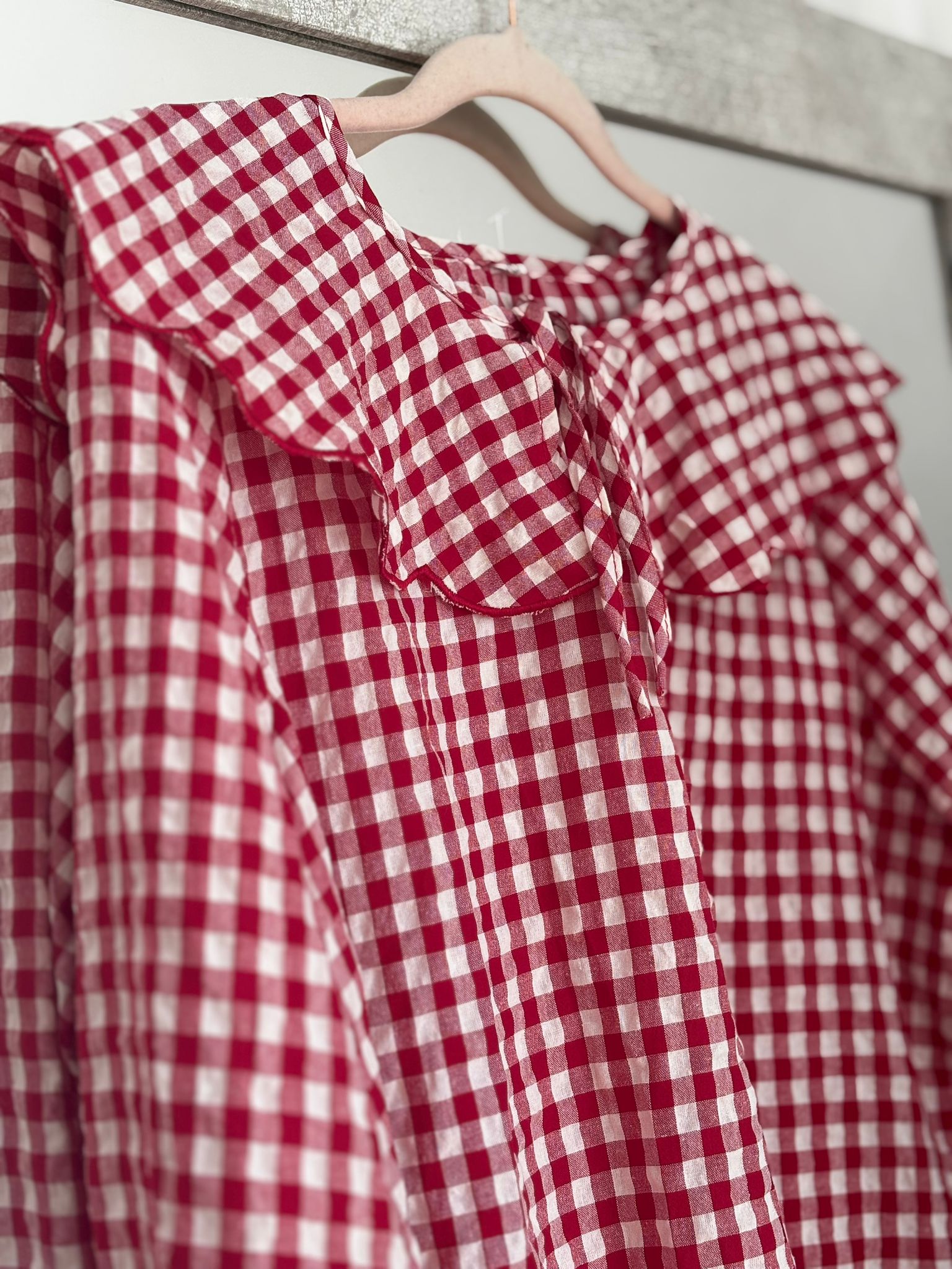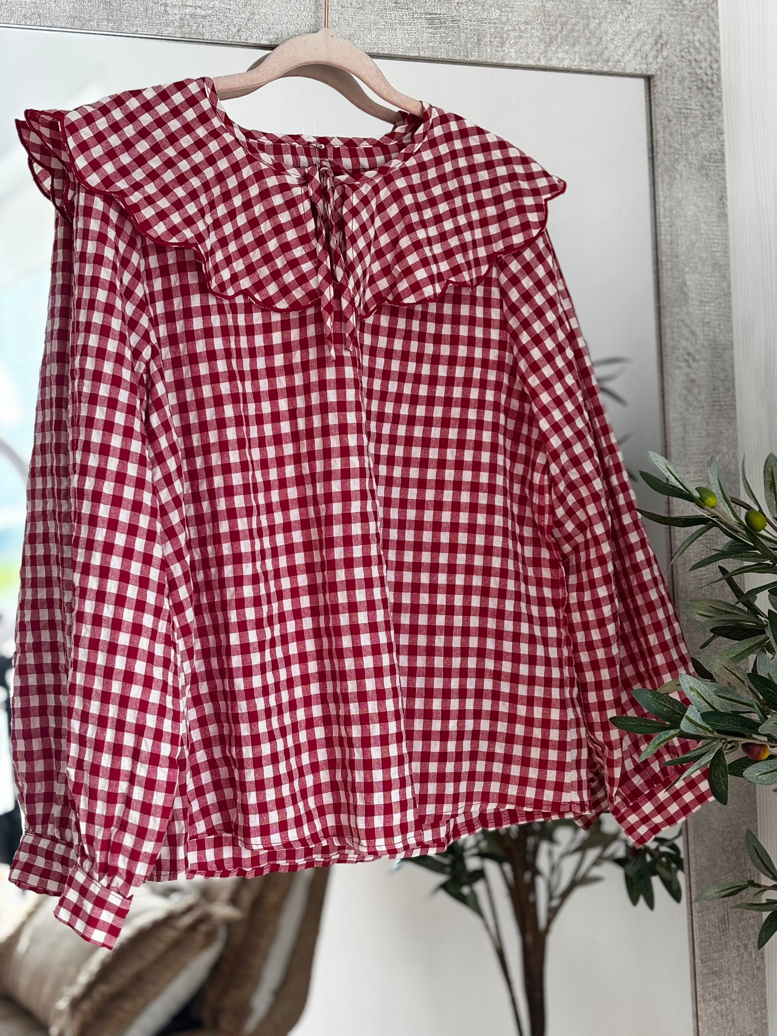 Blusa estampada de VICHY rojo con lazada y cuello bebé. Medidas por talla S/M contorno de pecho 98cm y L/XL 105