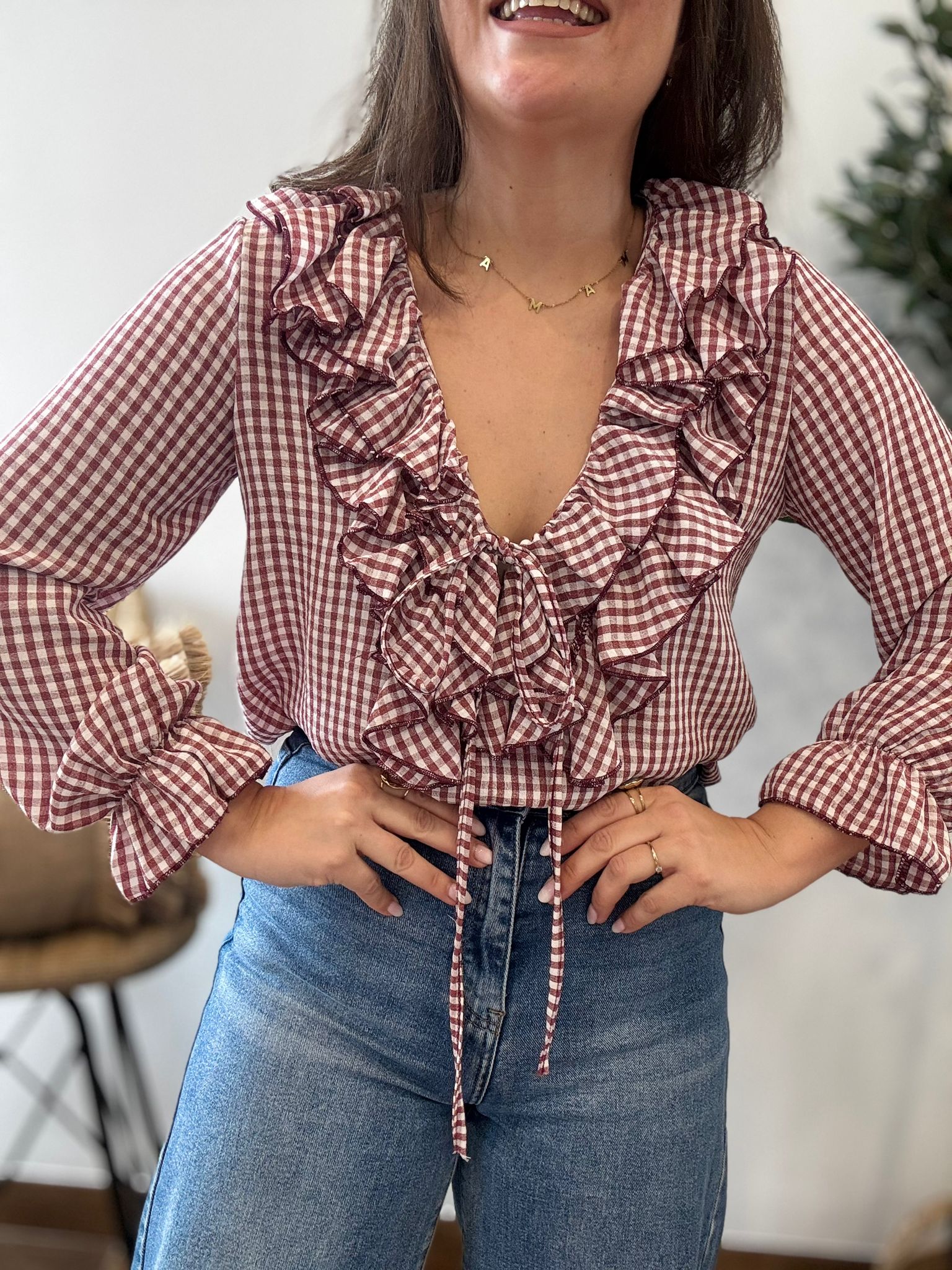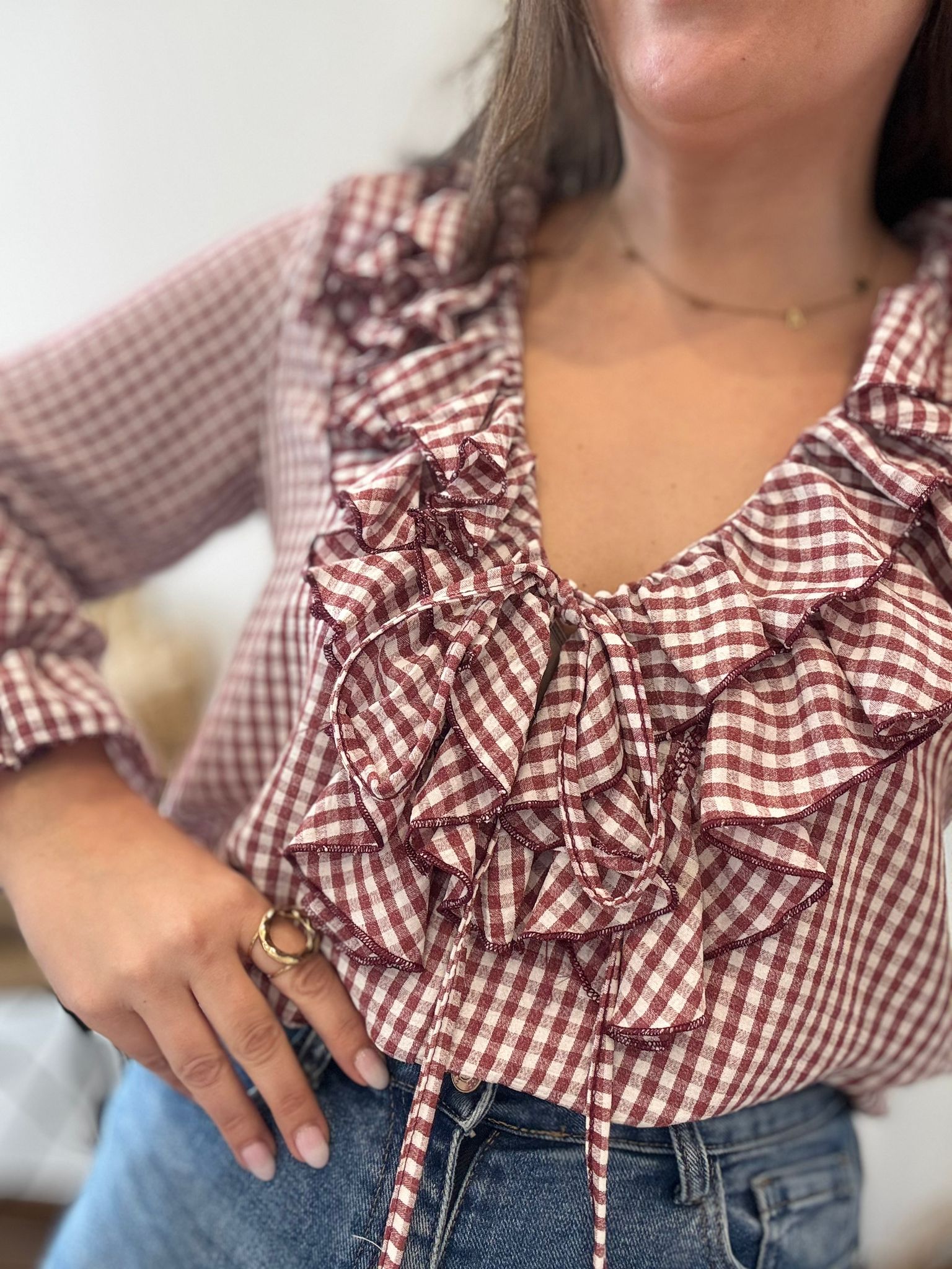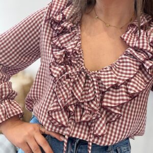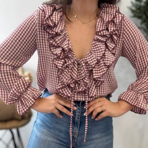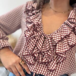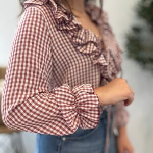 Blusa estampada VICHY con escote en pico, volantes y lazada. Puños engomados. TU RECOMENDADA 36/44. Ana lleva habitualmente talla L/40. Medidas de la blusa: contorno de pecho 110 y largo 59cm