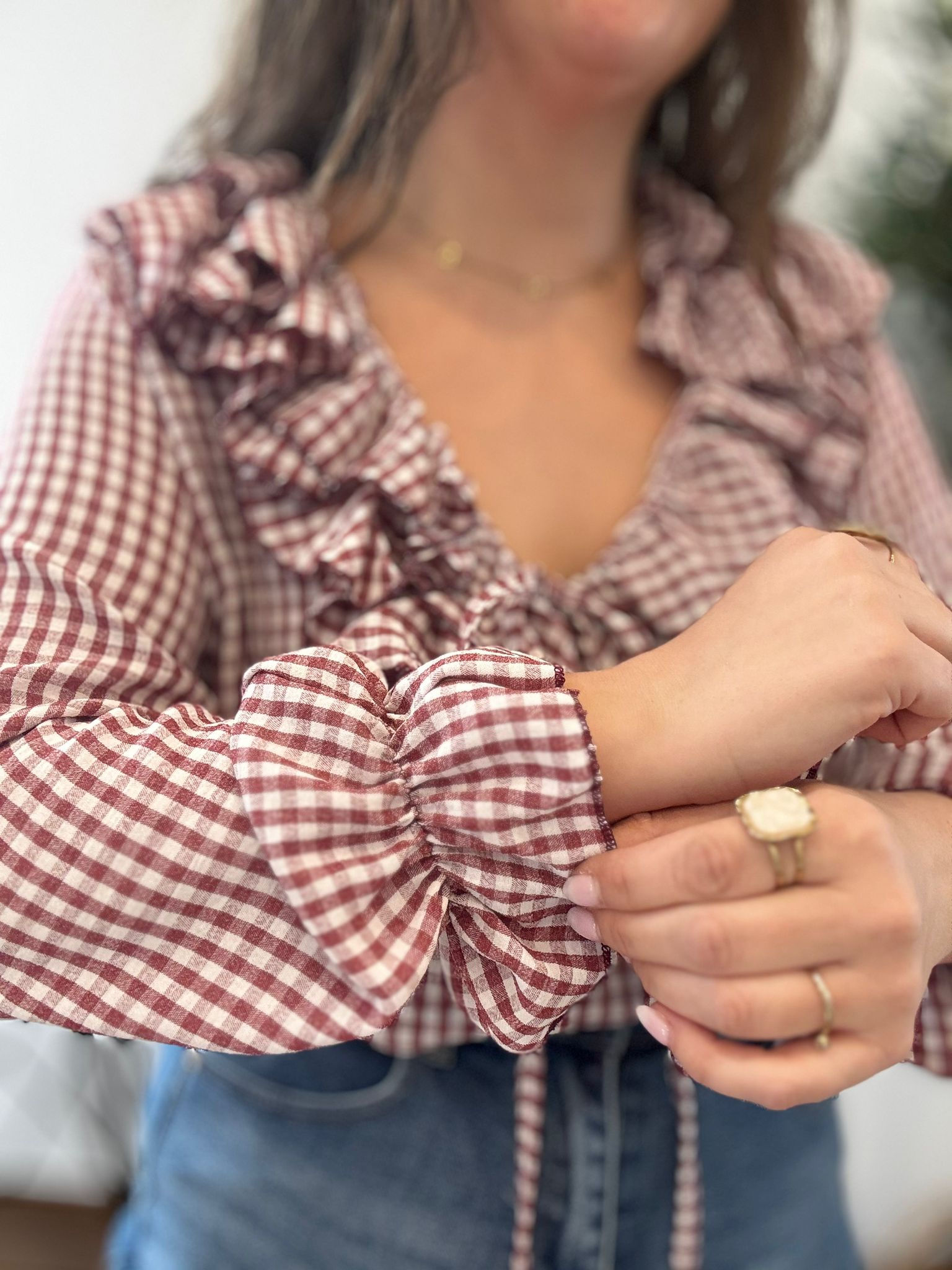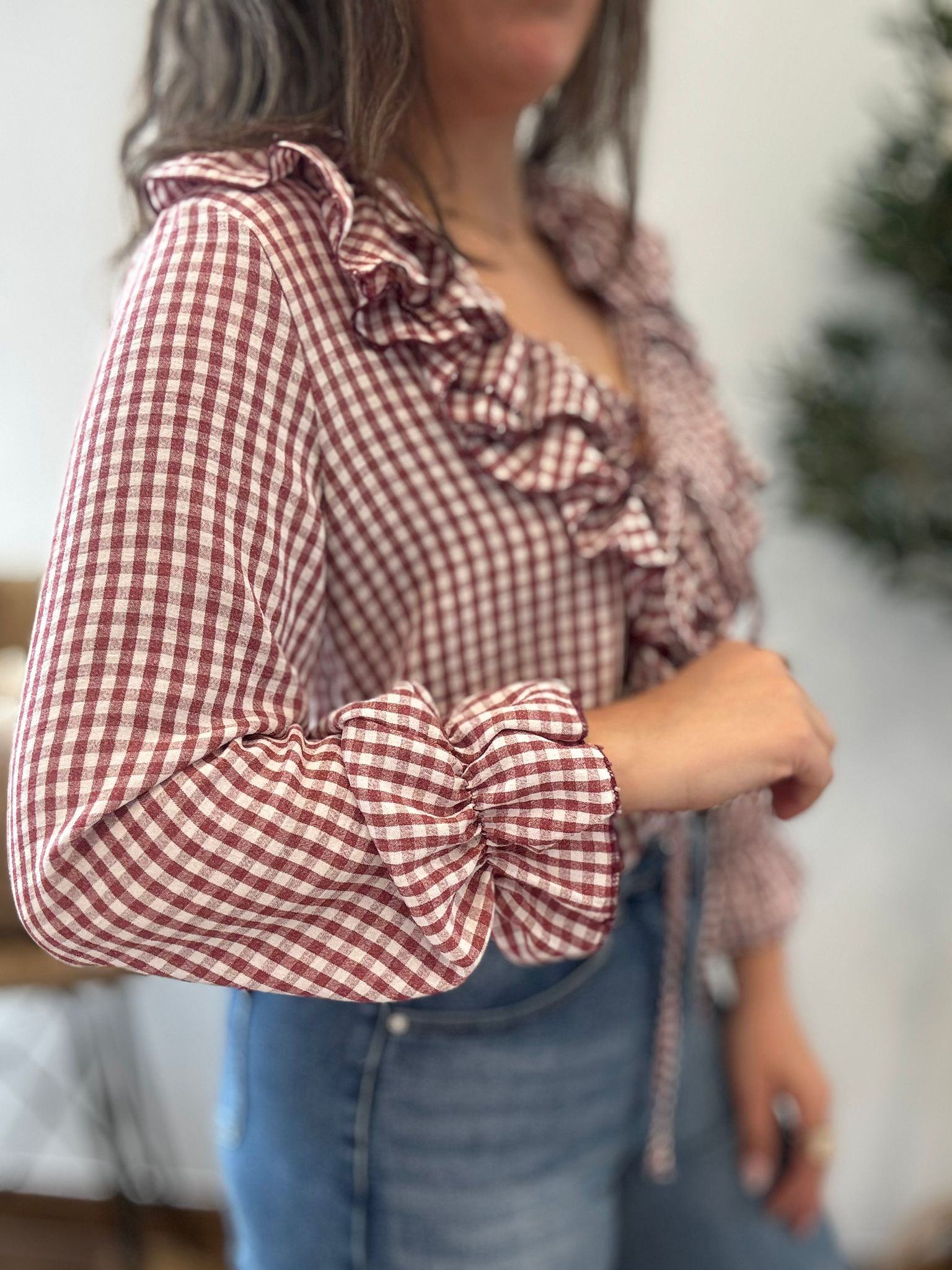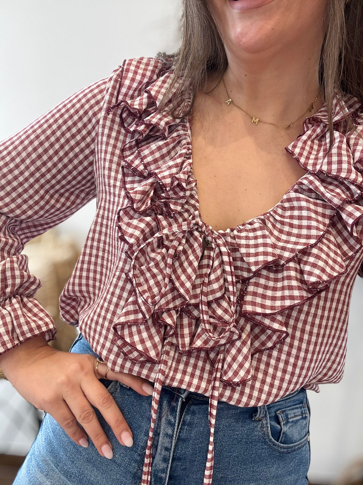 Blusa estampada VICHY con escote en pico, volantes y lazada. Puños engomados. TU RECOMENDADA 36/44. Ana lleva habitualmente talla L/40. Medidas de la blusa: contorno de pecho 110 y largo 59cm