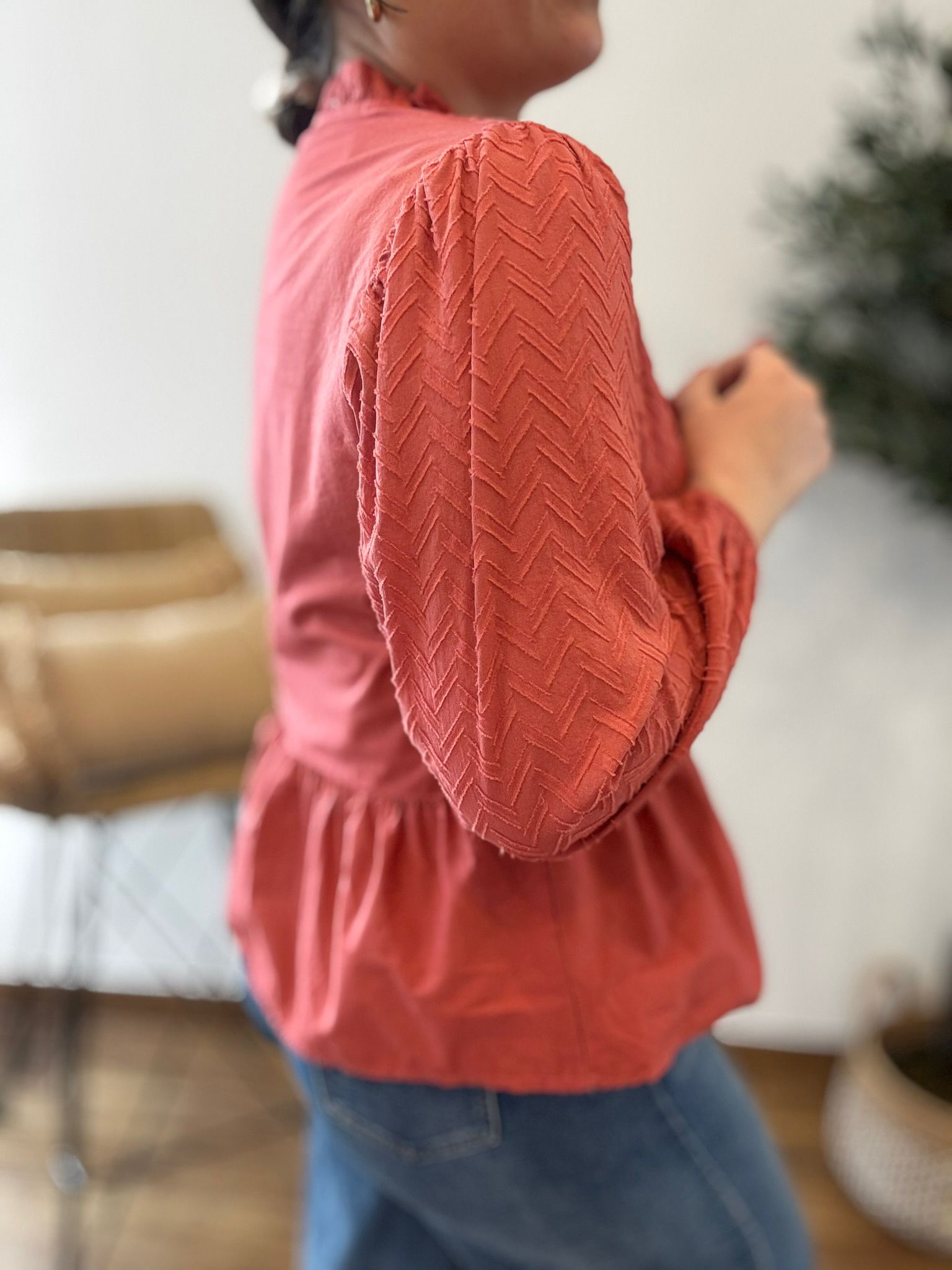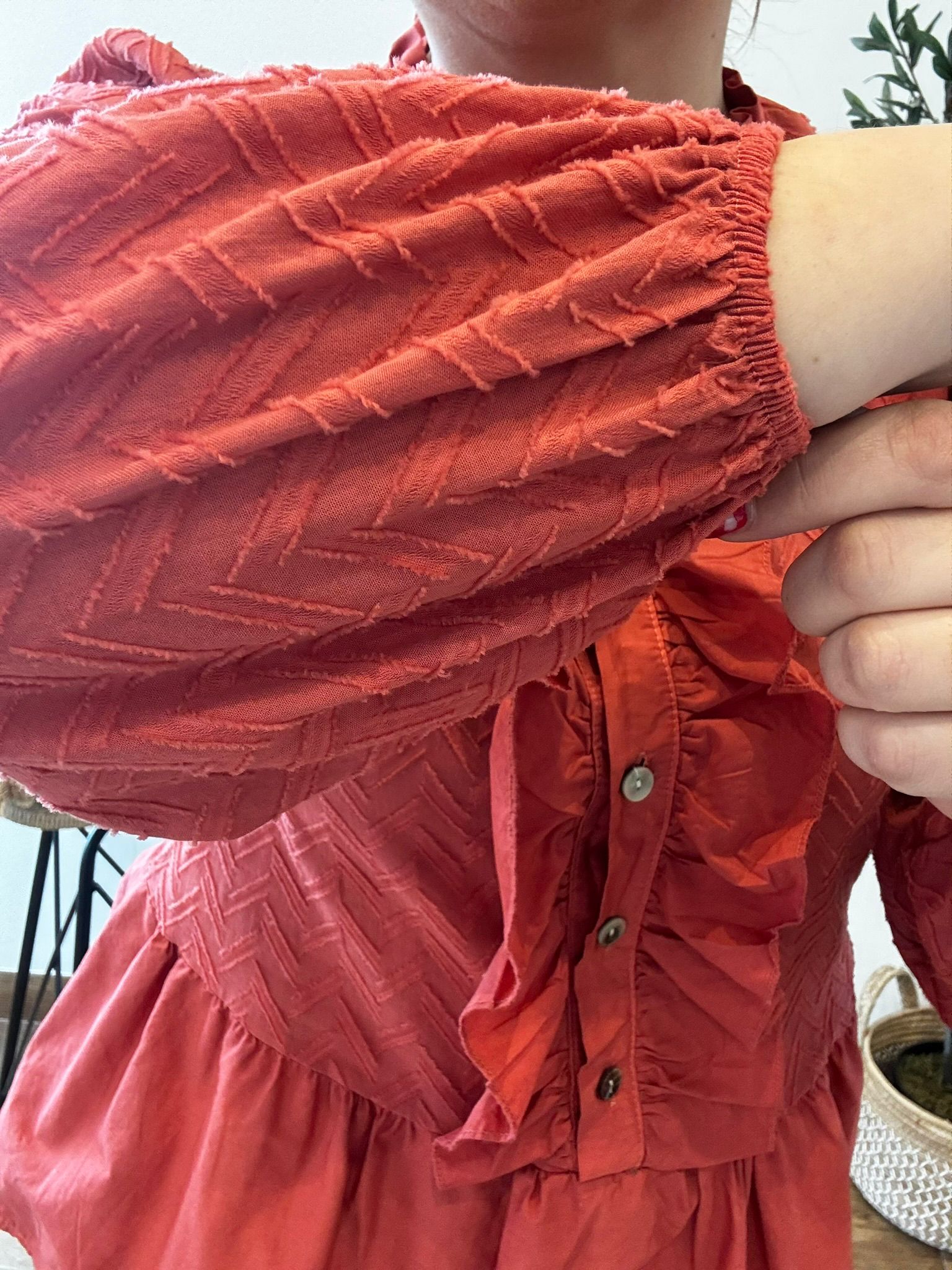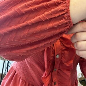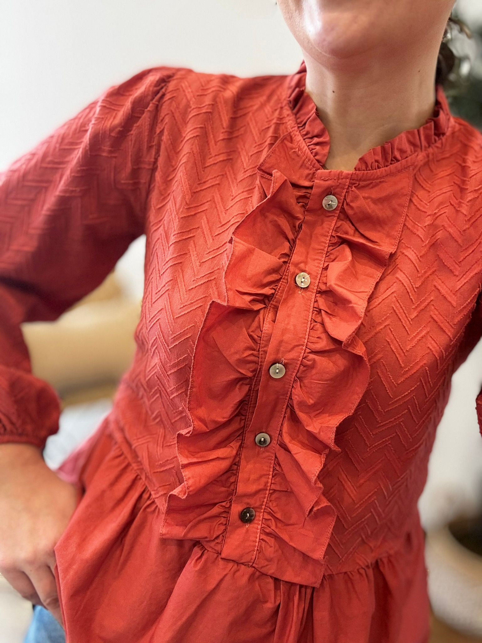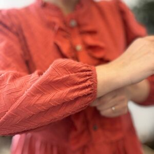 Blusa abotonada con detalle de relieves y volantes. TU RECOMENDADA 36/42. Ana lleva habitualmente talla L/40. Medidas de la blusa: contorno de pecho 100 y largo 63cm