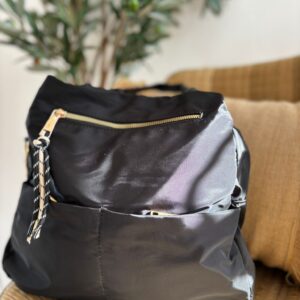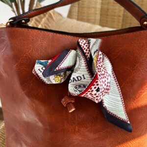 Bolso estampado con detalles en material marrón. Lleva asa larga para colgar regulable. Cierre de cremallera con forro y compartimentos interiores. Medidas aproximadas 18×31 cm