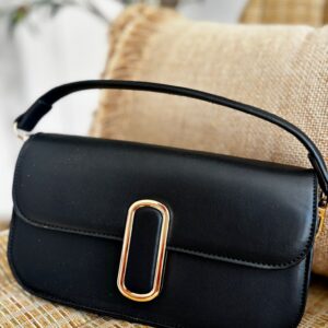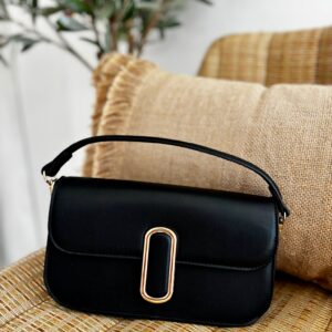 Bolso negro con detalle de aplique en dorado. Cierre imantado y de cremallera. Tiene compartimentos interiores y asa de cadena dorada para colgar. Medidas aproximadas 23×14