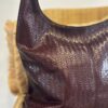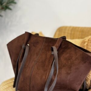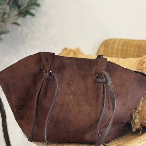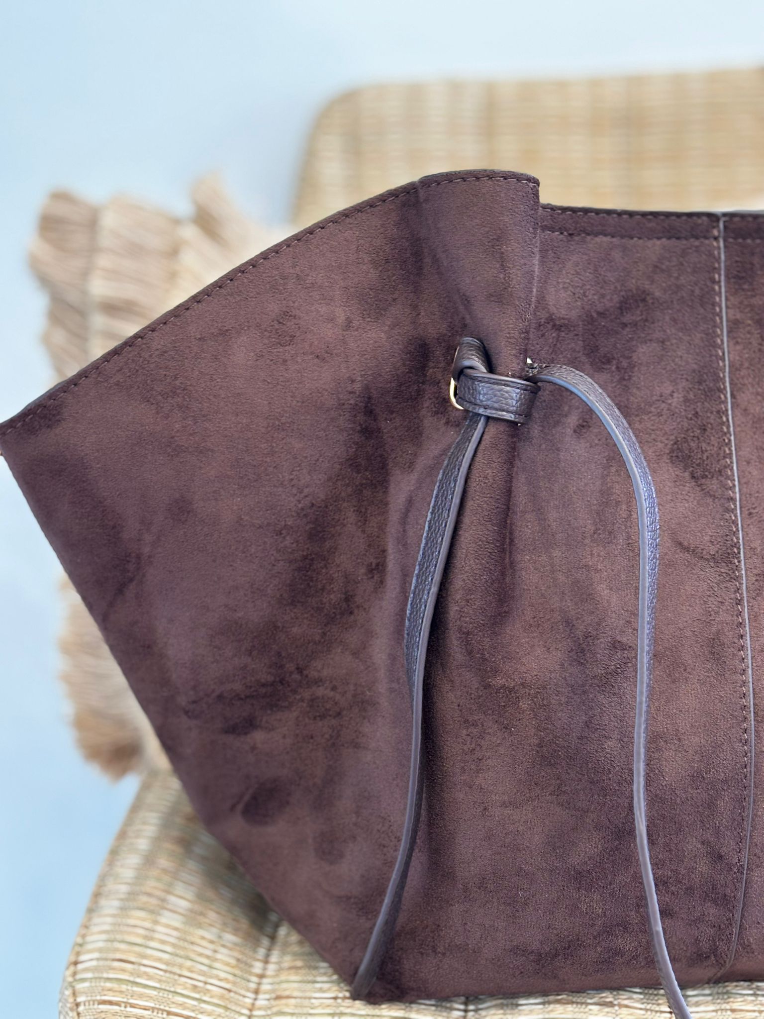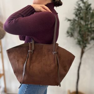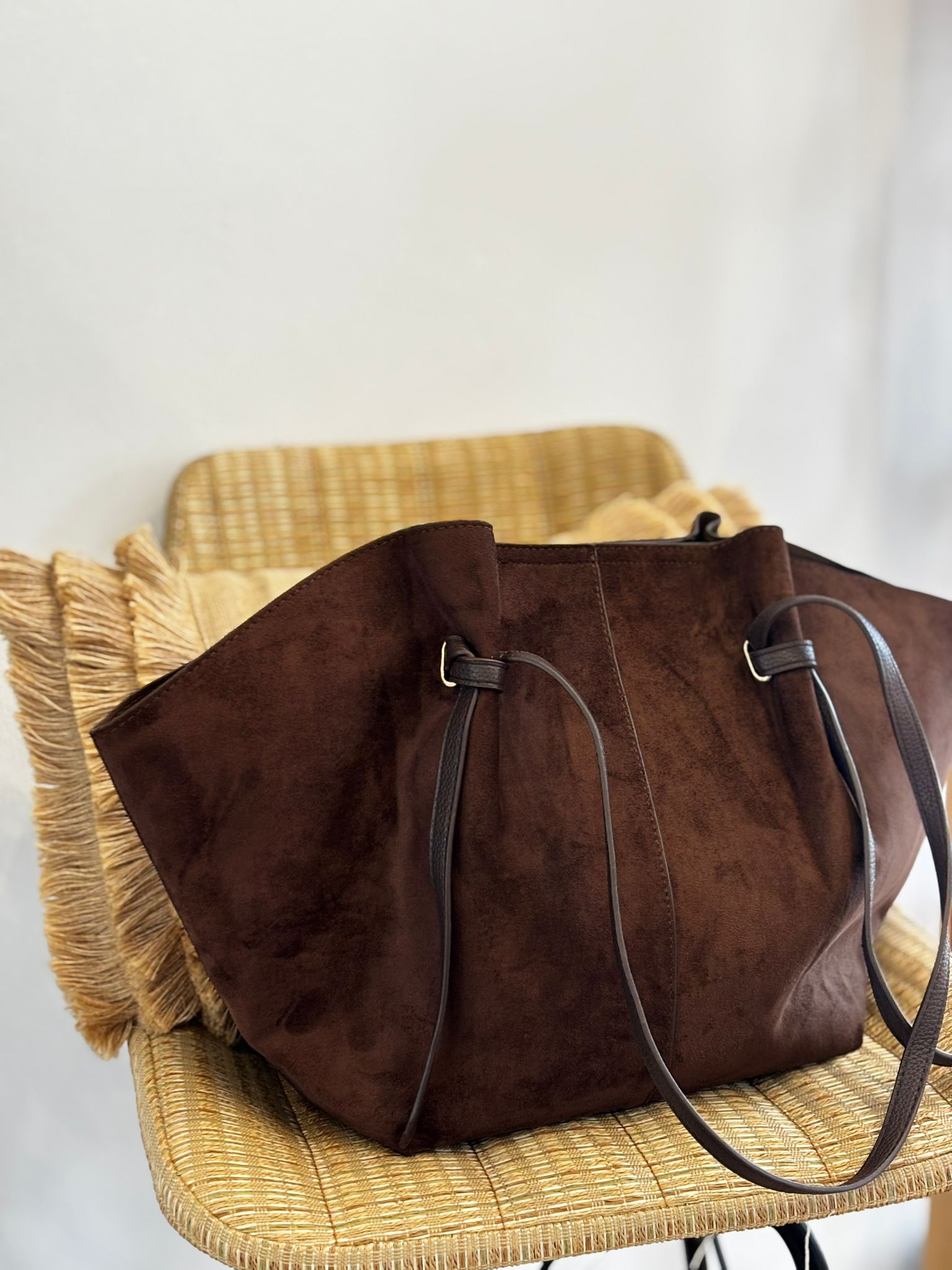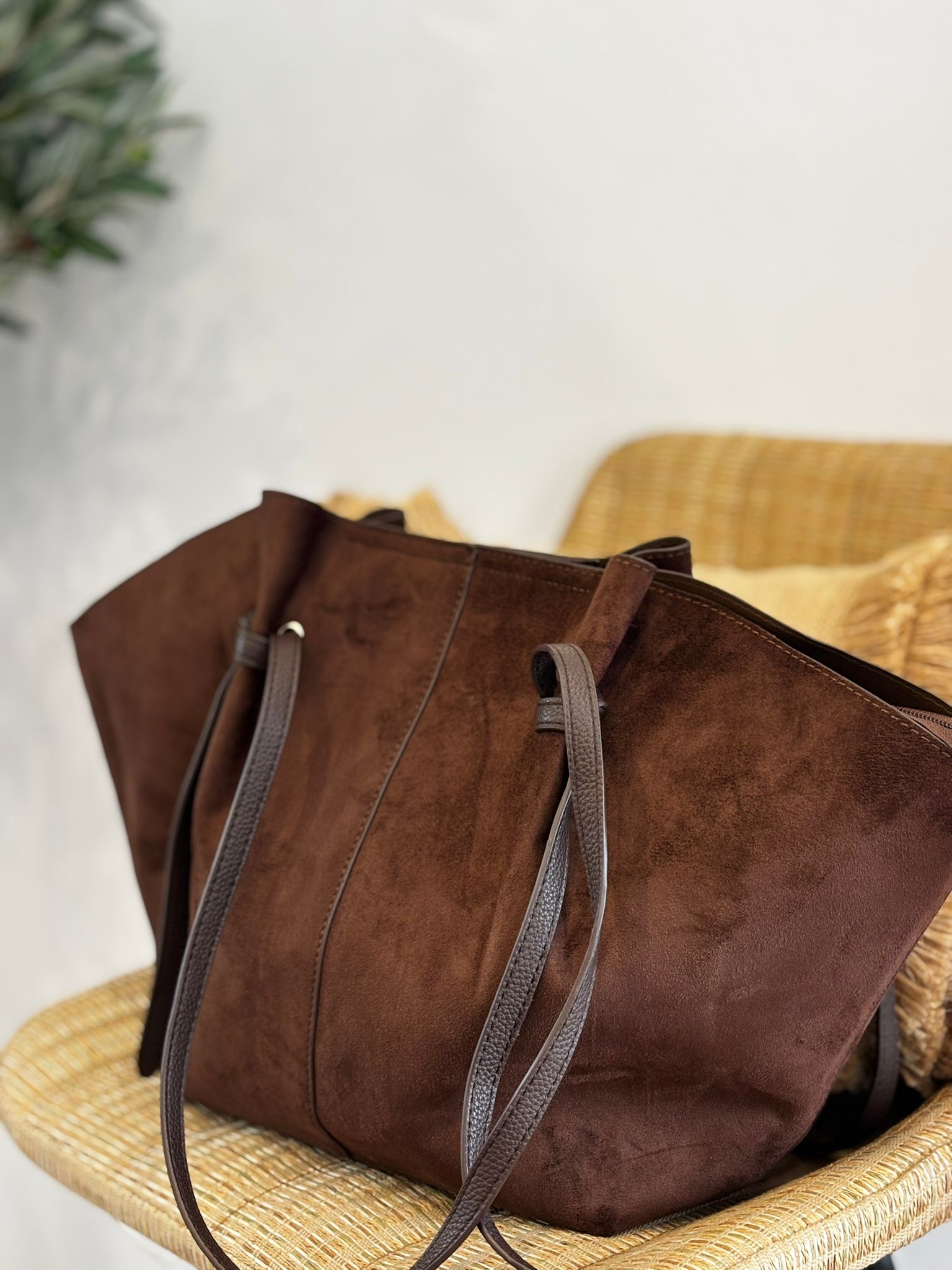 Maxi shopper de antelina en color chocolate y calidad premium. Tiene cierre de cremallera y dentro lleva otro bolsito pequeño de polipiel con asa larga para colgar