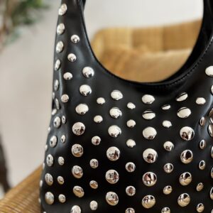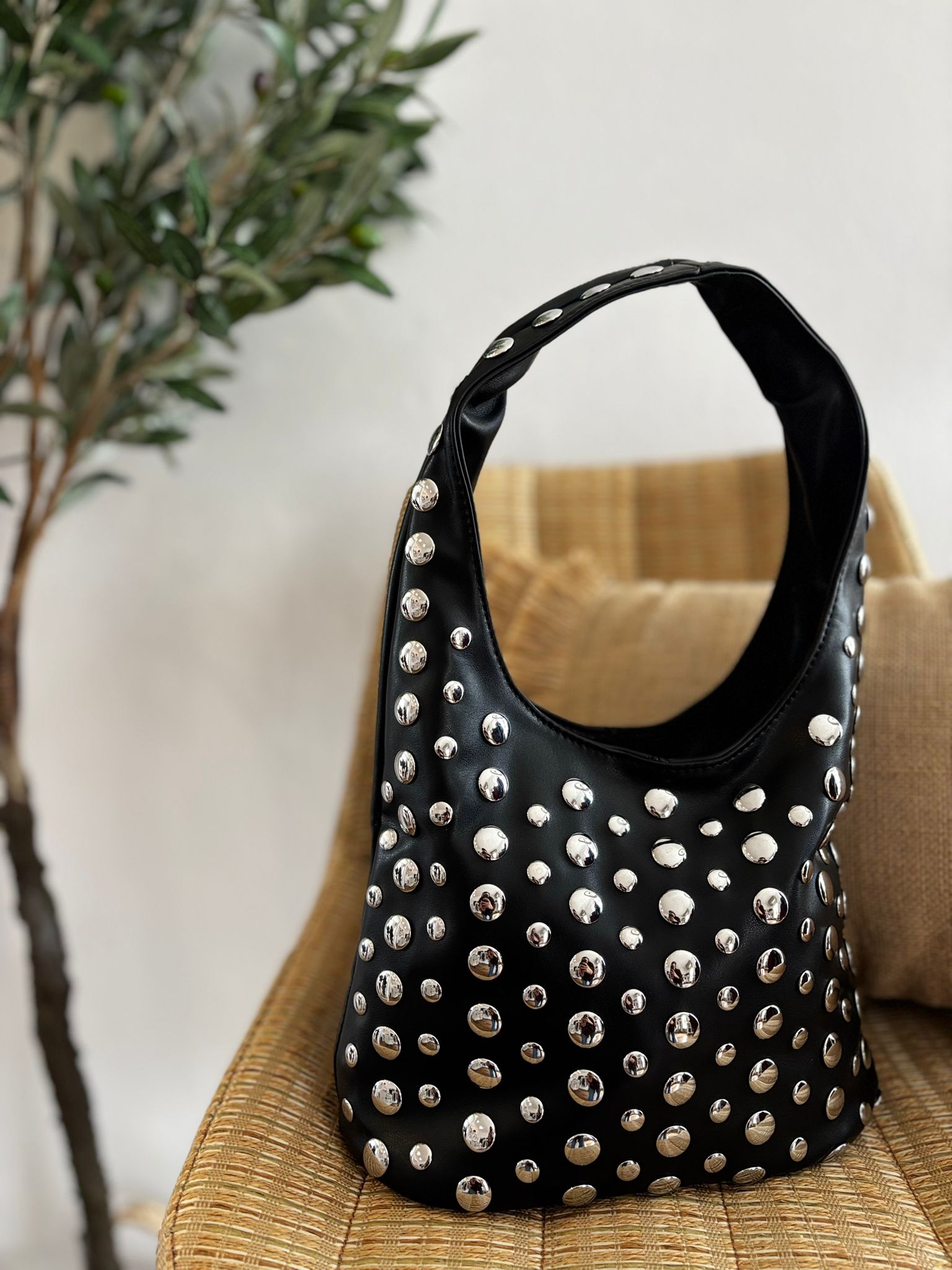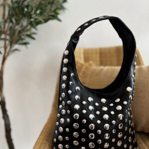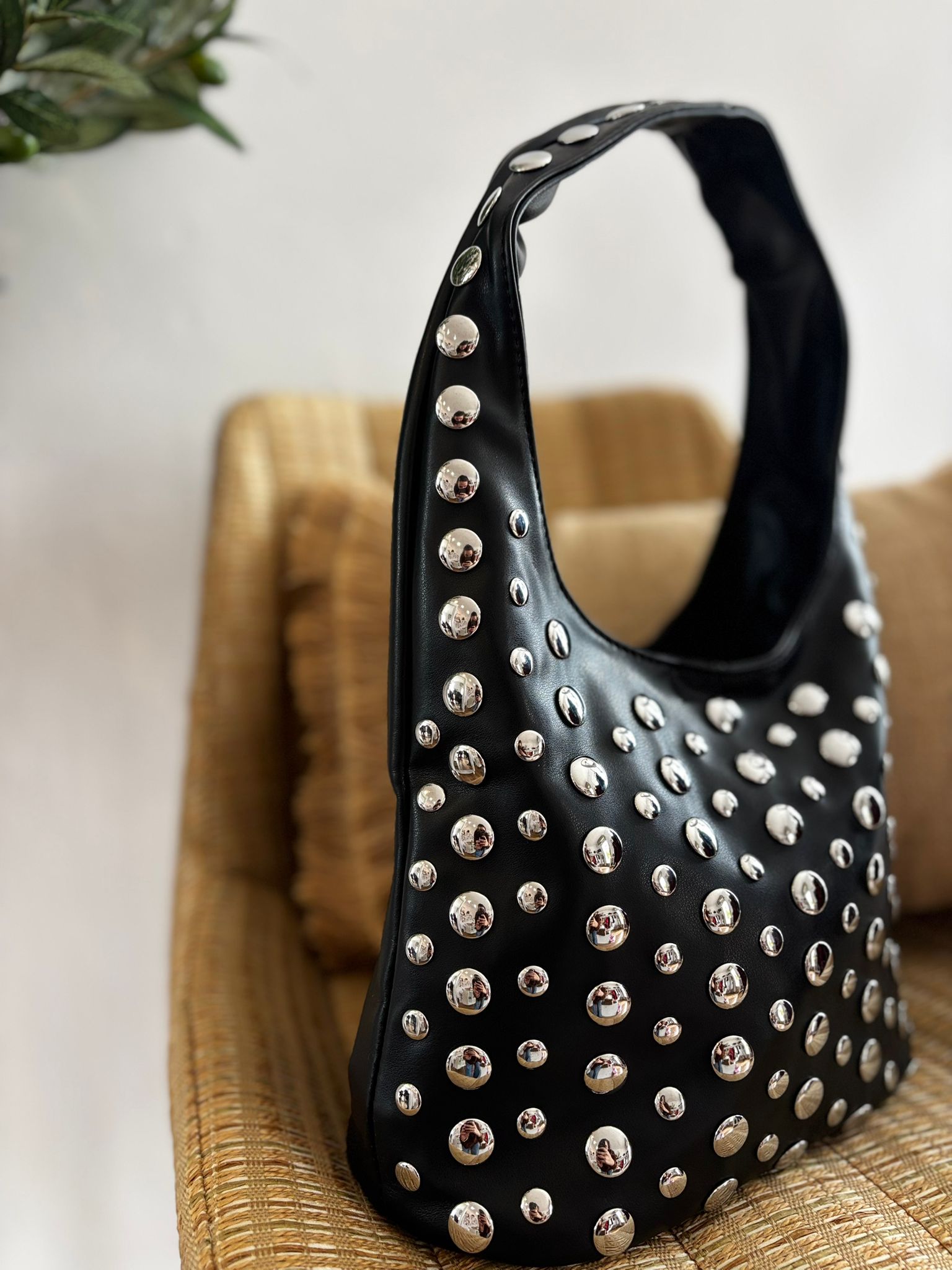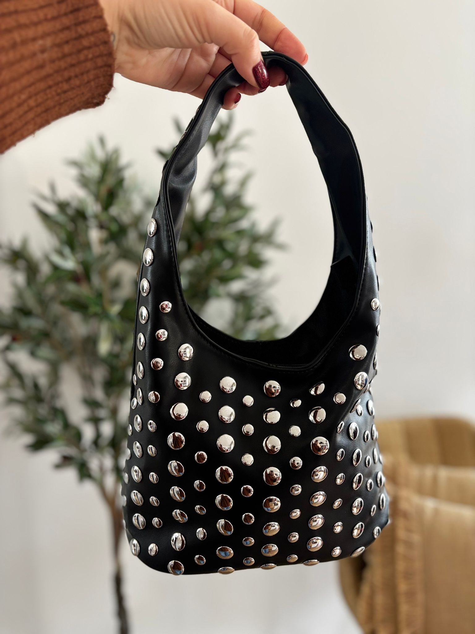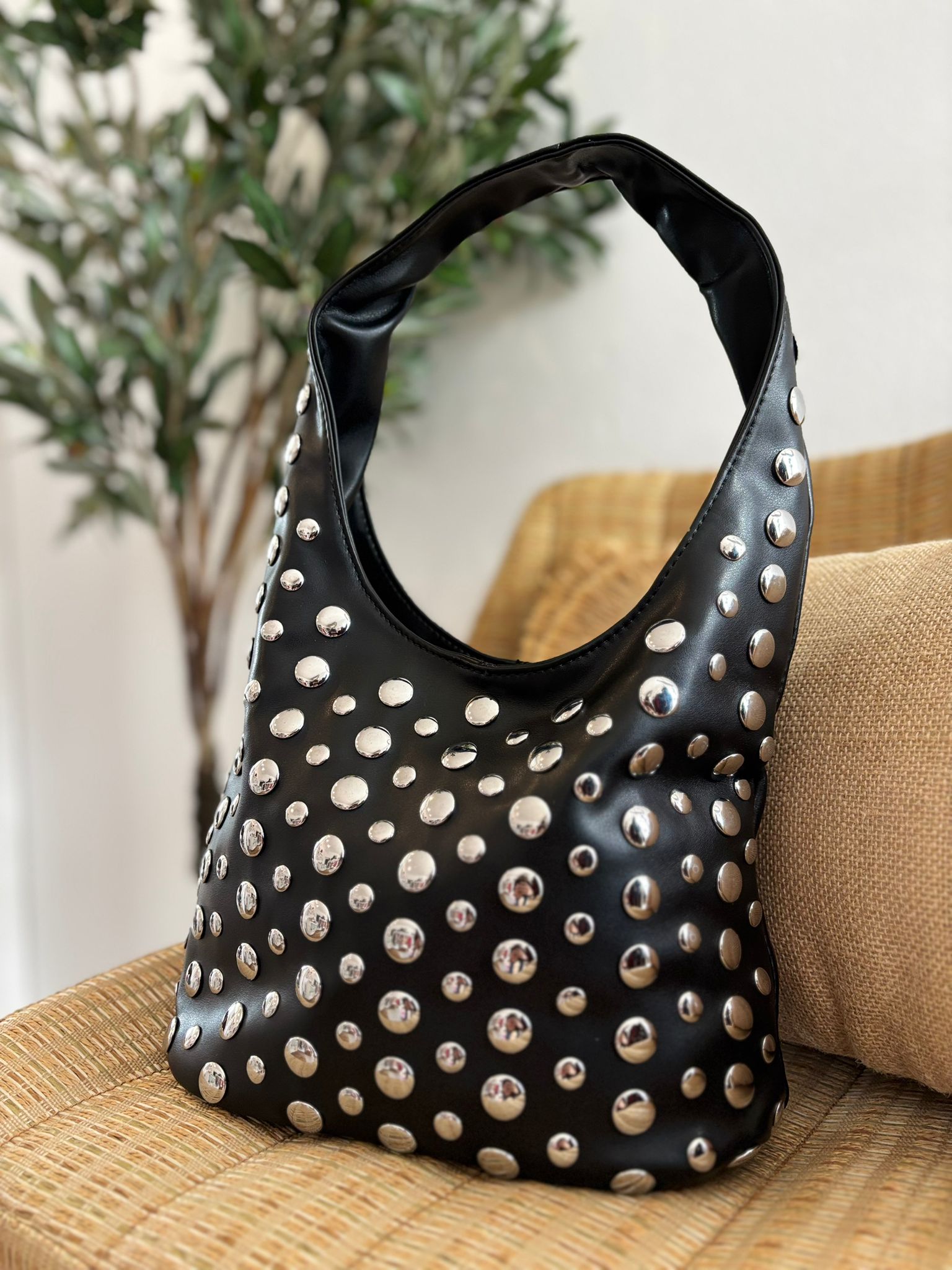 Bolso inspiración piel con tachuelas plateadas. Cierre con cremallera. Medidas recomendadas 42×30