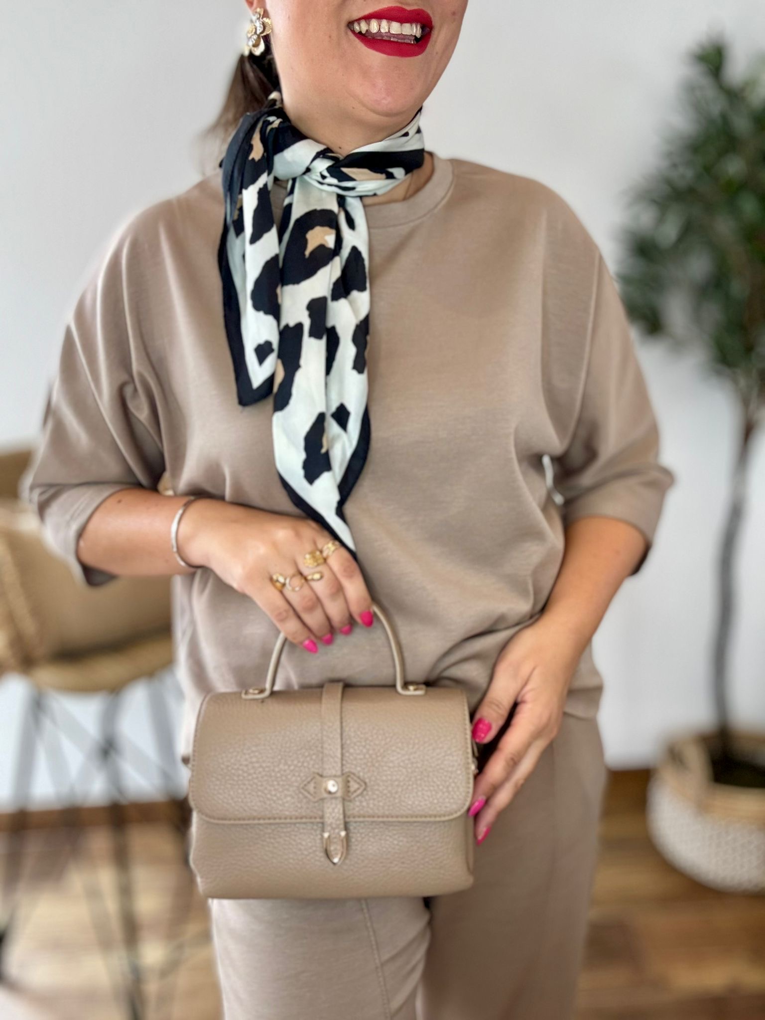 Bolso con cierre imantado y de cremallera. Lleva asa larga para colgar. Medidas aproximadas 24×17