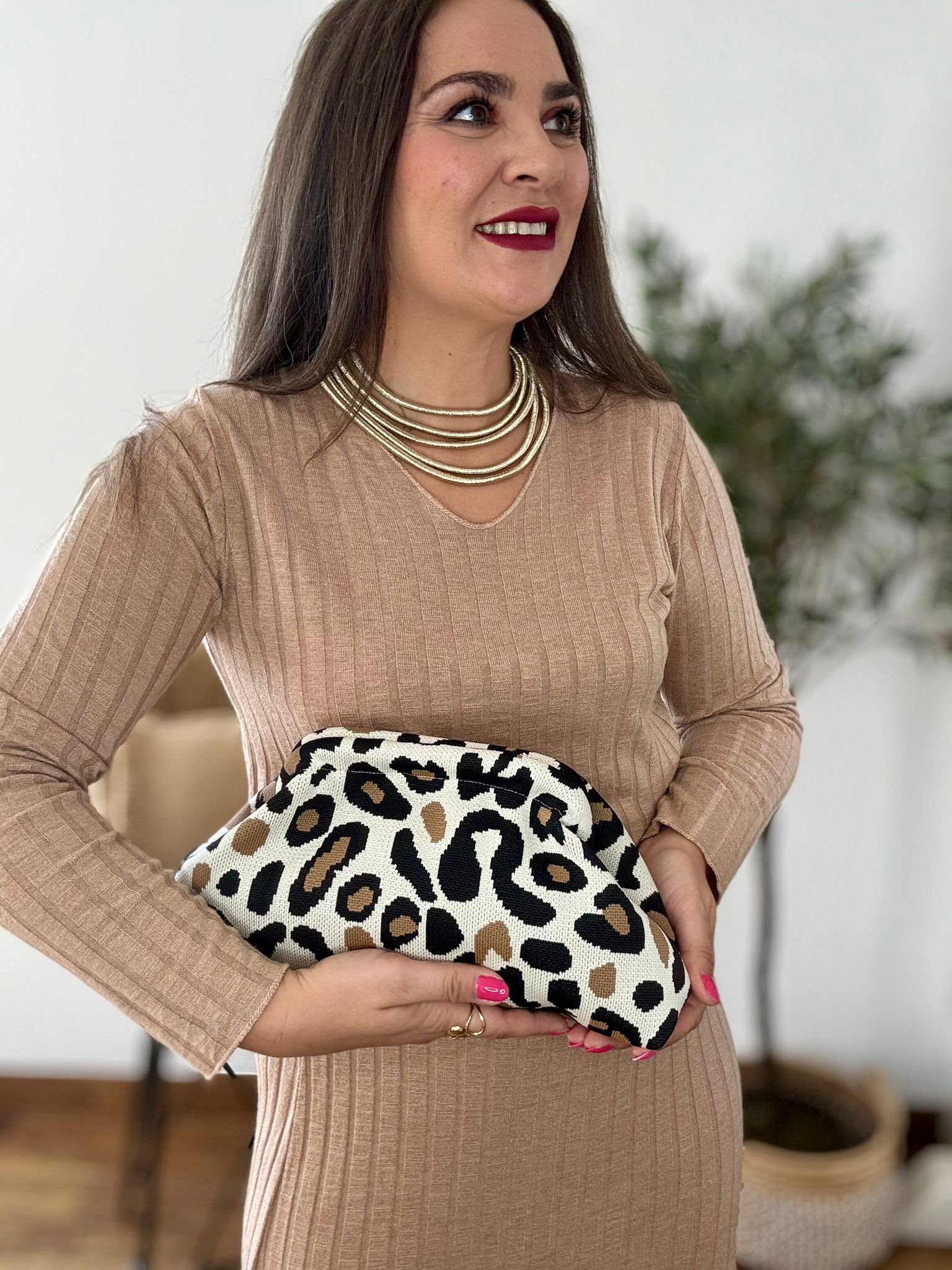 Bolso tejido. Cierre imantado. Lleva asa larga para colgar en color dorado. Medidas aproximadas 36×20