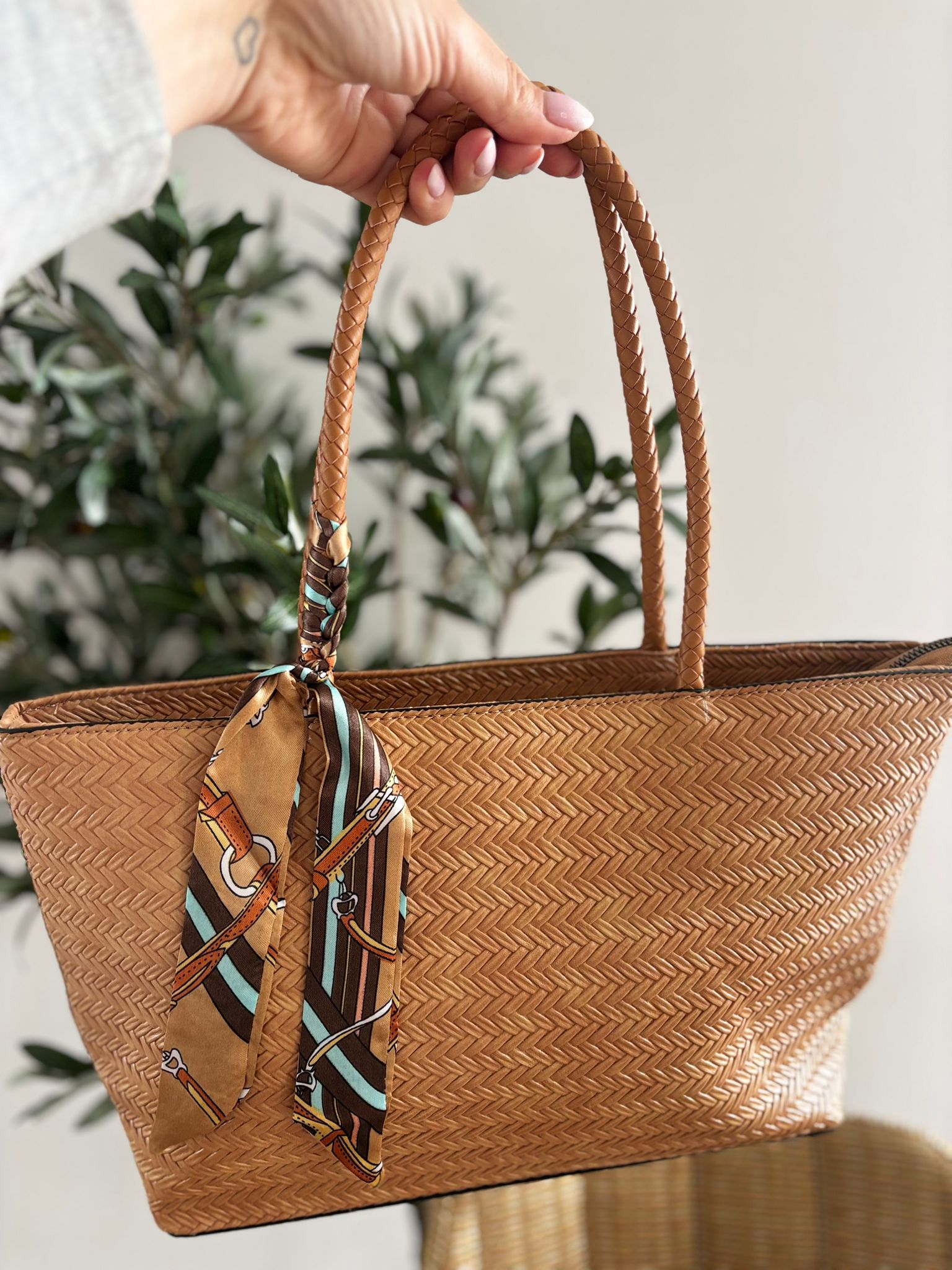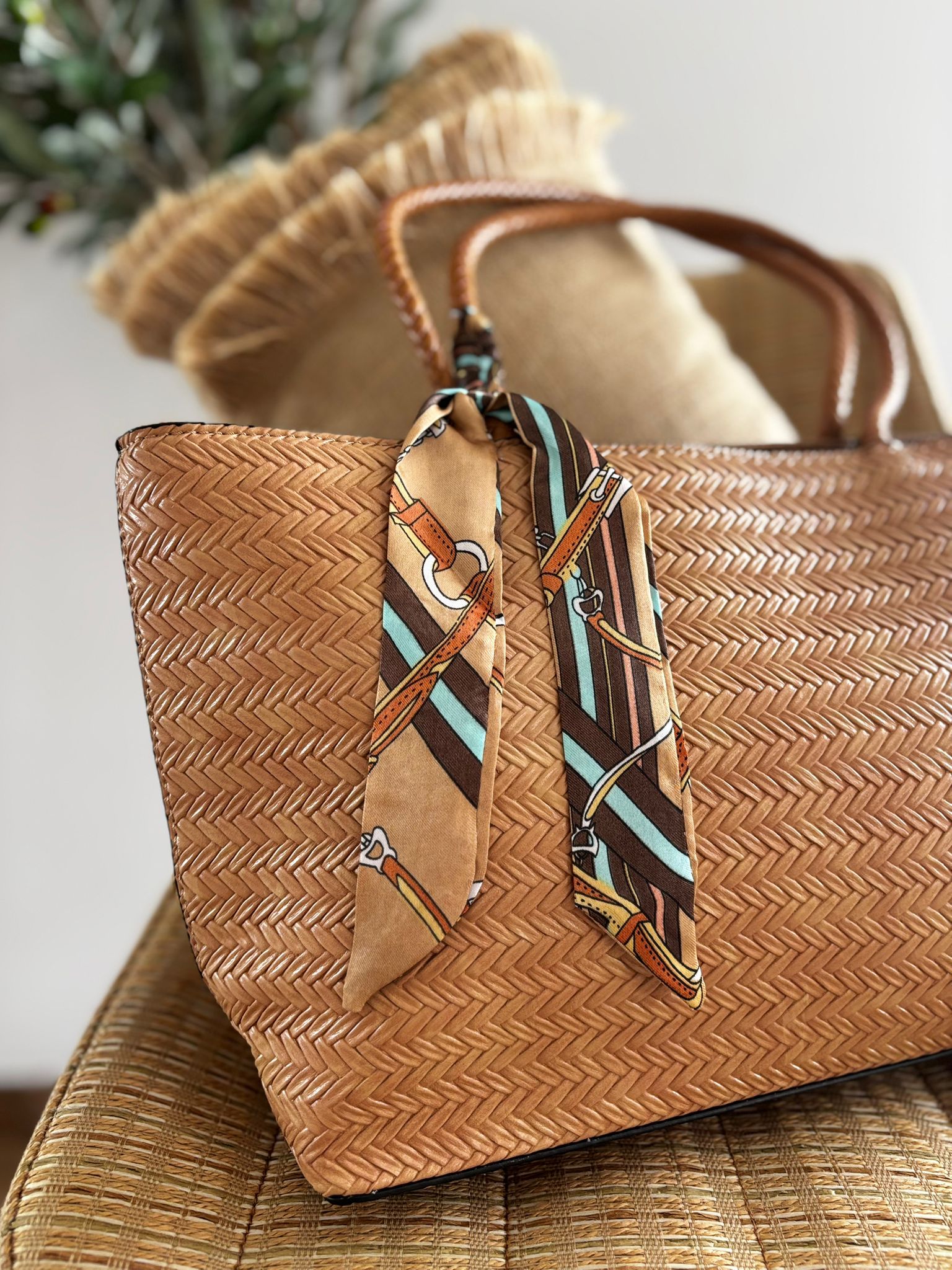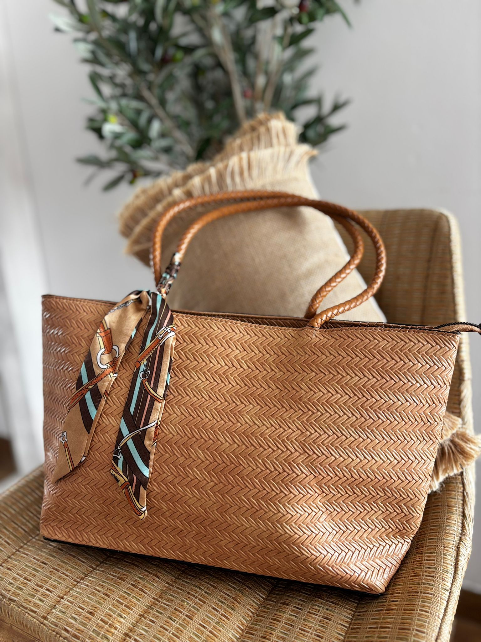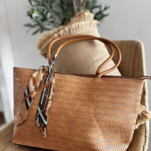 Bolso trenzado en polipiel con detalle de pañuelo que se puede quitar. Cierre de cremallera y compartimentos interiores y exterior. Medidas aproximadas 44x25cm
