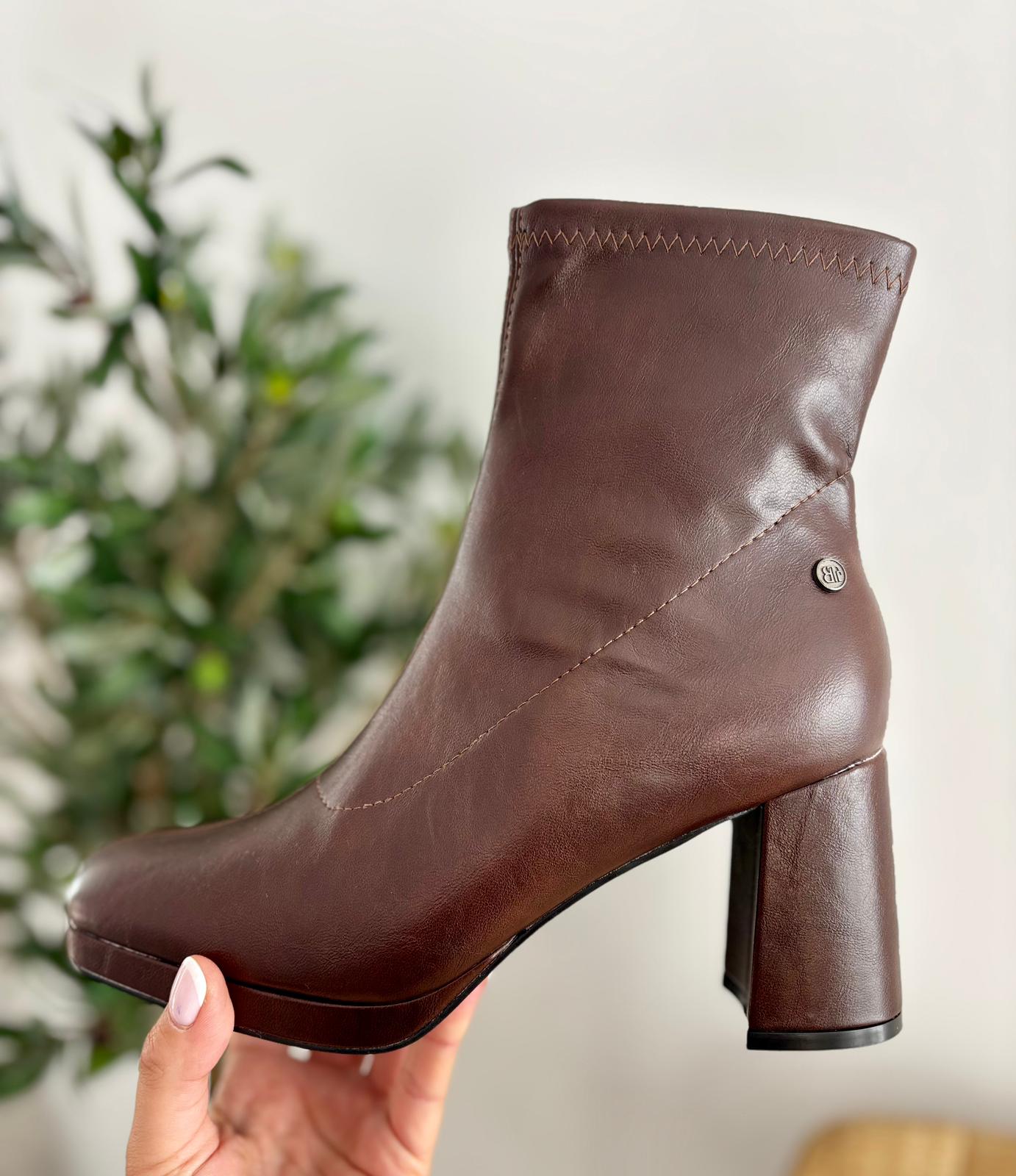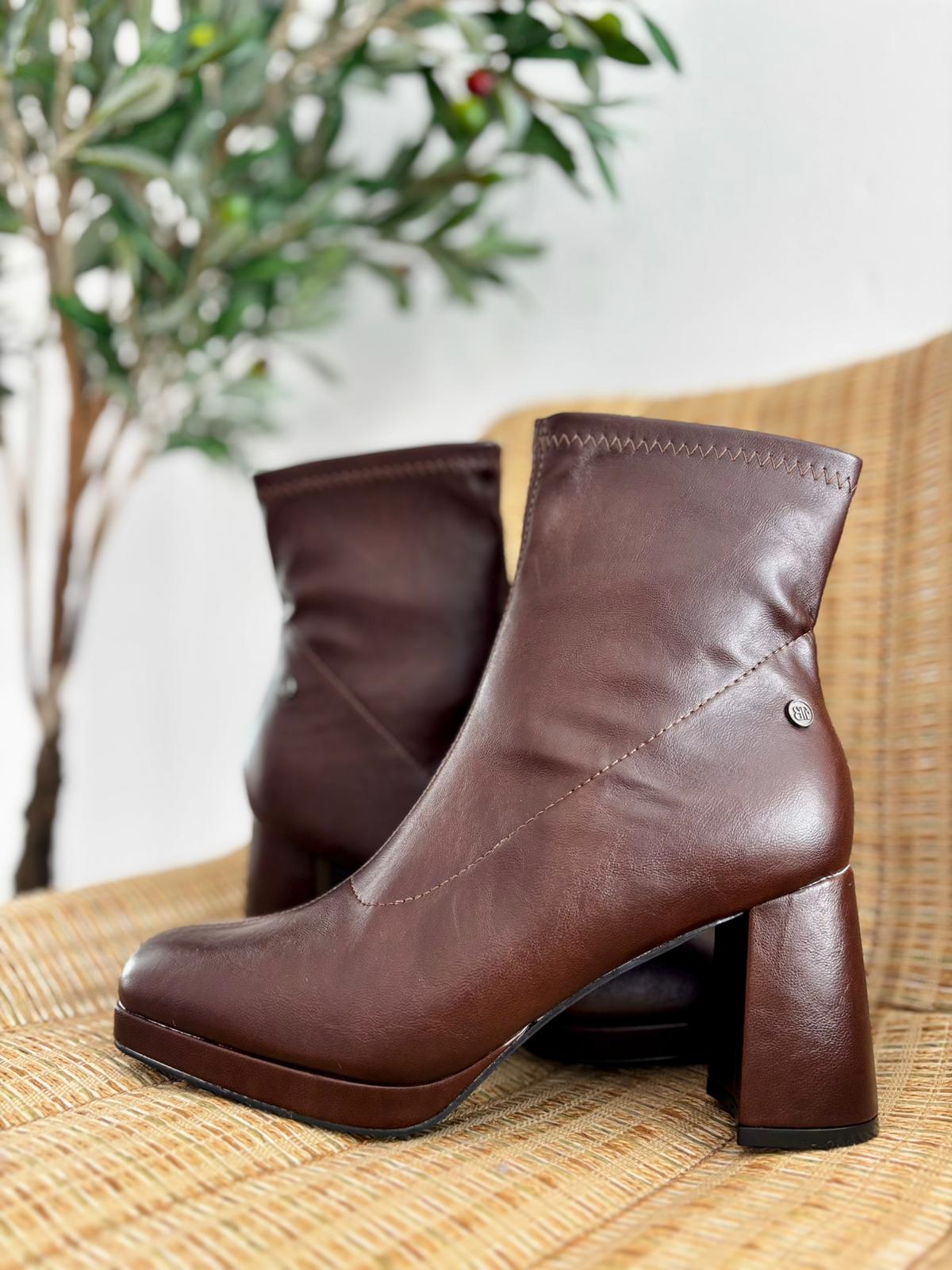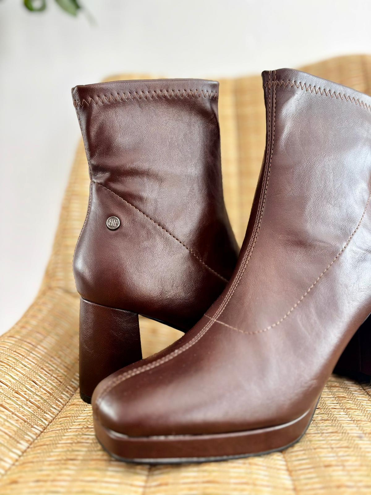 Botines de material con cremallera interior y tacón gordito. Tienen plataforma y punta redondeada para máxima comodidad. TALLAN A SU NÚMERO. Altura del tacón 8cm plataforma 1cm