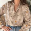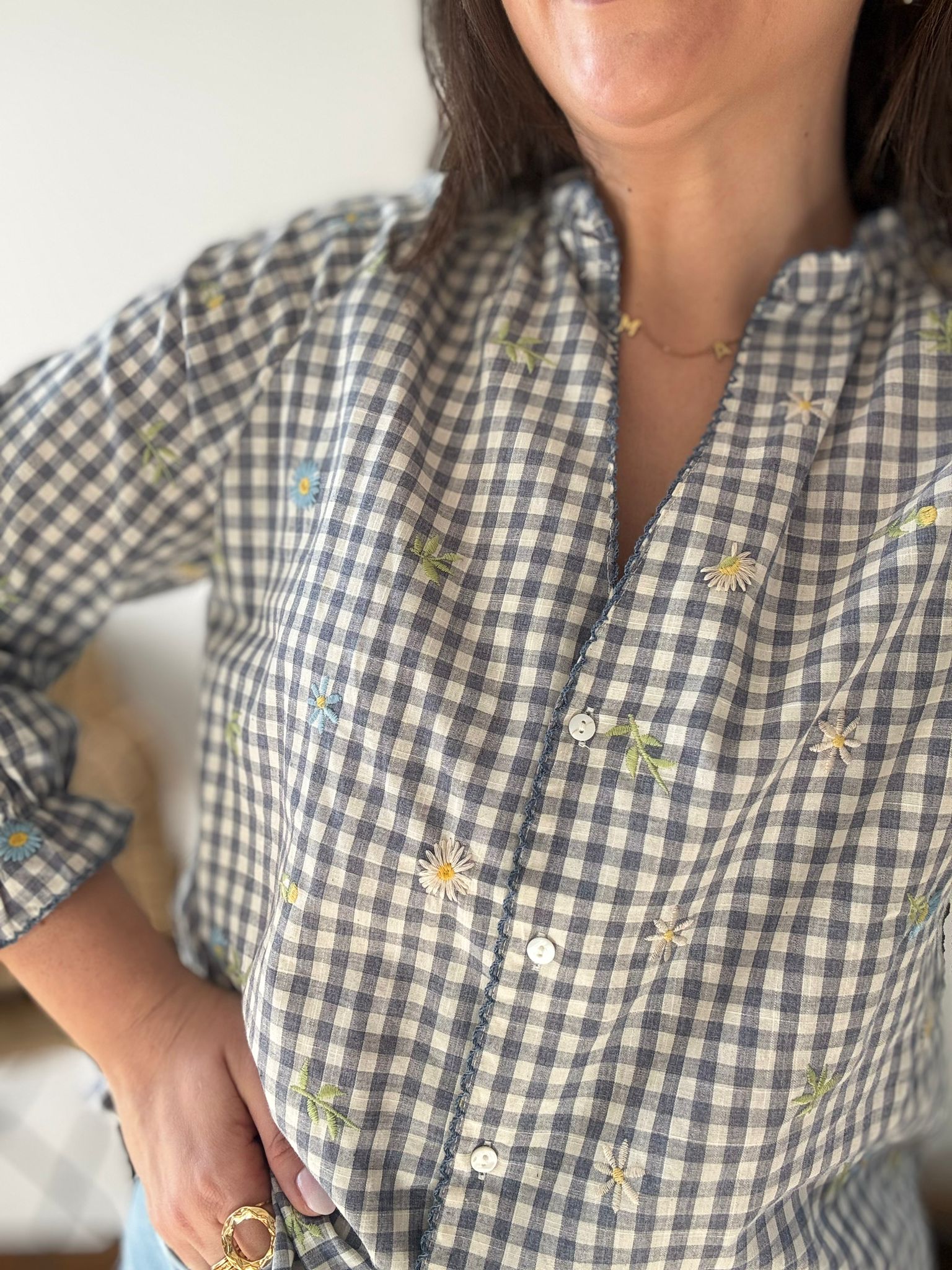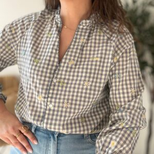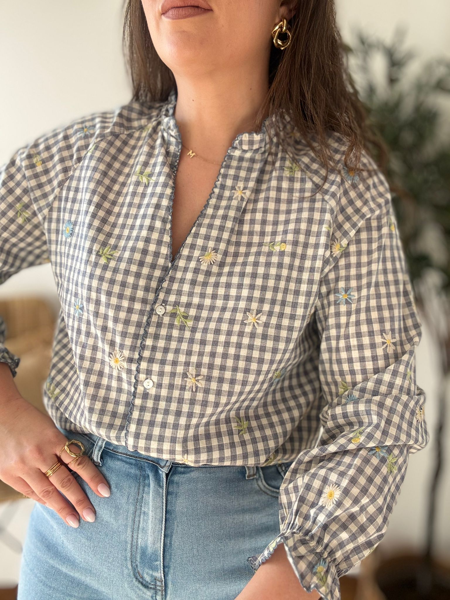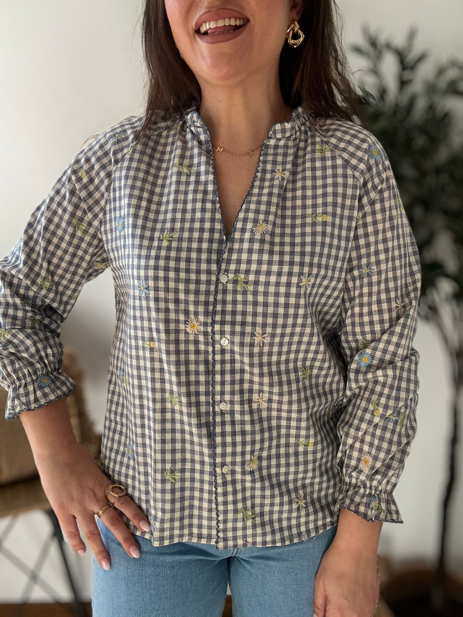 Camisa de cuadros VICHY con detalle de flores bordadas y cuello ribeteado con blonda. Puño elástico con volantito. Ana lleva habitualmente talla L/40 y de este modelo ha escogido para fotos la TALLA L. Medidas de contorno de pecho por tallas: S 108, M 110 y L 112cm