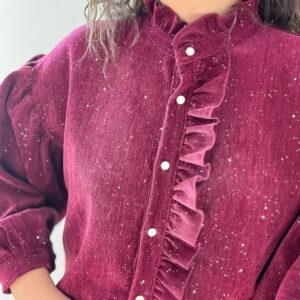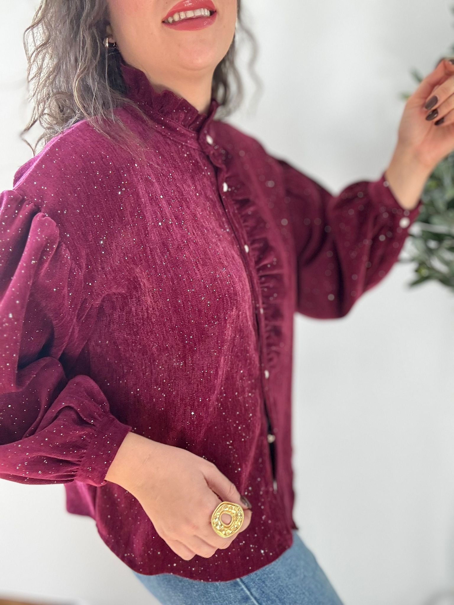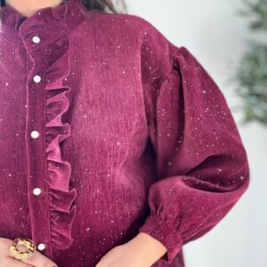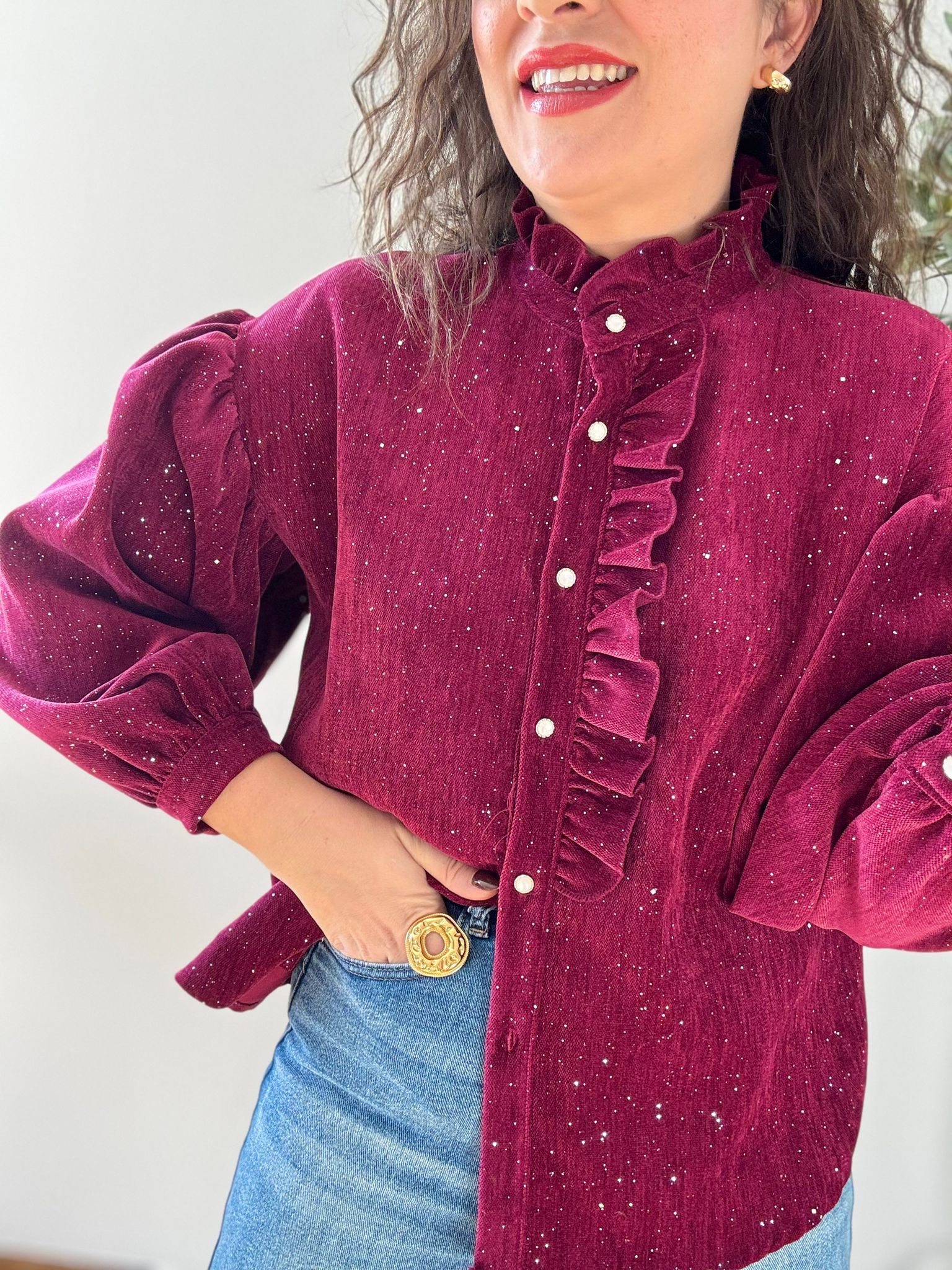 Camisa de tejido grueso con detalles de chispita en brillo plateado. Tienen mangas abullonadas y volantes en el pecho. Botones tipo perlas. TU RECOMENDADA 36/44. Ana lleva habitualmente talla 40/42. Medidas de la camisa: contorno de pecho 120 y largo 65cm