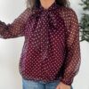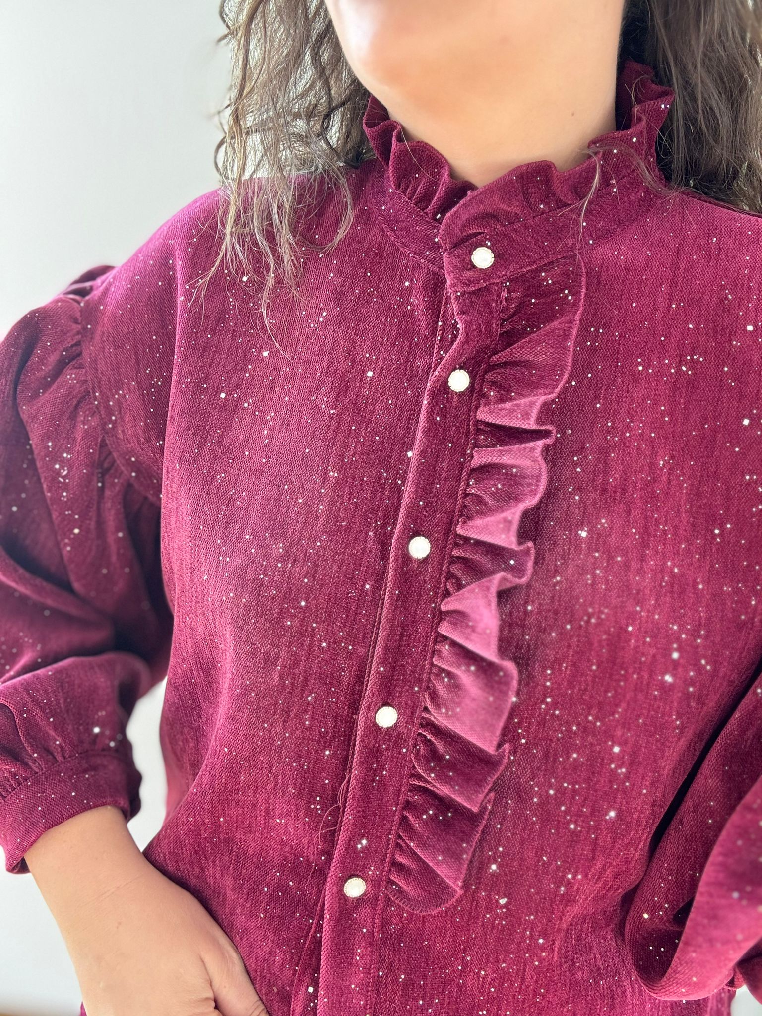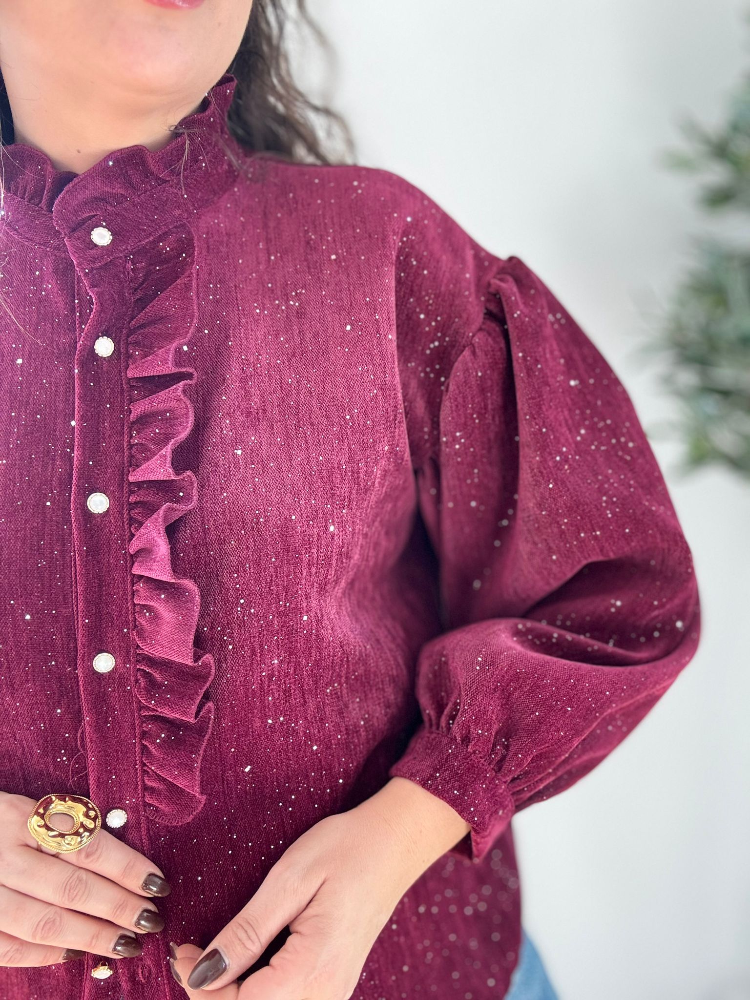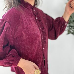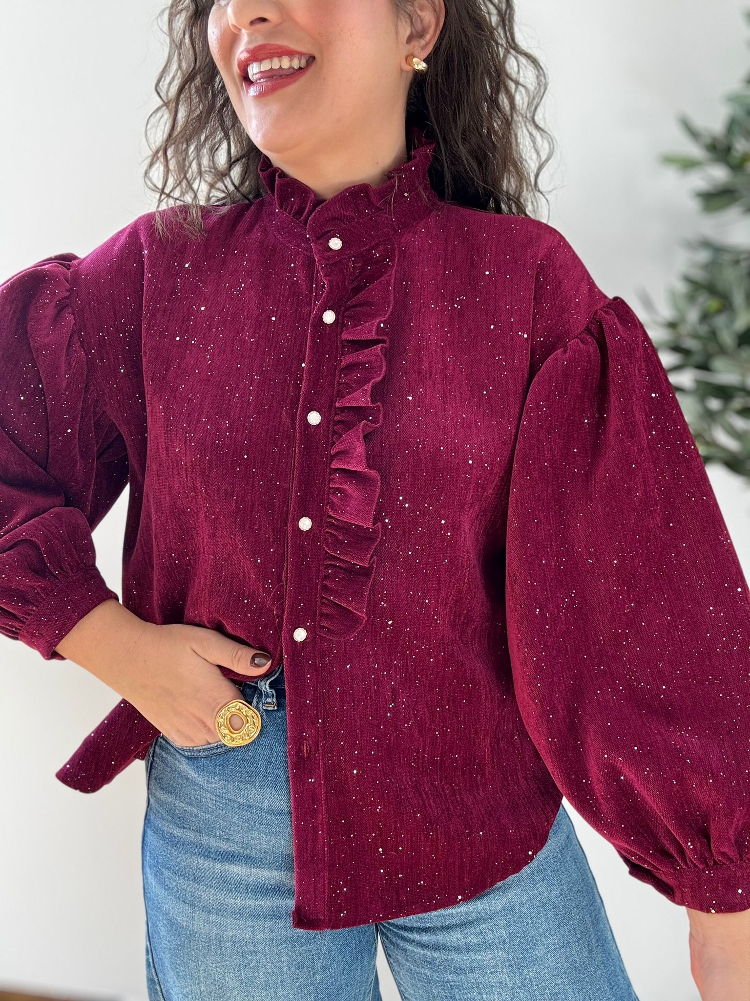 Camisa de tejido grueso con detalles de chispita en brillo plateado. Tienen mangas abullonadas y volantes en el pecho. Botones tipo perlas. TU RECOMENDADA 36/44. Ana lleva habitualmente talla 40/42. Medidas de la camisa: contorno de pecho 120 y largo 65cm