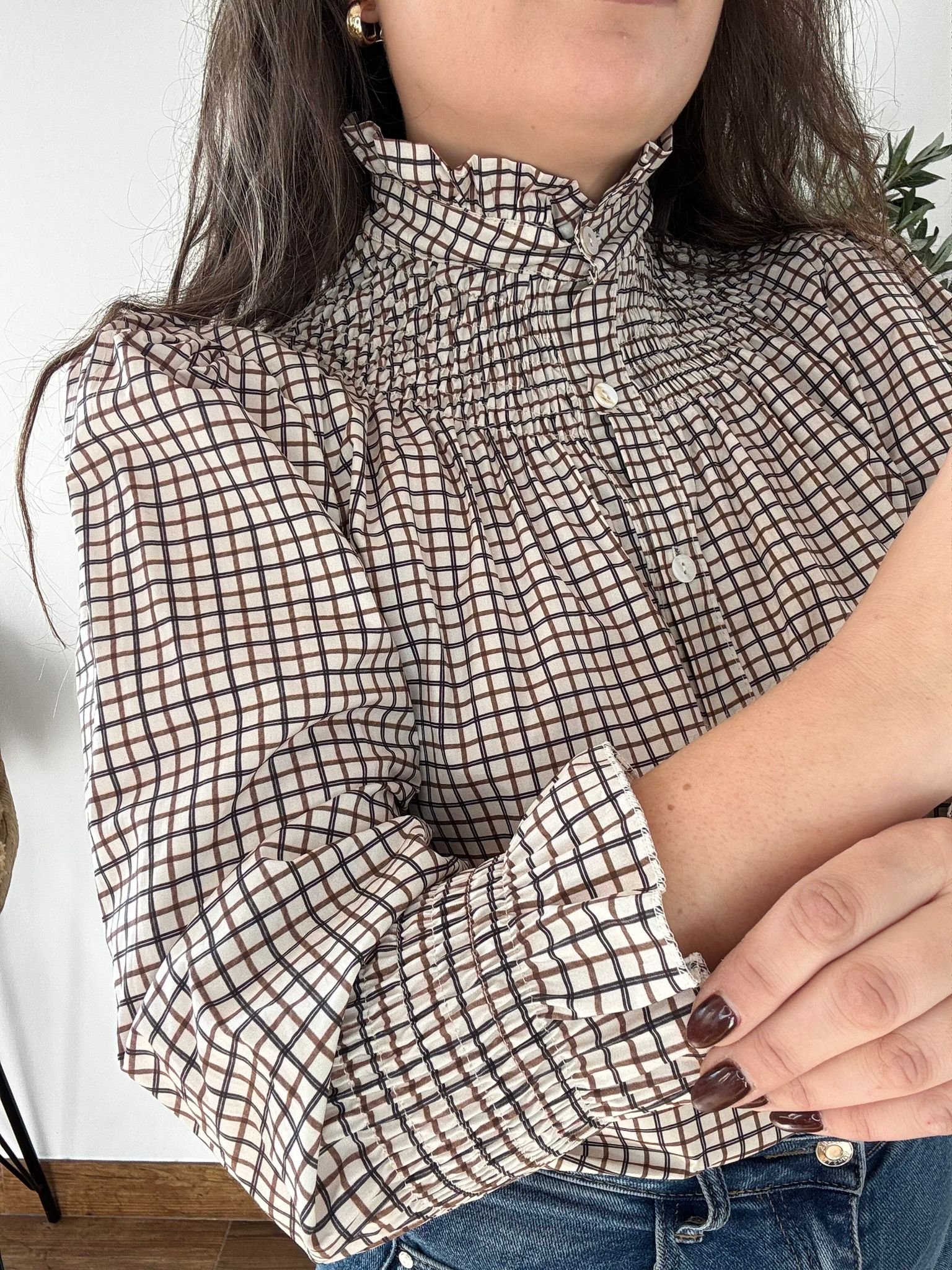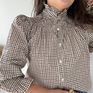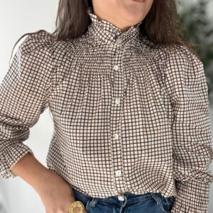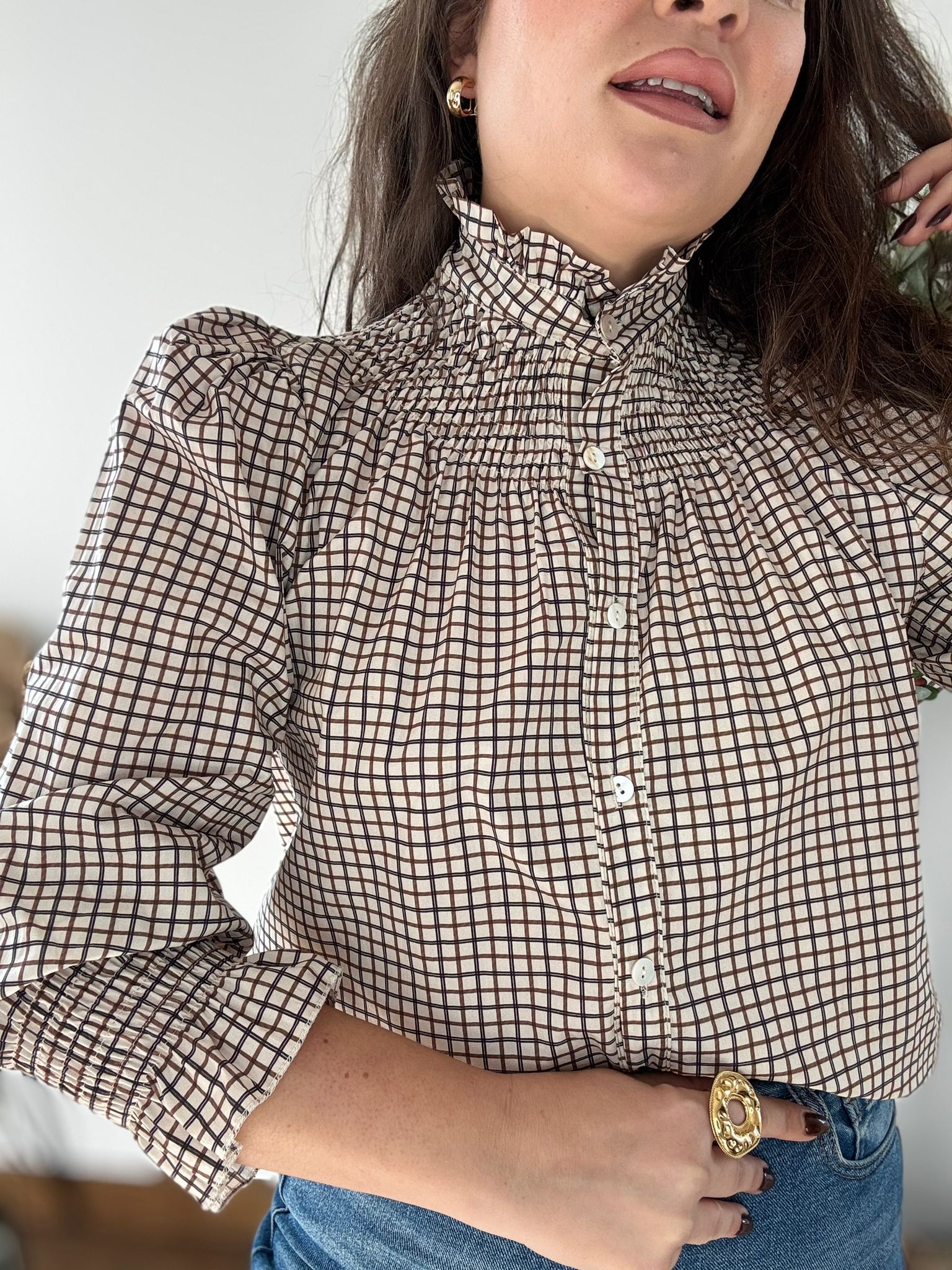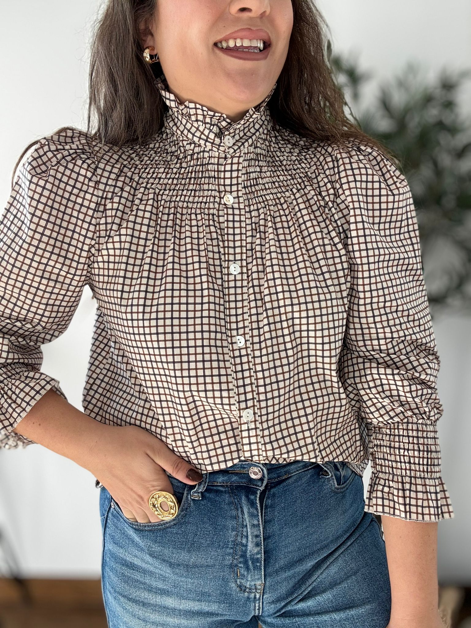 Camisa con cuello y puños engomados. TU RECOMENDADA 36/42. Ana lleva habitualmente talla 40/42. Medidas de la camisa: contorno de pecho 112, cadera 120 y largo 60cm