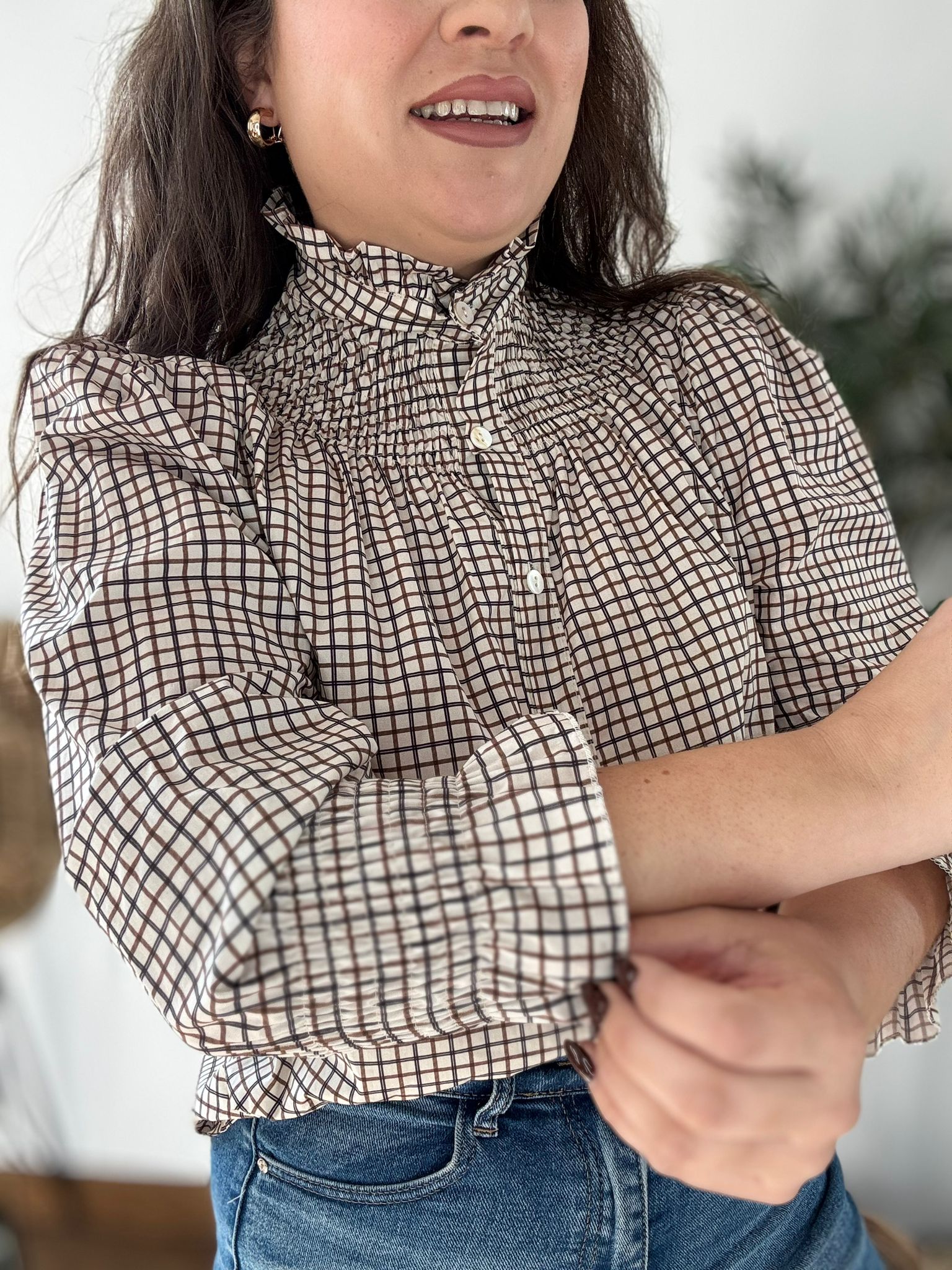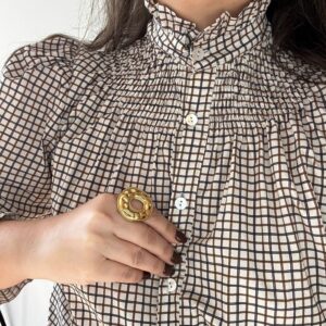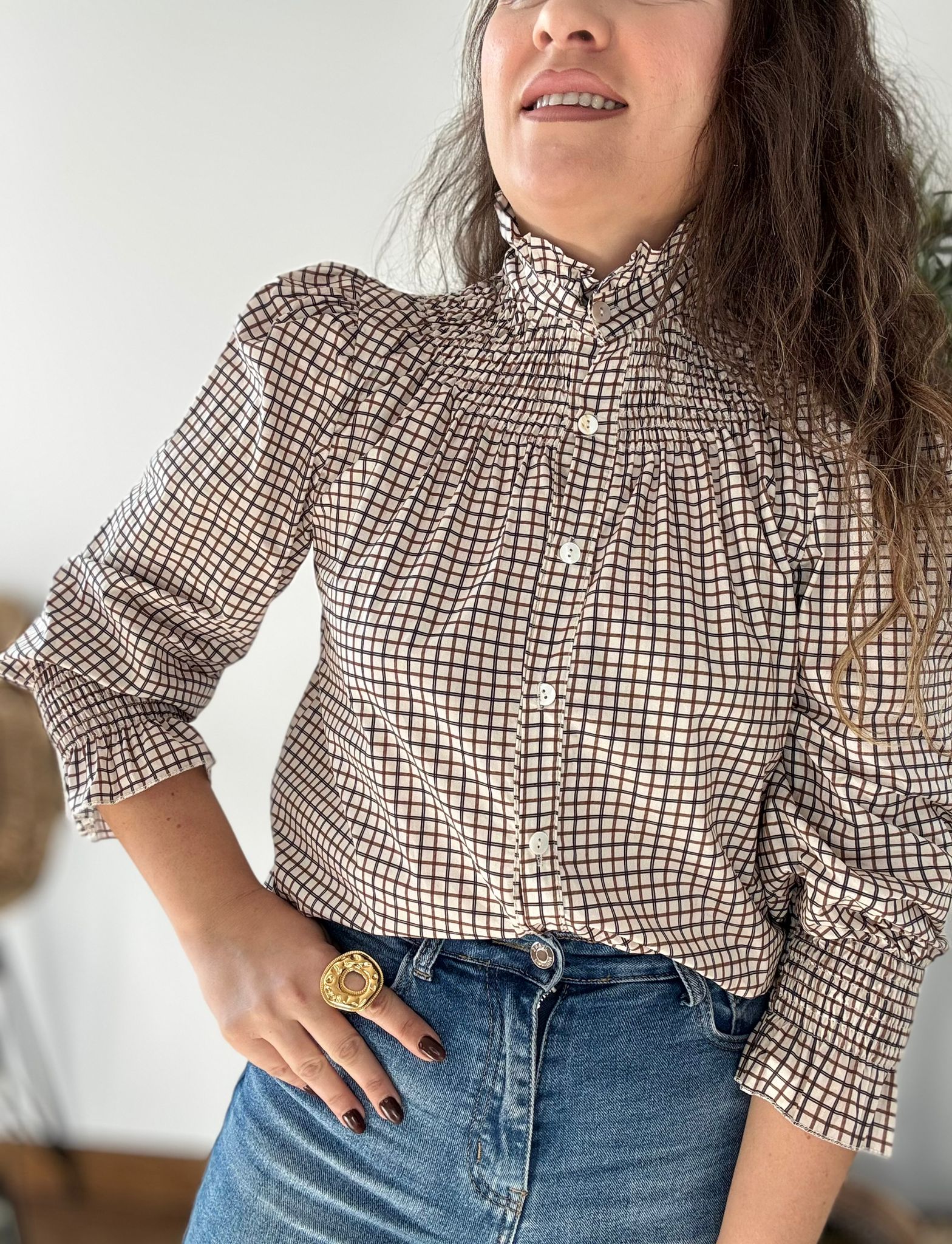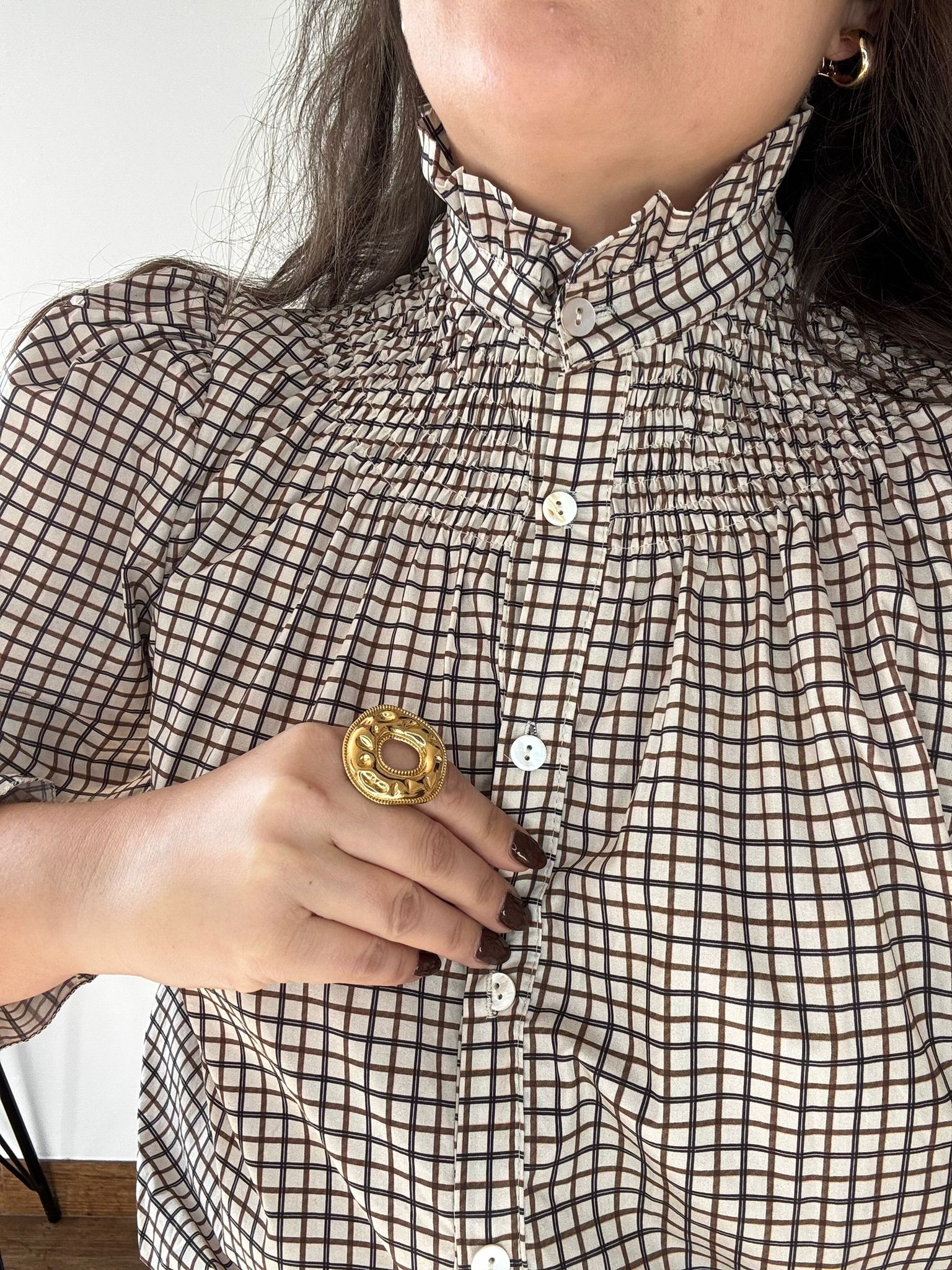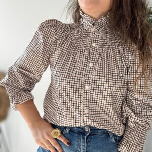 Camisa con cuello y puños engomados. TU RECOMENDADA 36/42. Ana lleva habitualmente talla 40/42. Medidas de la camisa: contorno de pecho 112, cadera 120 y largo 60cm