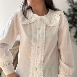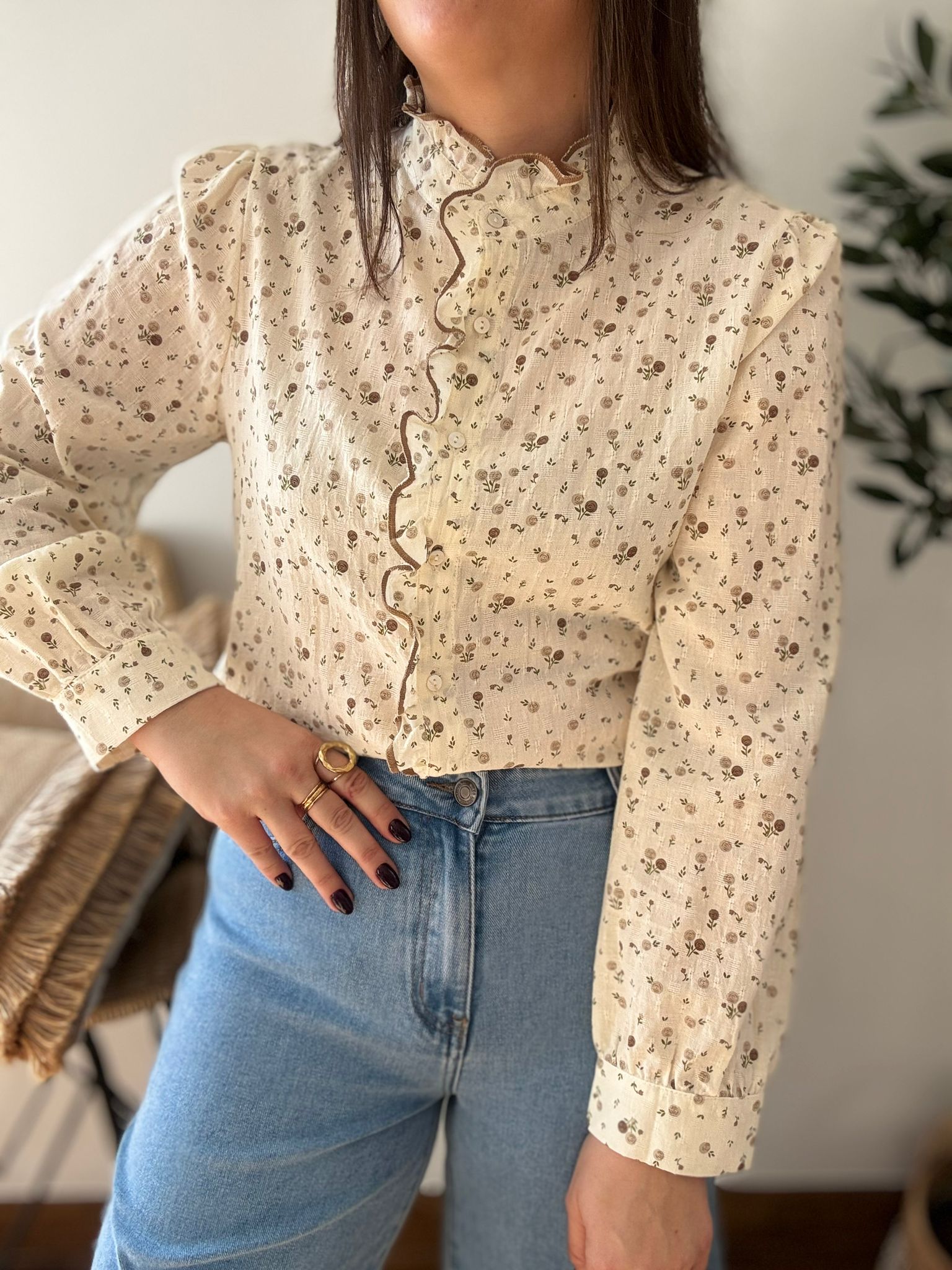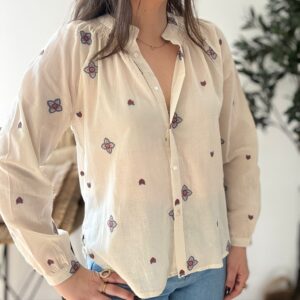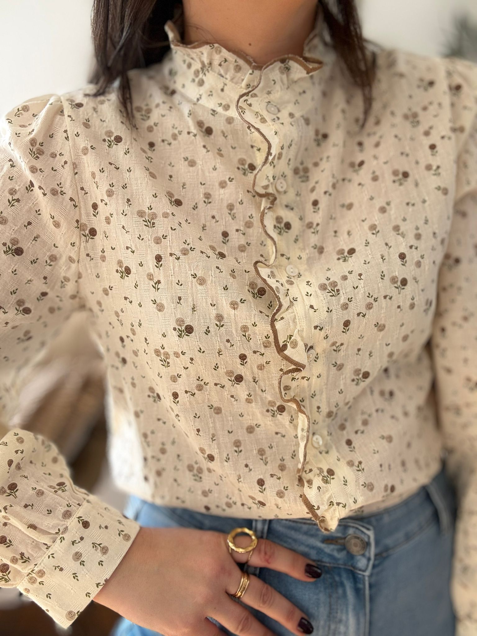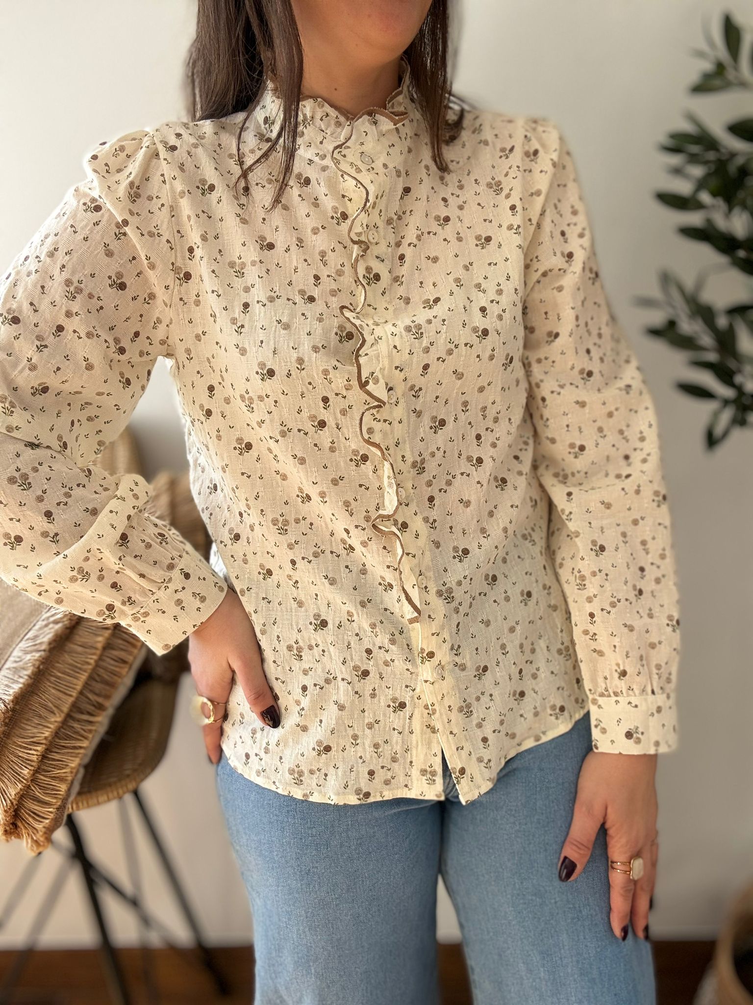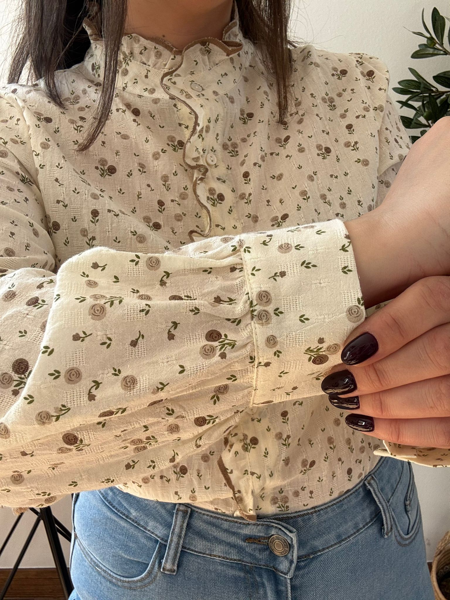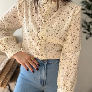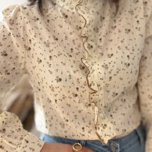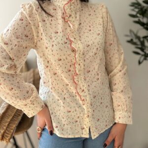Camisa tipo muselina con estilo romántico. Lleva estampado de flores y ribeteado del mismo color. Ana lleva habitualmente talla L/40 y de este modelo lleva talla L. Medidas de contorno de pecho por tallas: S 100, M 104, L 108 y XL 114 cm