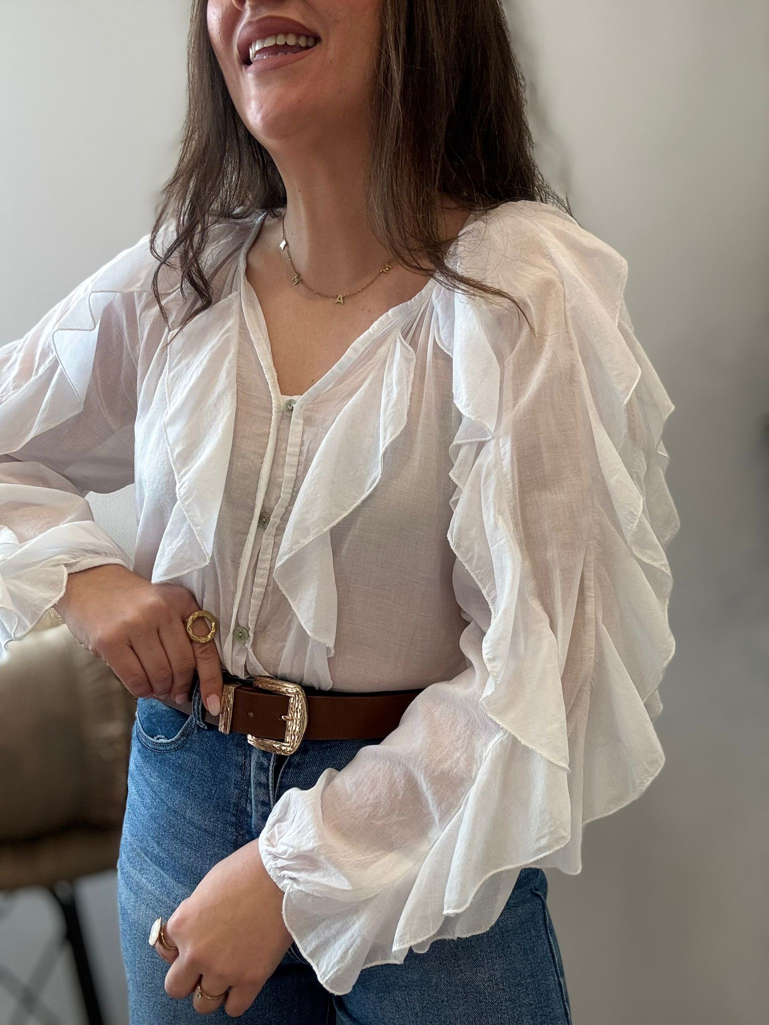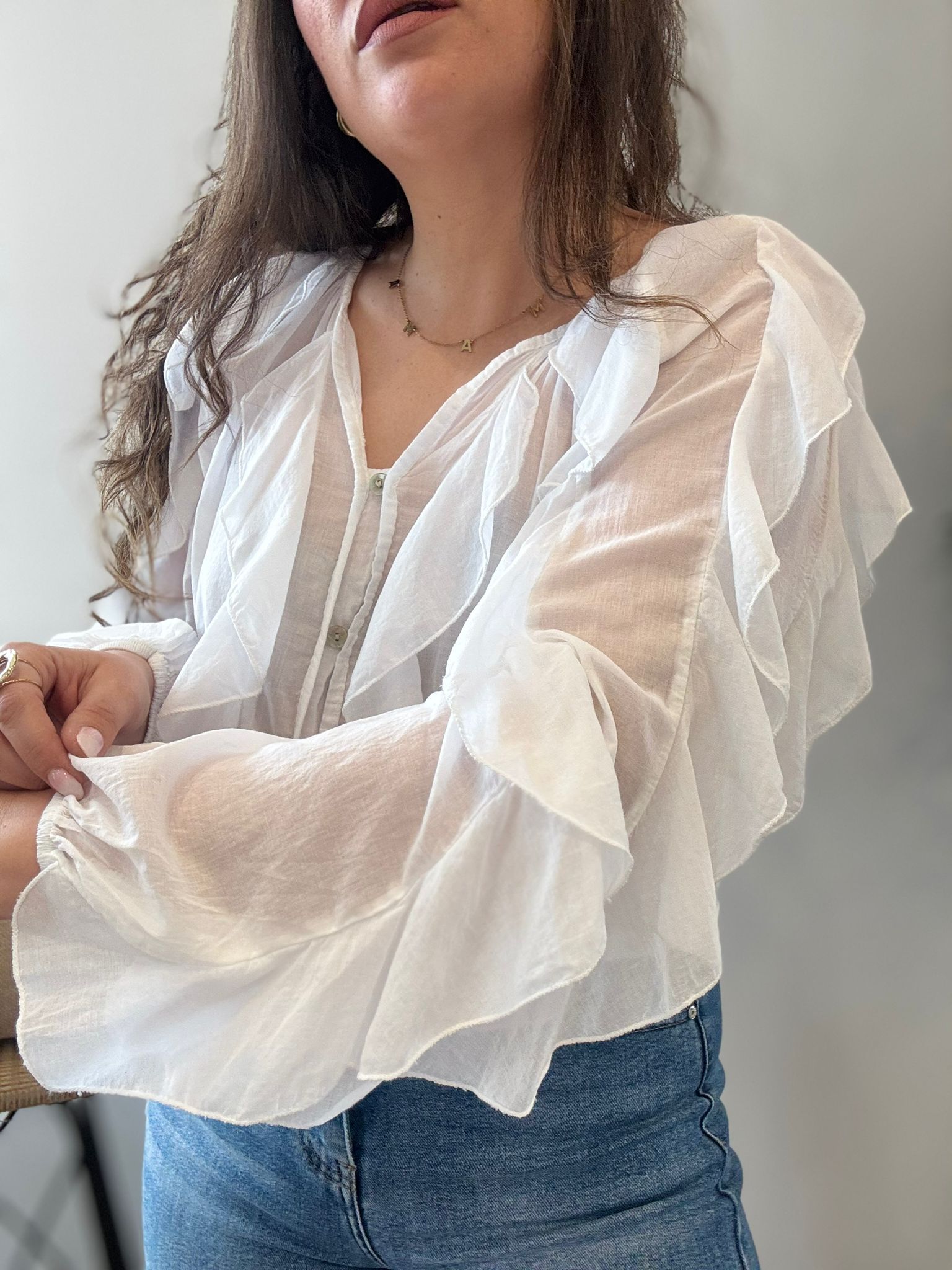 Camisa de gasa con volantes en las mangas y la parte delantera. TU RECOMENDADA 36/44. Ana lleva habitualmente talla L/40. Medidas de la camisa: contorno de pecho 120 y largo 60cm
