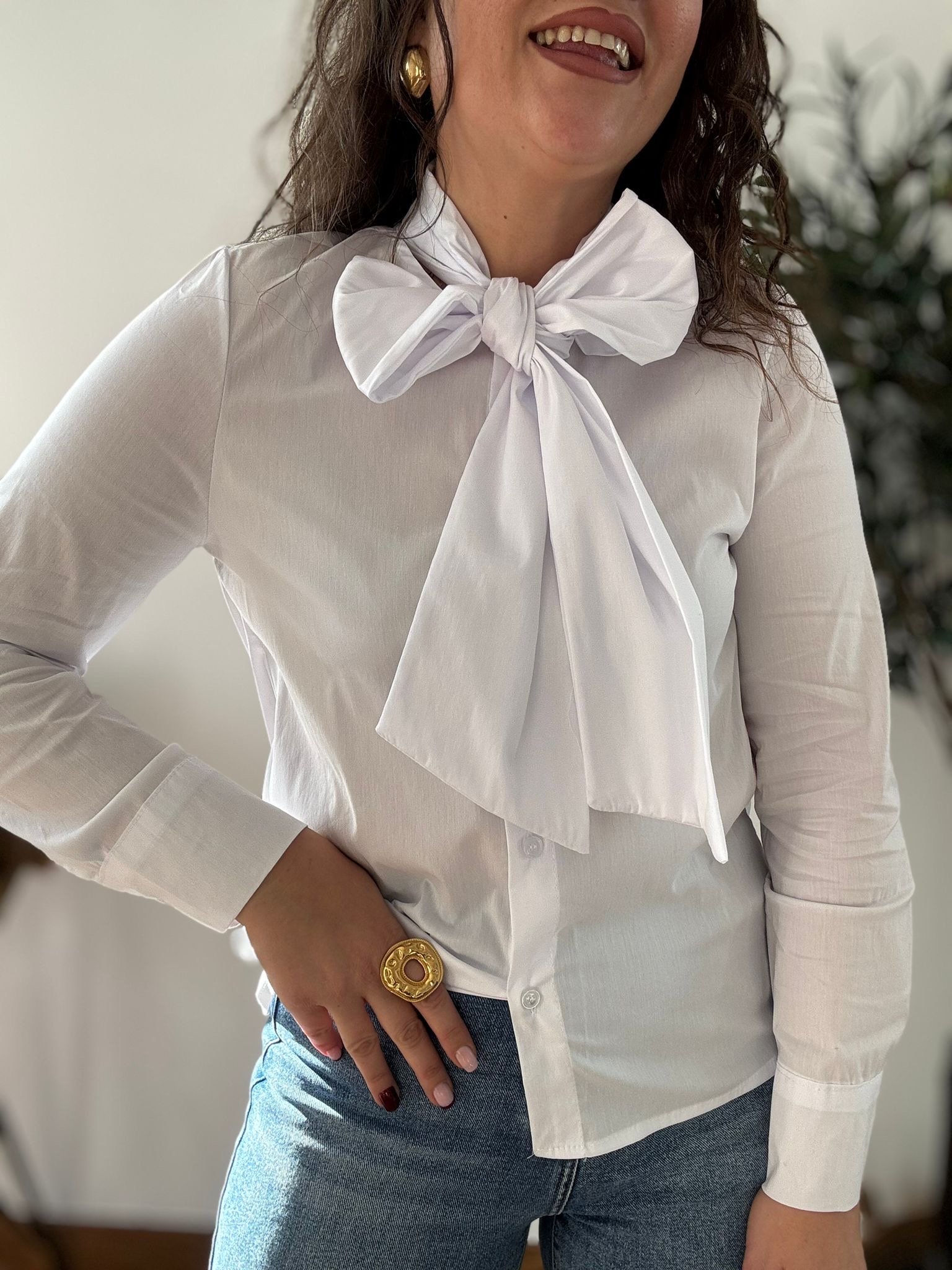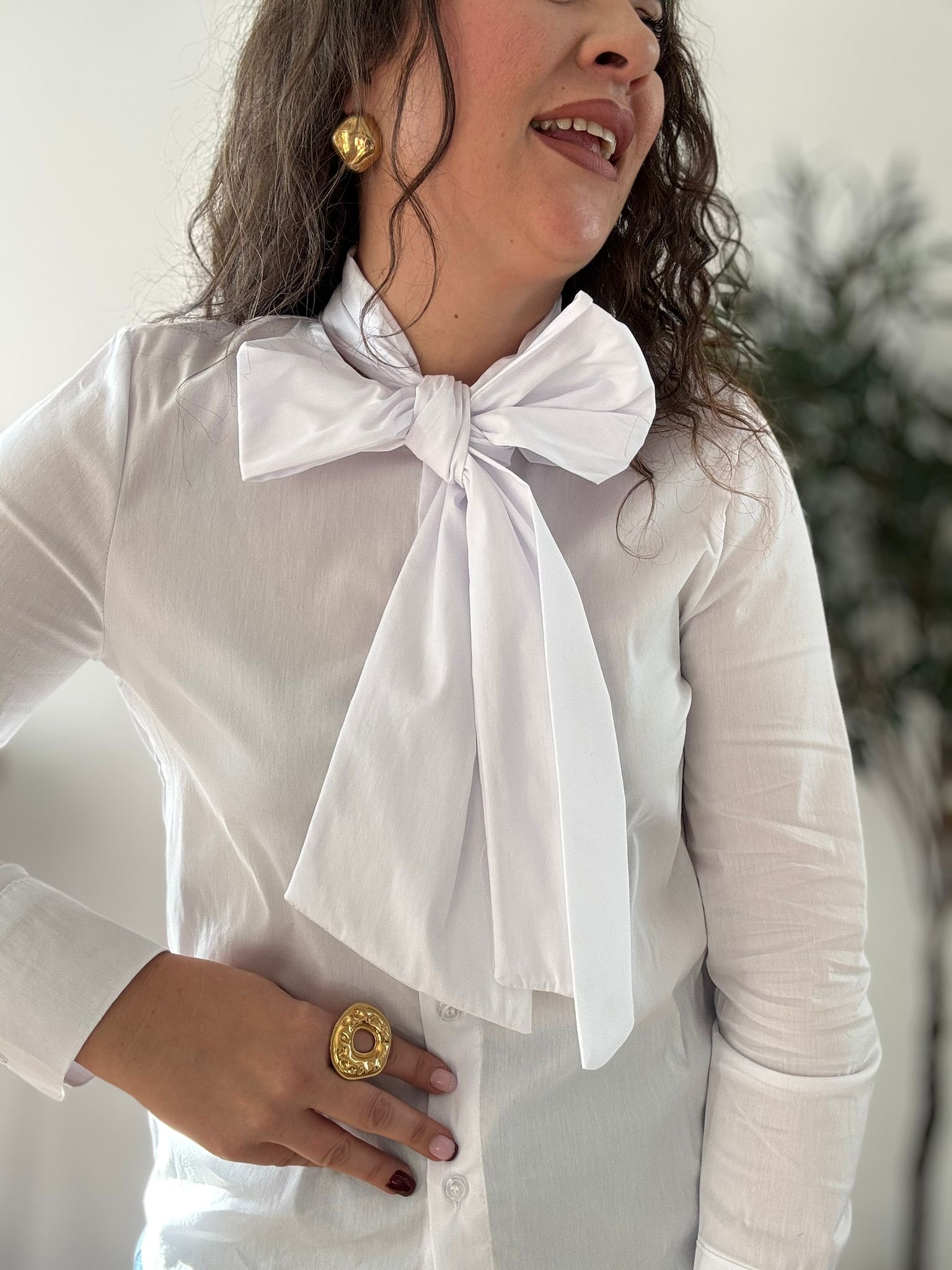 Camisa de algodón con MAXI LAZADA BLANCA. TU RECOMENDADA 36/42.’ Ana lleva habitualmente talla 40/42. Medidas de la camisa: contorno de pecho 102 y largo 65cm TIENE UN POQUITO DE ELÁSTICO