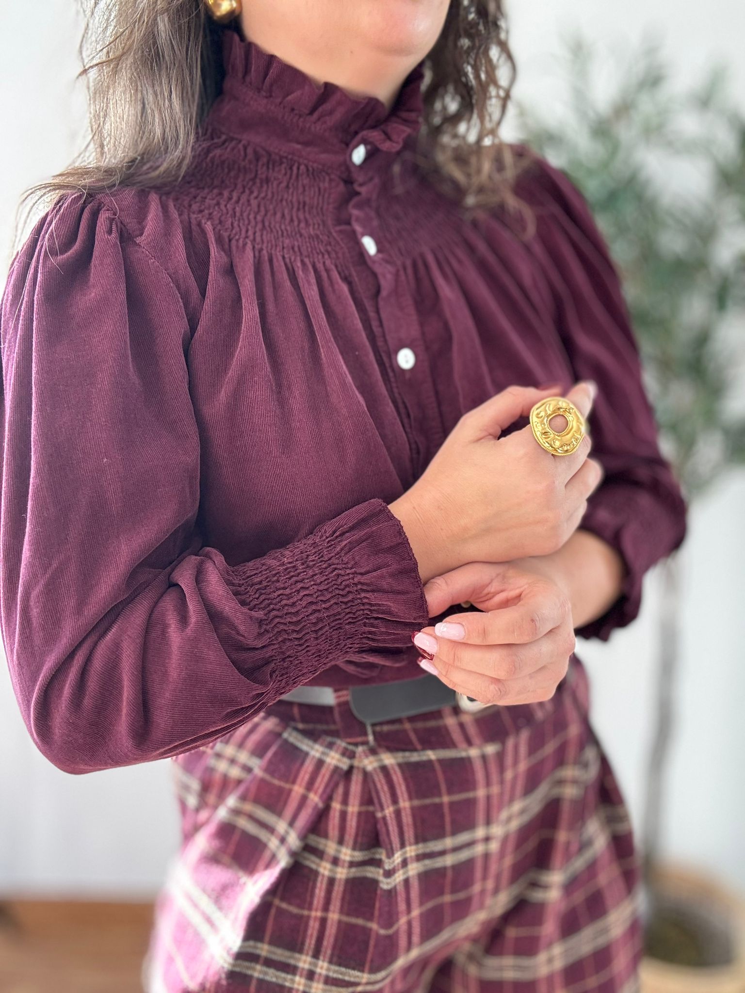 Camisa de micropana con cuello chimenea y puños engomados. TU RECOMENDADA 36/42. Ana lleva habitualmente talla 40/42. Medidas de la camisa: contorno de pecho 114 y largo 61cm
