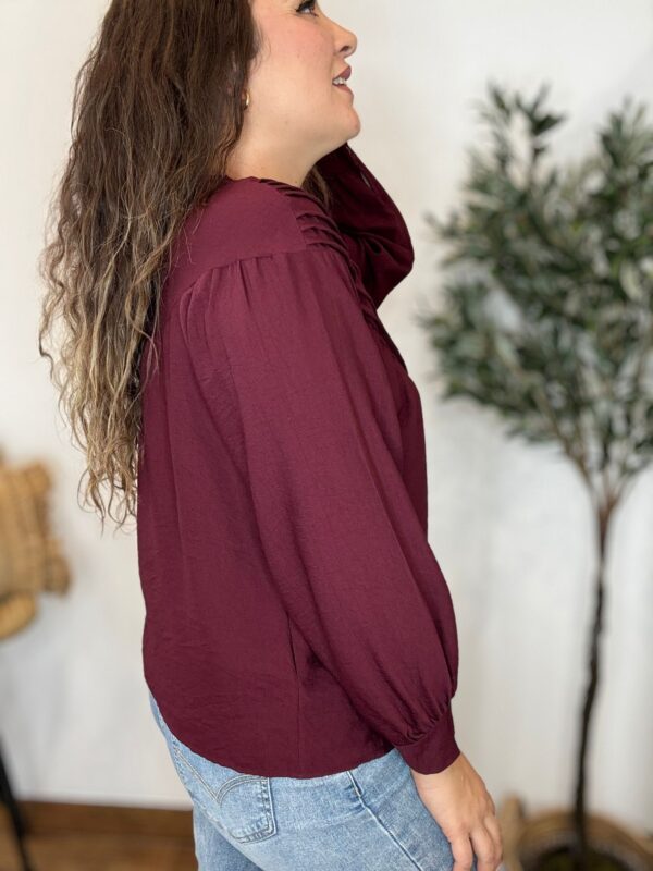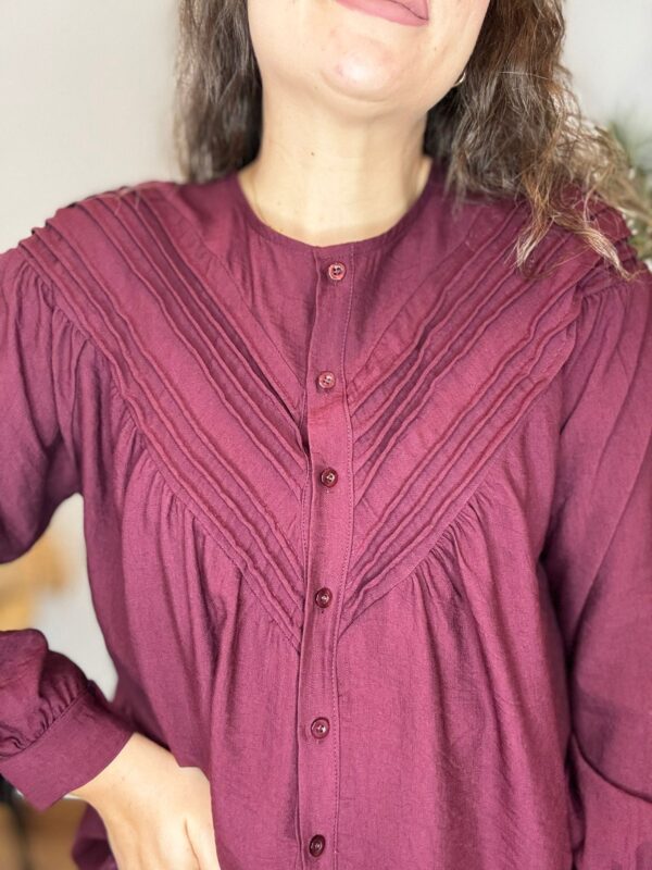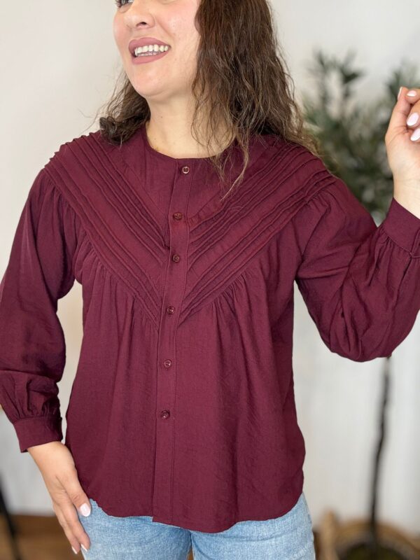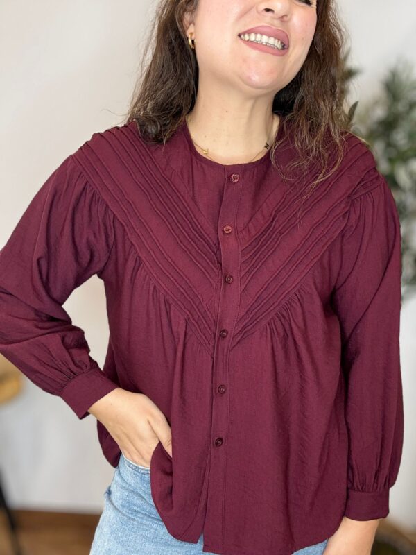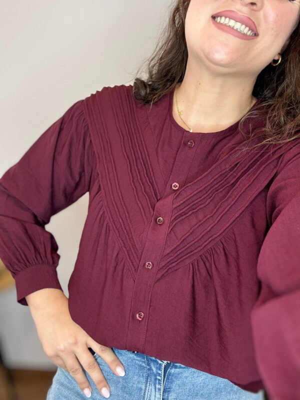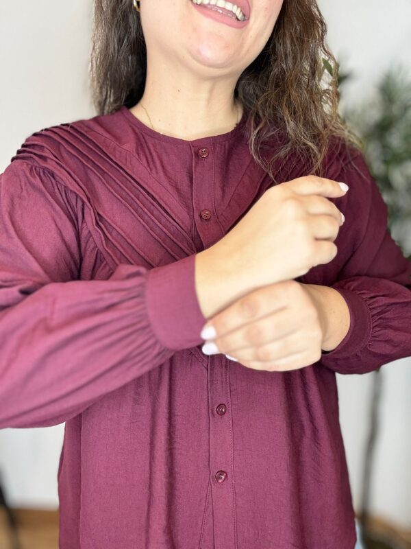 Camisa con detalle de pliegues en el escote. Abotonada en los puños. TU RECOMENDADA 38/44. Ana lleva habitualmente talla L 40/42. Medidas de la camisa: contorno de pecho 120 y largo  61cm