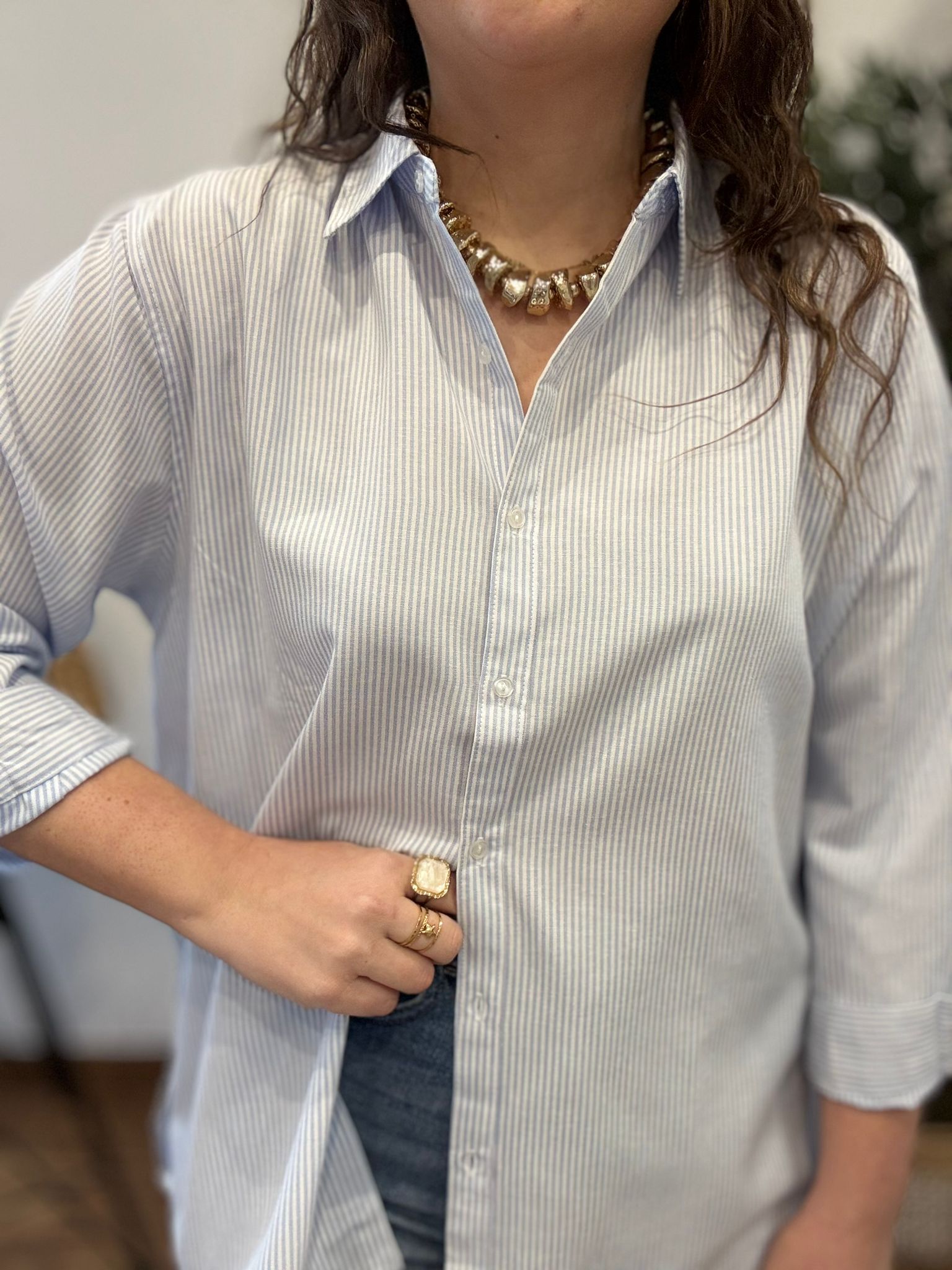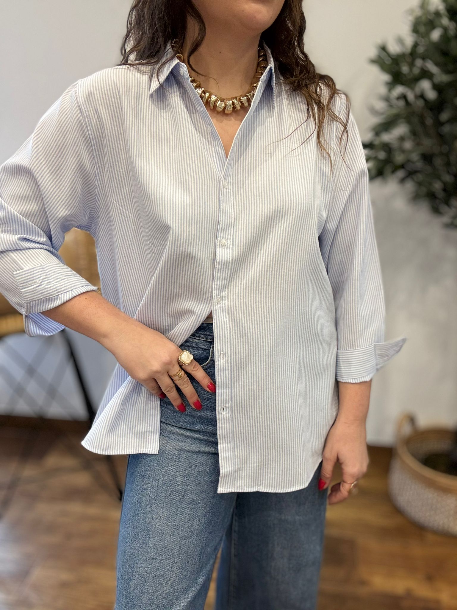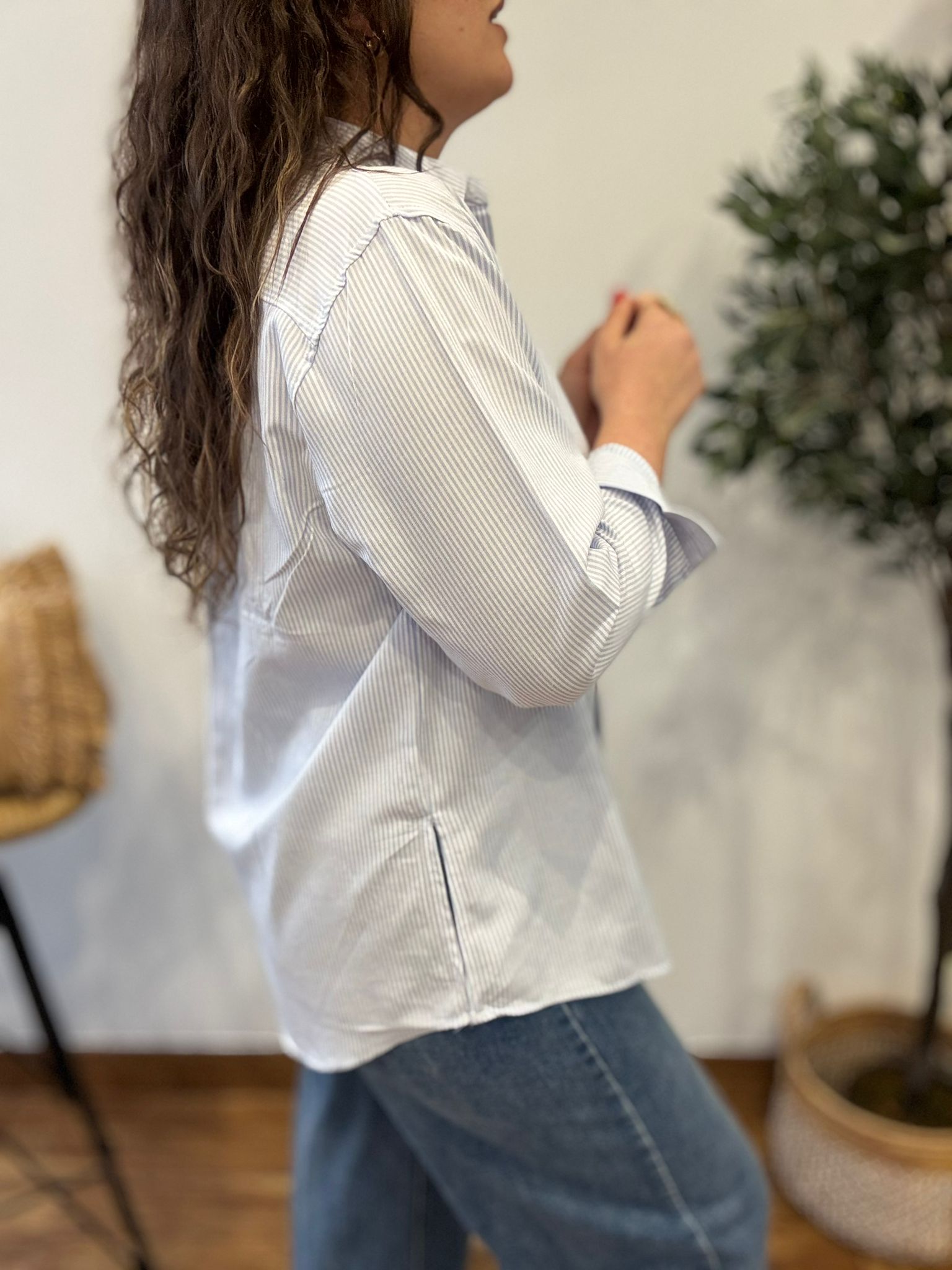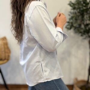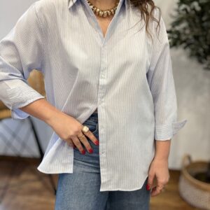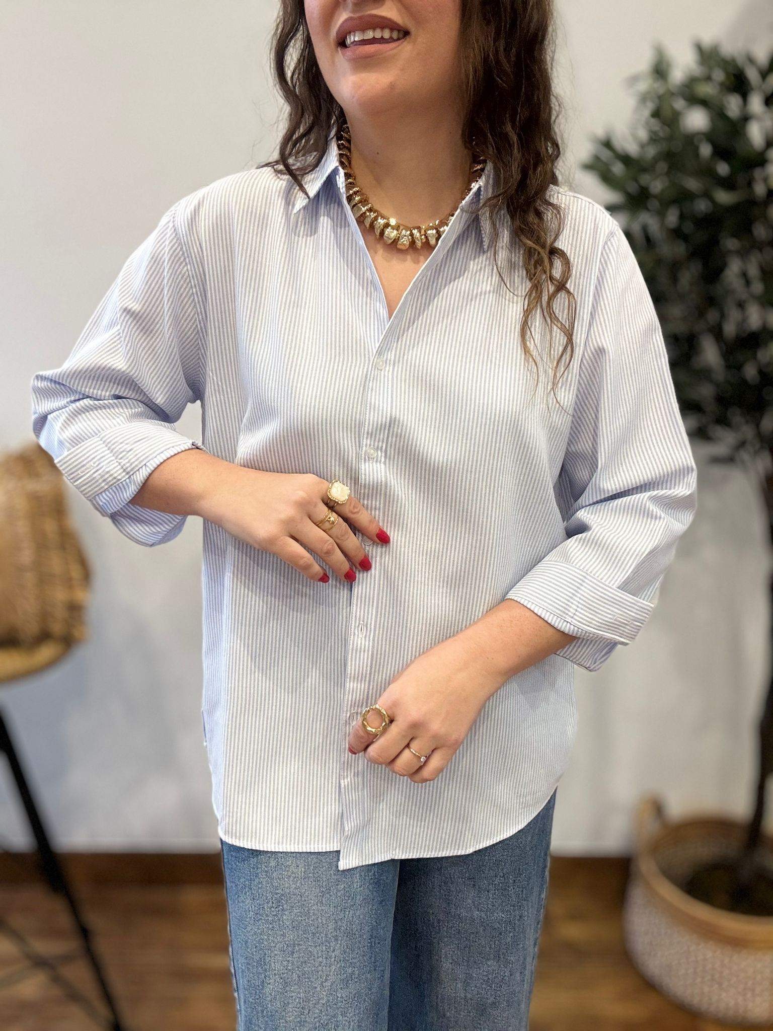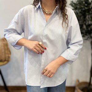 Camisa de algodón en tejido premium. Talla oversize. Ana utiliza habitualmente talla L y de esta camisa en fotos lleva talla L. Tiene aberturas laterales. Medidas de contorno de pecho por tallas: S 114, M 116, L 120 y XL 126cm