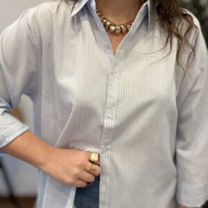 Camisa de algodón en tejido premium. Talla oversize. Ana utiliza habitualmente talla L y de esta camisa en fotos lleva talla L. Tiene aberturas laterales. Medidas de contorno de pecho por tallas: S 114, M 116, L 120 y XL 126cm
