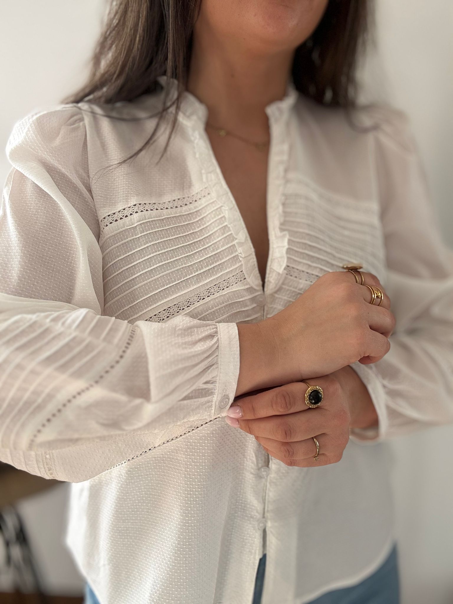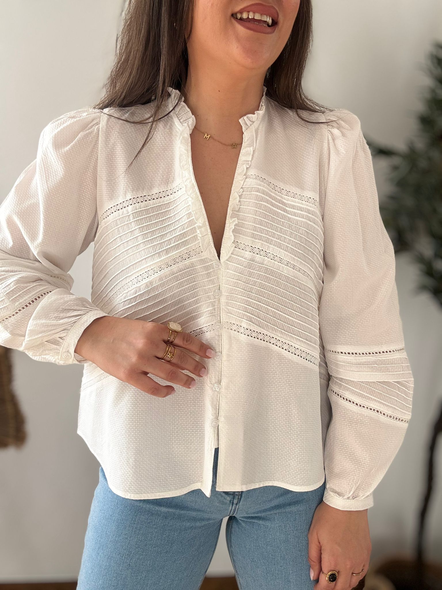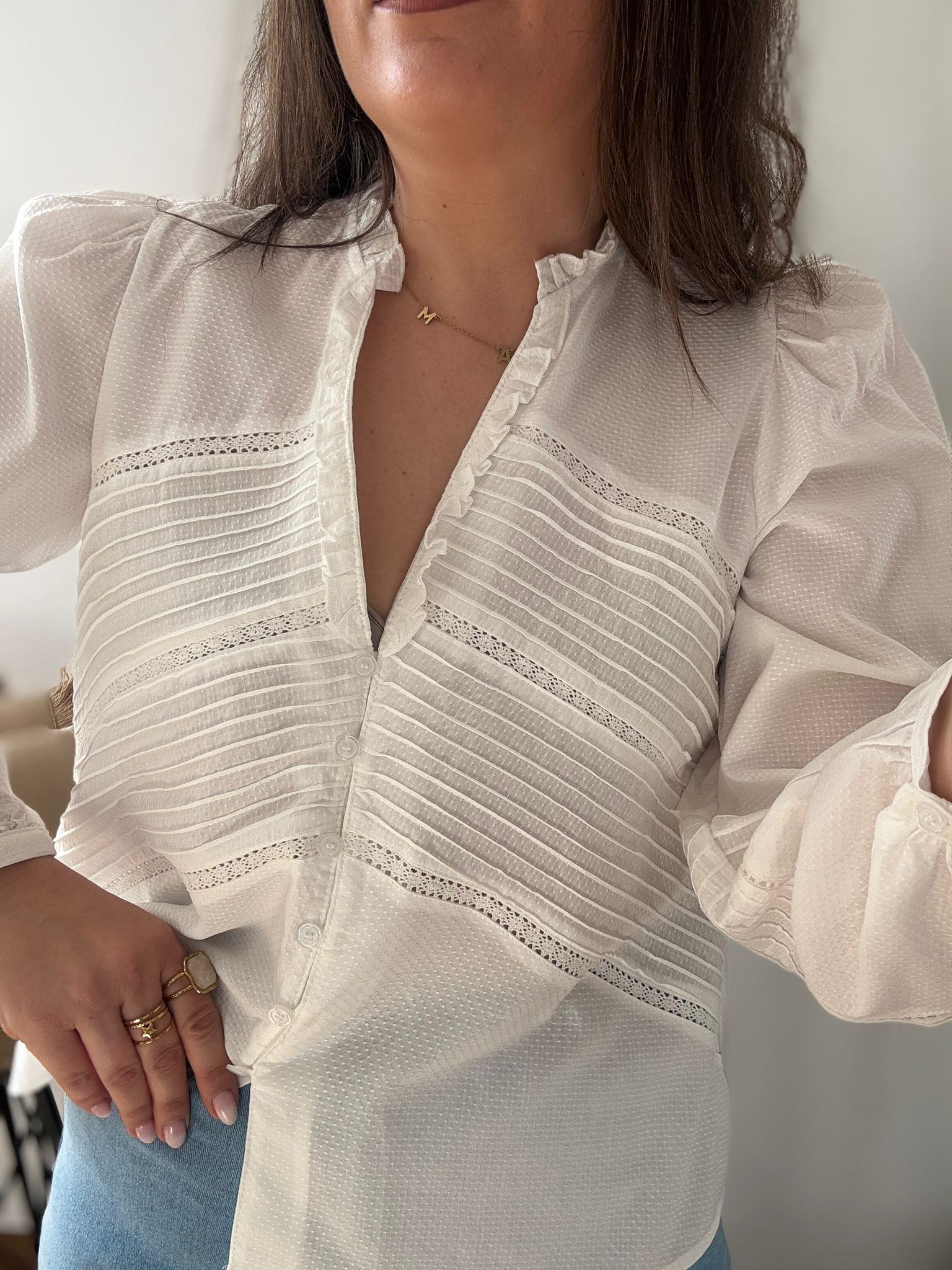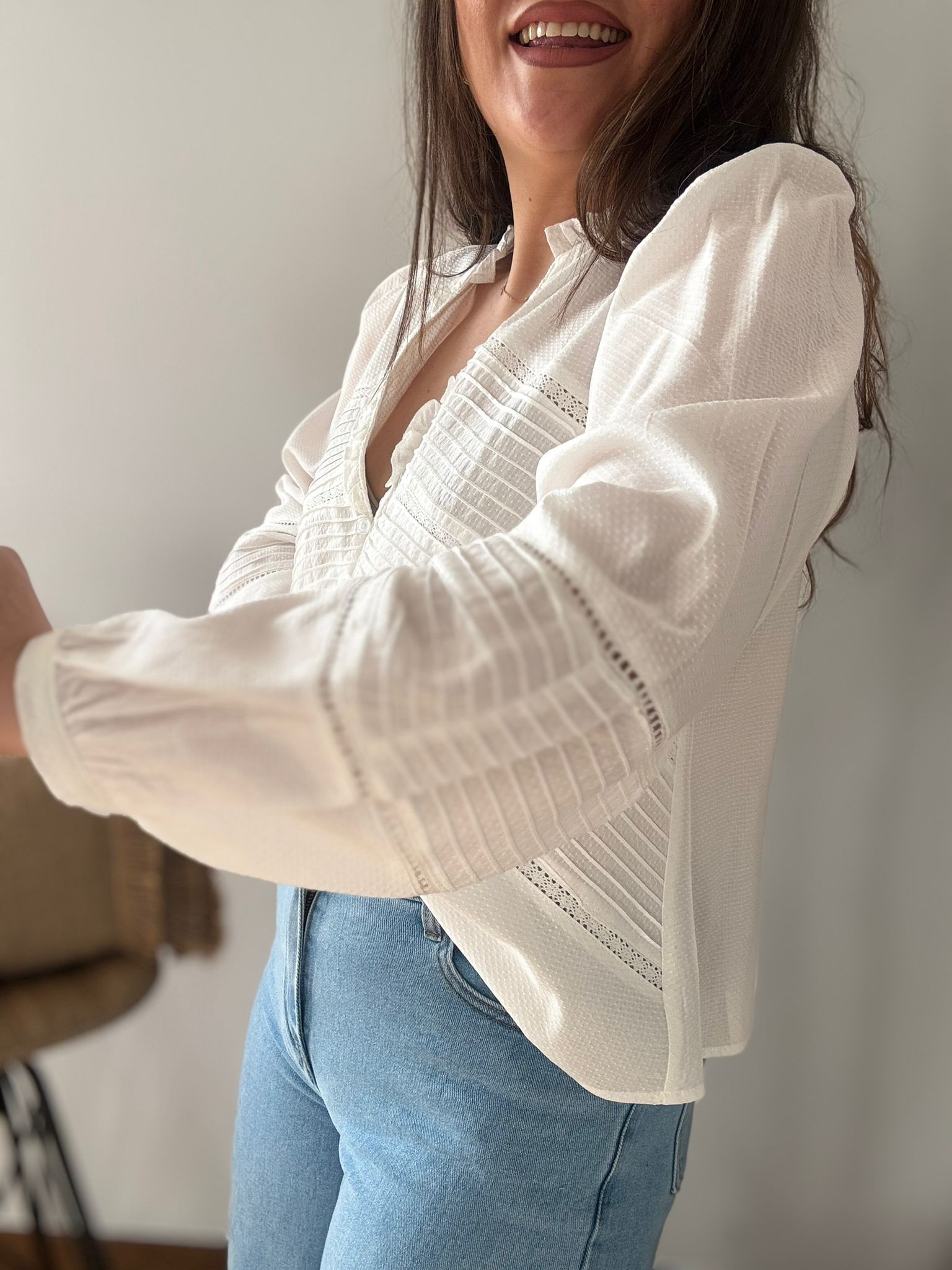 Camisa de estilo romántico con tejido de piqué y bordes calados y plisados. Ana lleva habitualmente talla L/40 y de este modelo ha escogido talla L. Medidas de contorno de pecho por tallas: S 100, M 106 y L 112cm