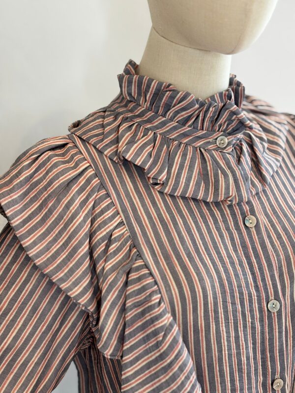 Camisa estampada con rayas y detalle de volantes. TU RECOMENDADA 34/38. A Ana le viene pequeña. Medidas de la camisa: contorno de pecho 95 y largo 60.
