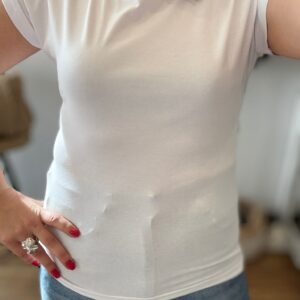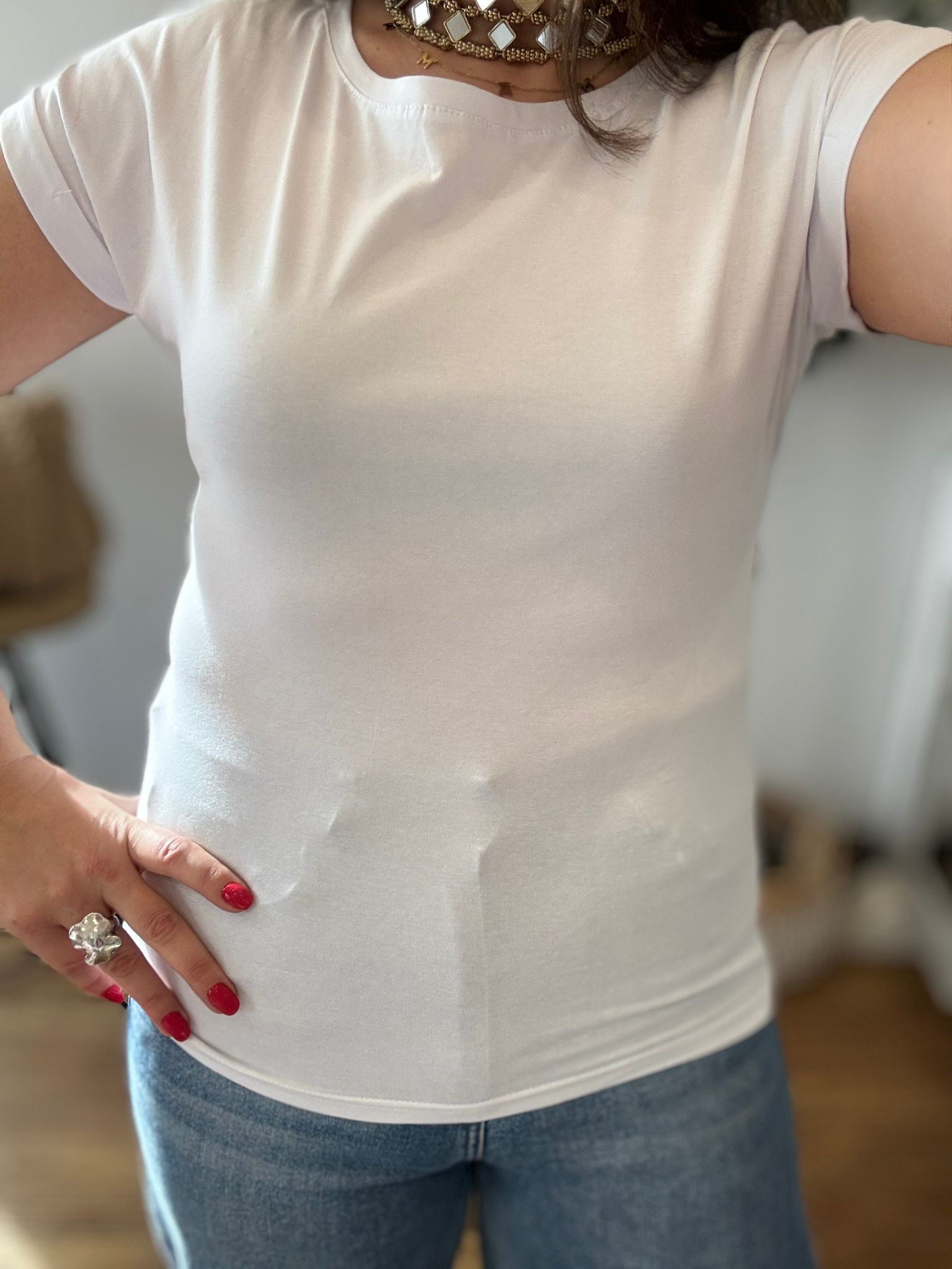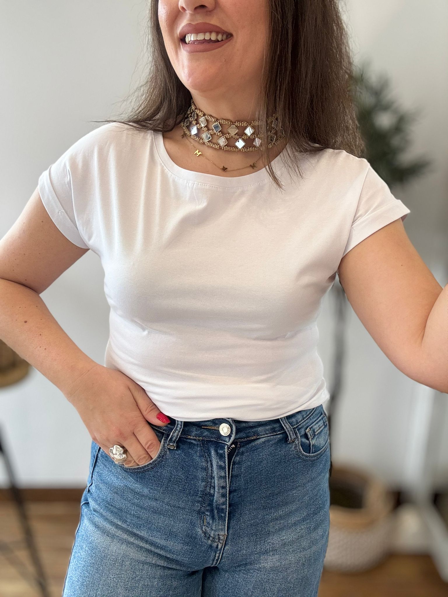 Camiseta blanca de algodón con elastan. TU RECOMENDADA 34/40. Ana lleva habitualmente talla 40.