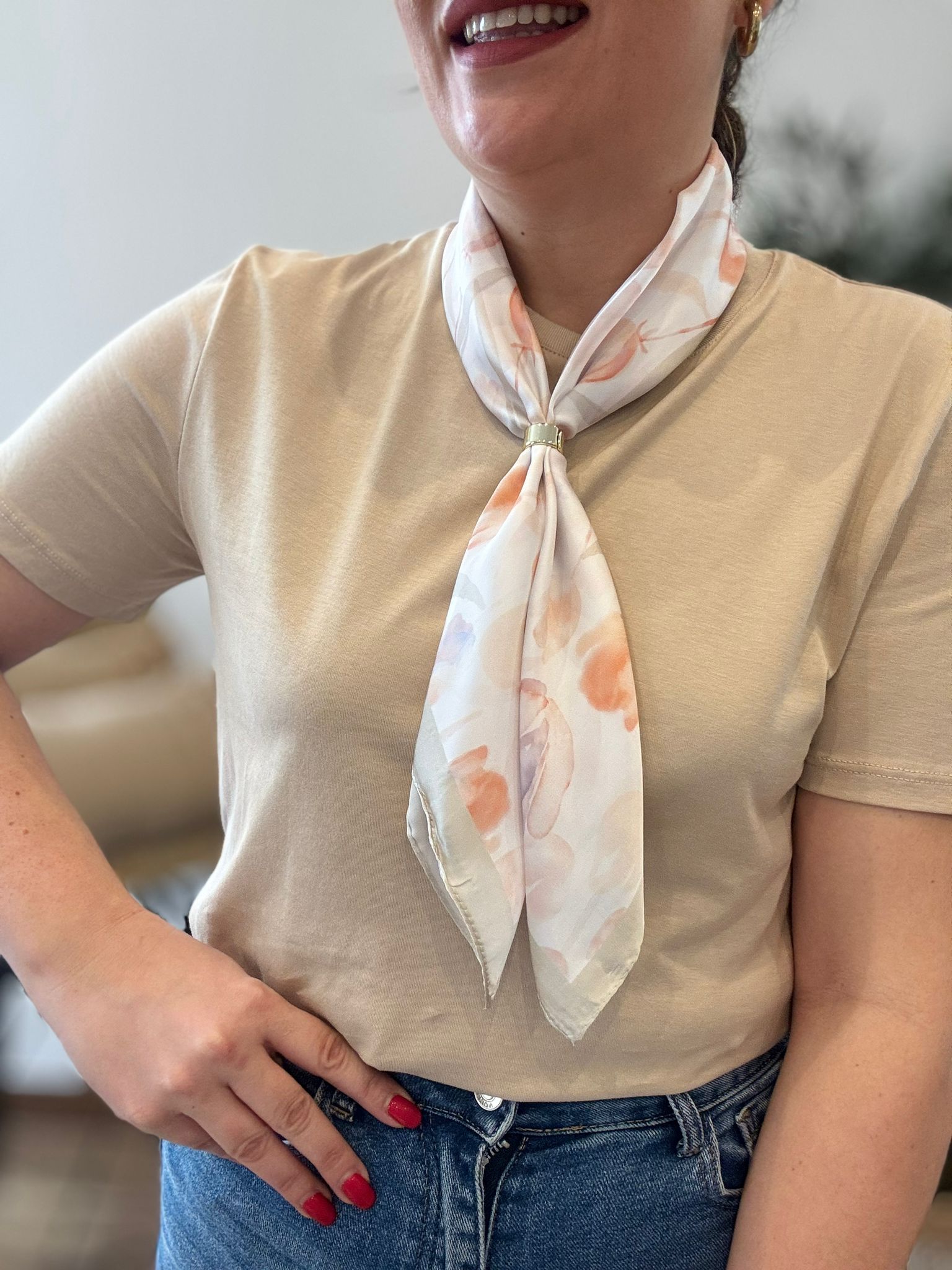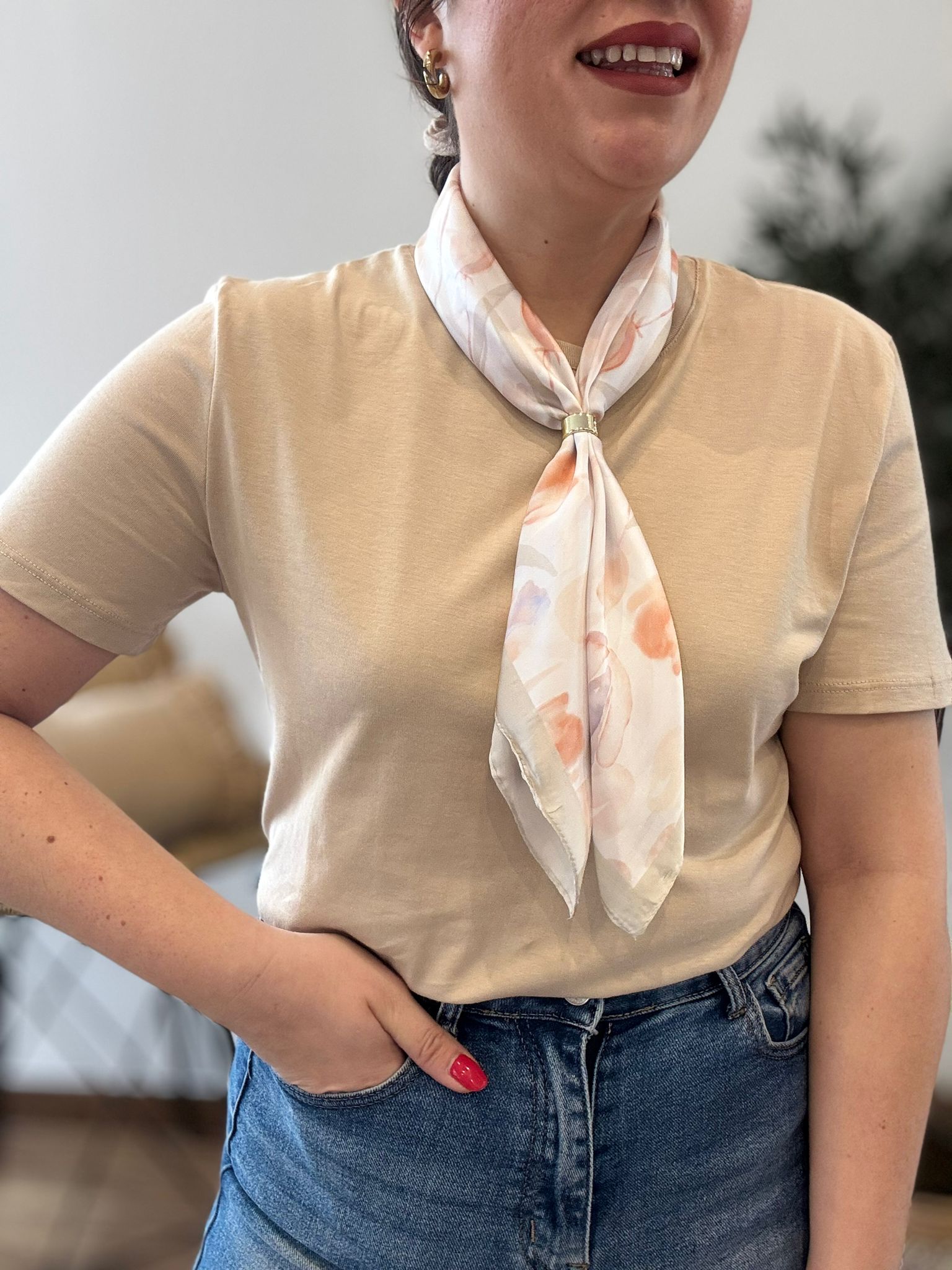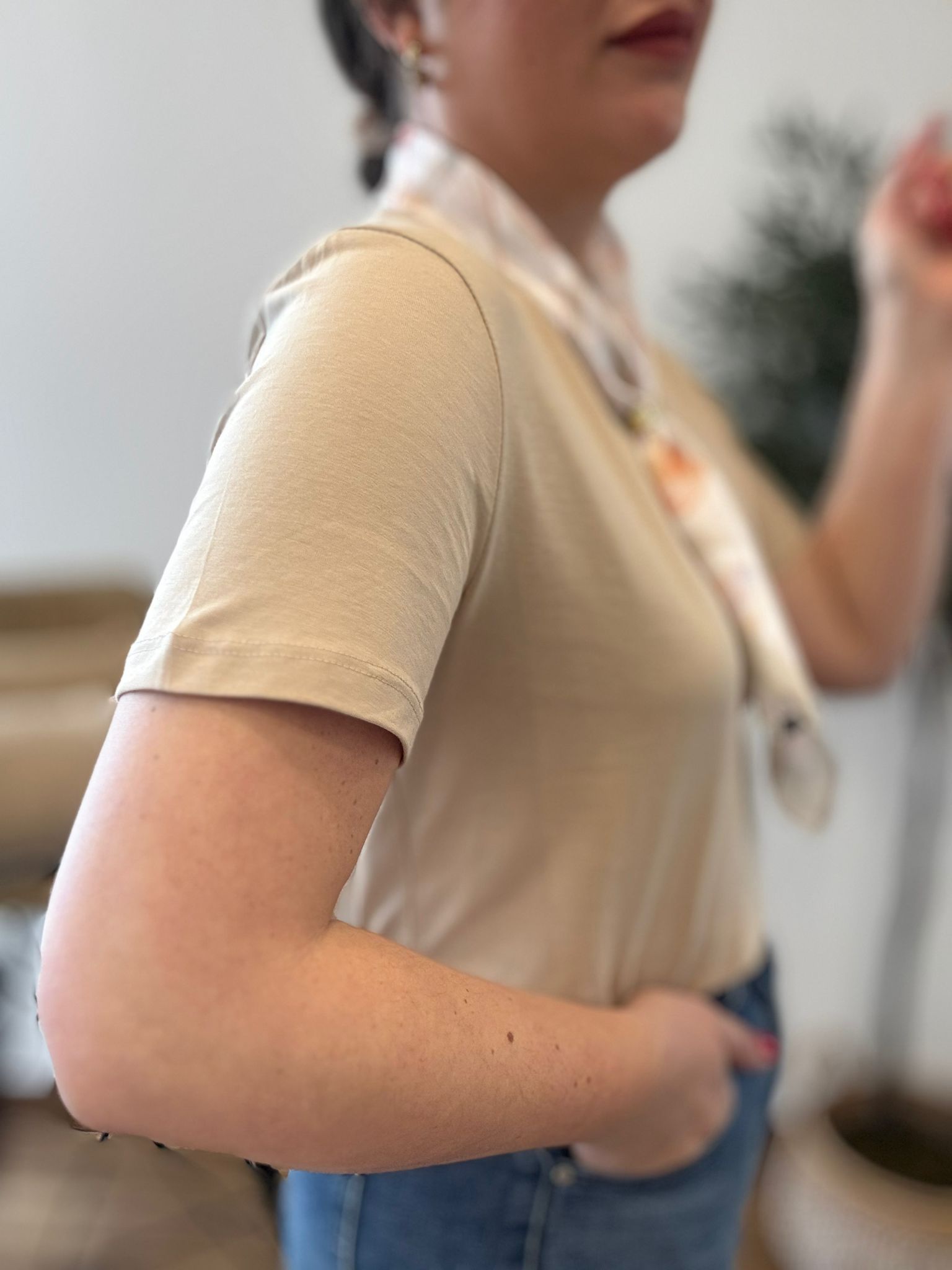 Camiseta básica de manga corta en algodón. TU RECOMENDADA 36/44. Ana lleva habitualmente talla L/40. Medidas de la camiseta contorno de pecho 110 y largo 70cm