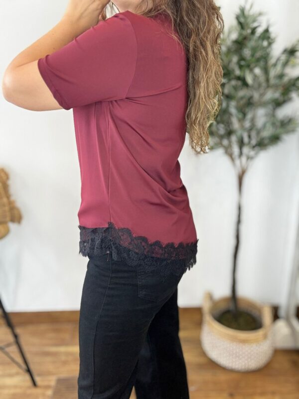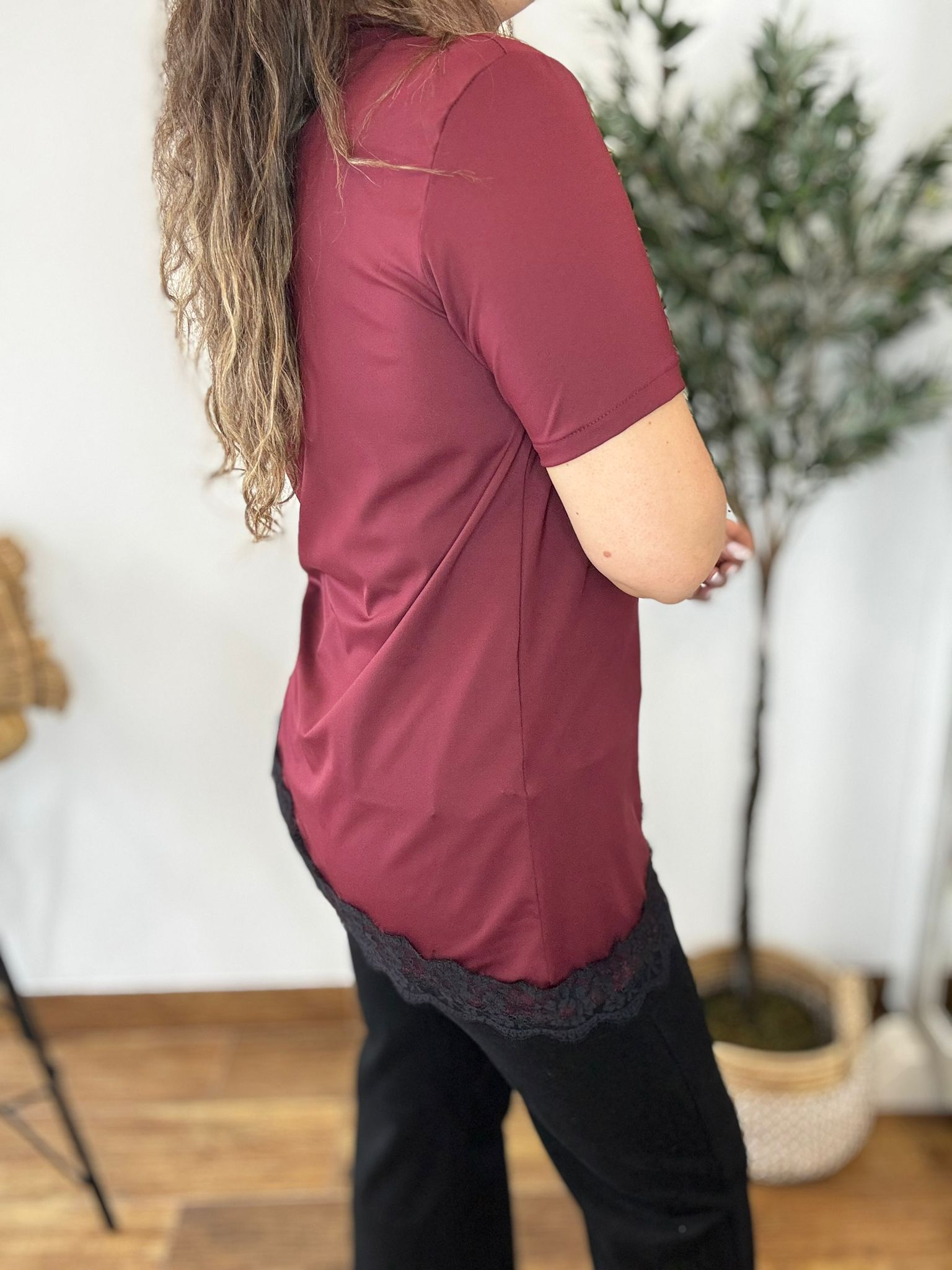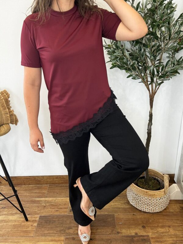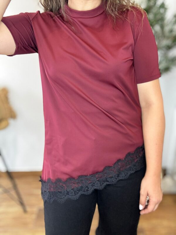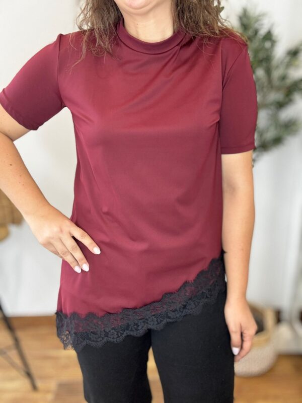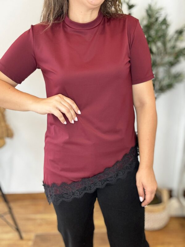 Camiseta de manga corta con cuello subido y detalle lencero asimétrico. Lleva elástico .TU RECOMENDADA 36/42. Ana lleva habitualmente talla L 40/42 y mide 1.71m