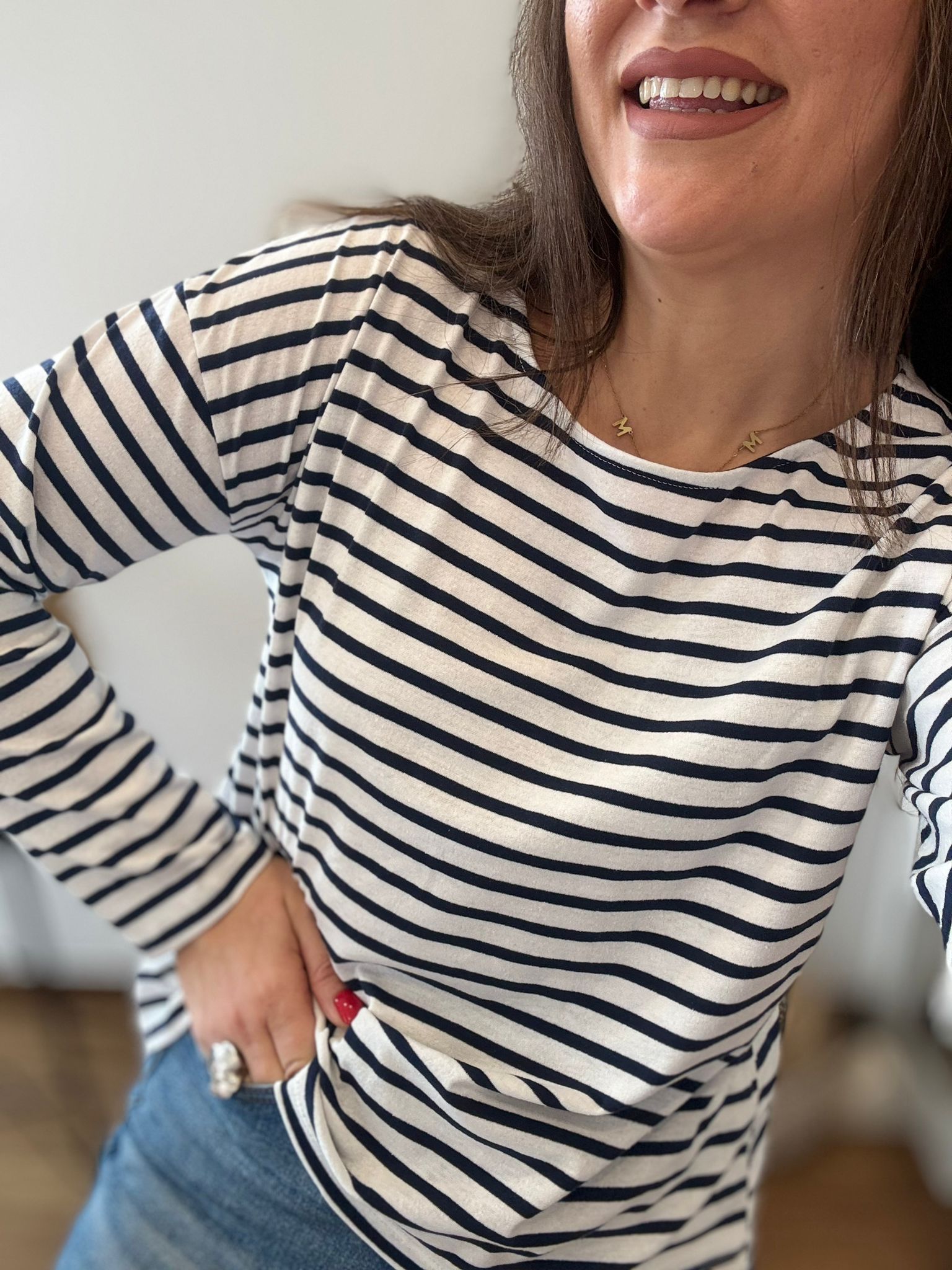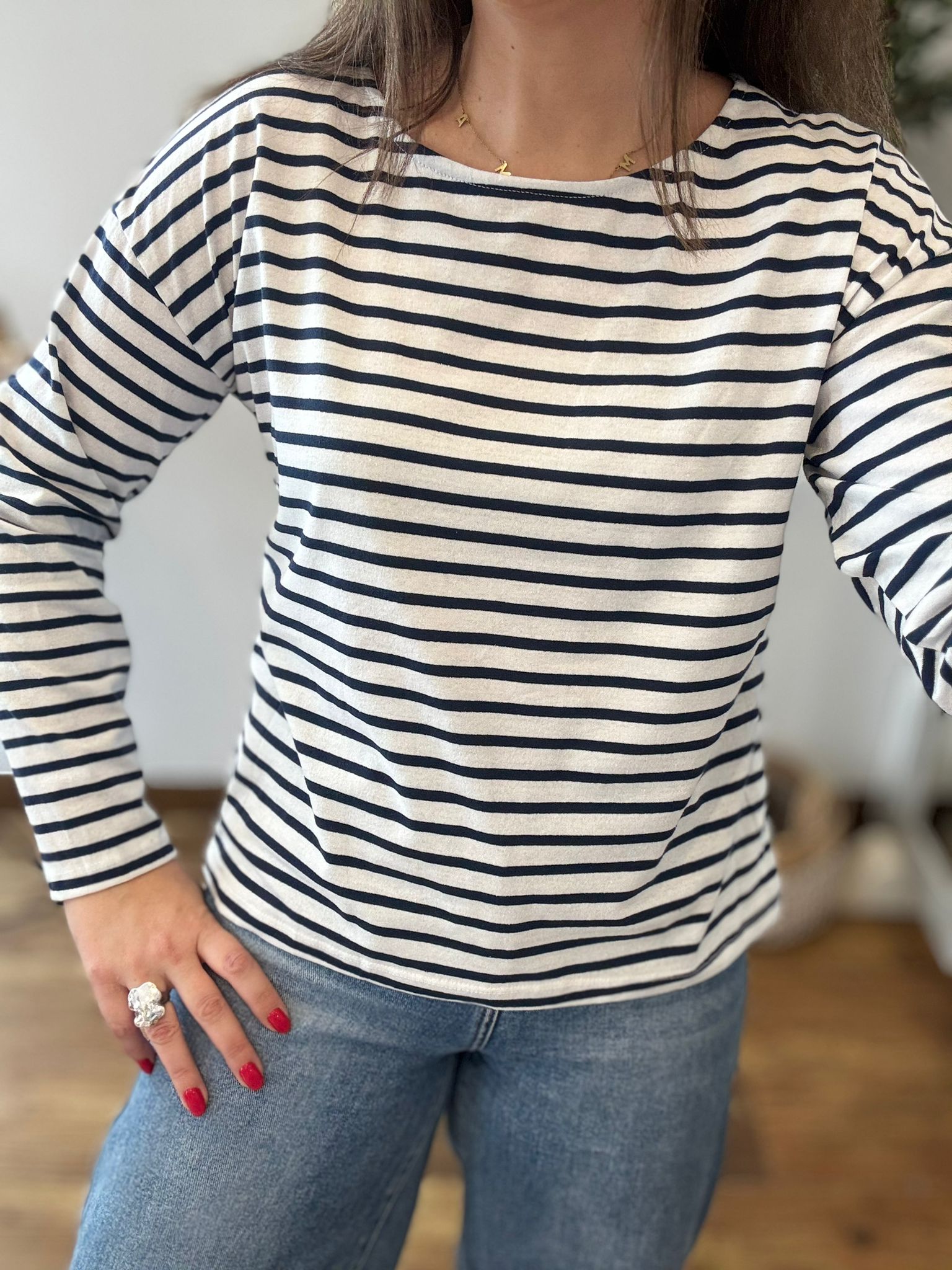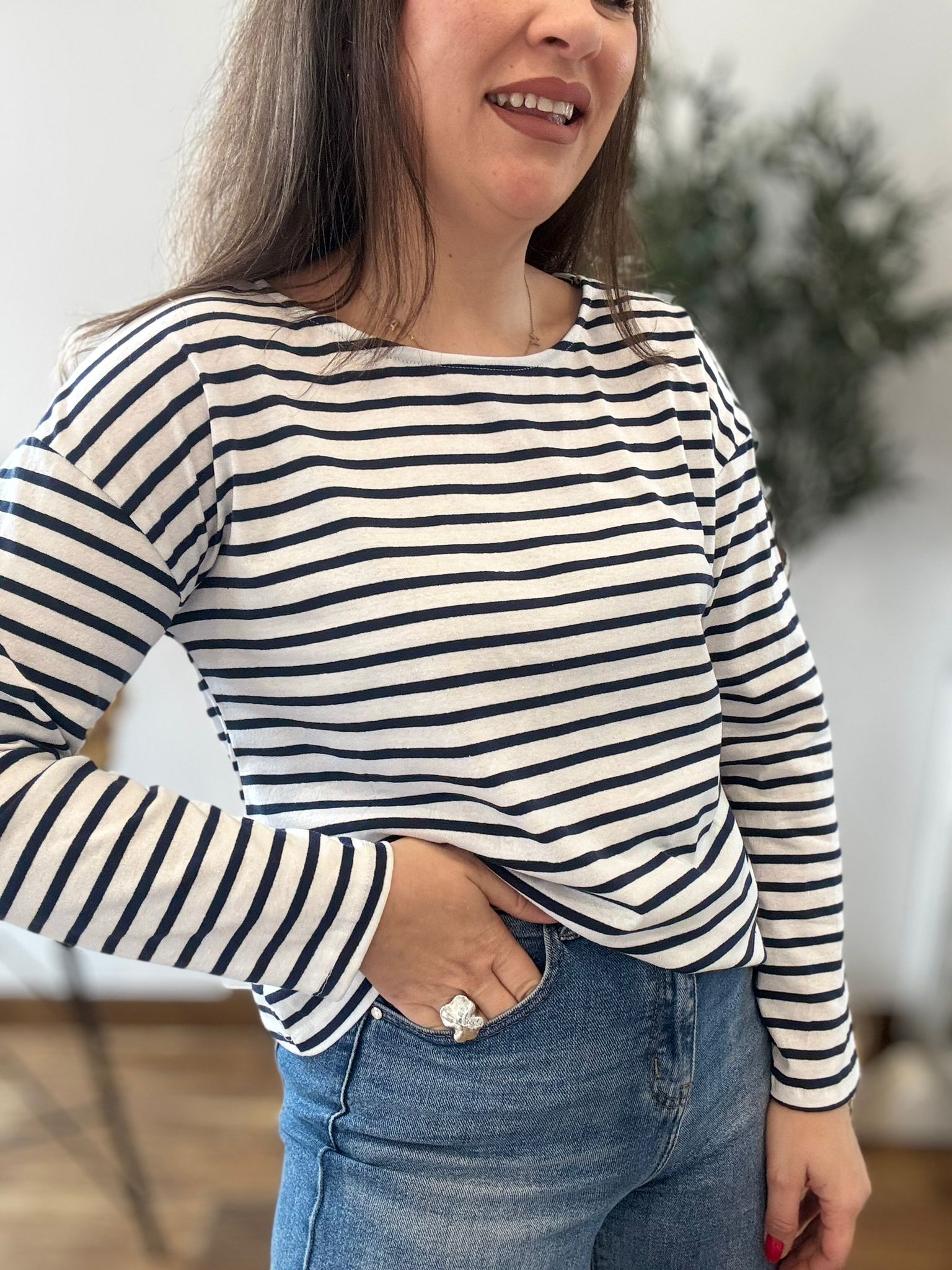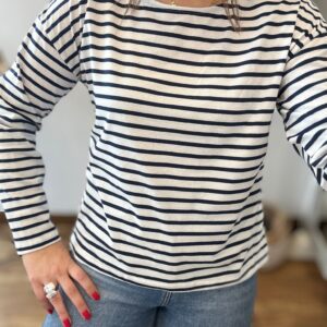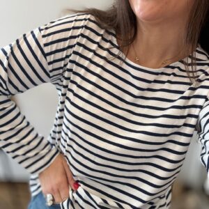 Camiseta de algodón en manga larga. TU RECOMENDADA 38/44. Ana lleva habitualmente talla 40. Medidas de la camiseta contorno de pecho 120 y largo 57cm