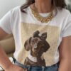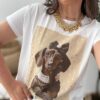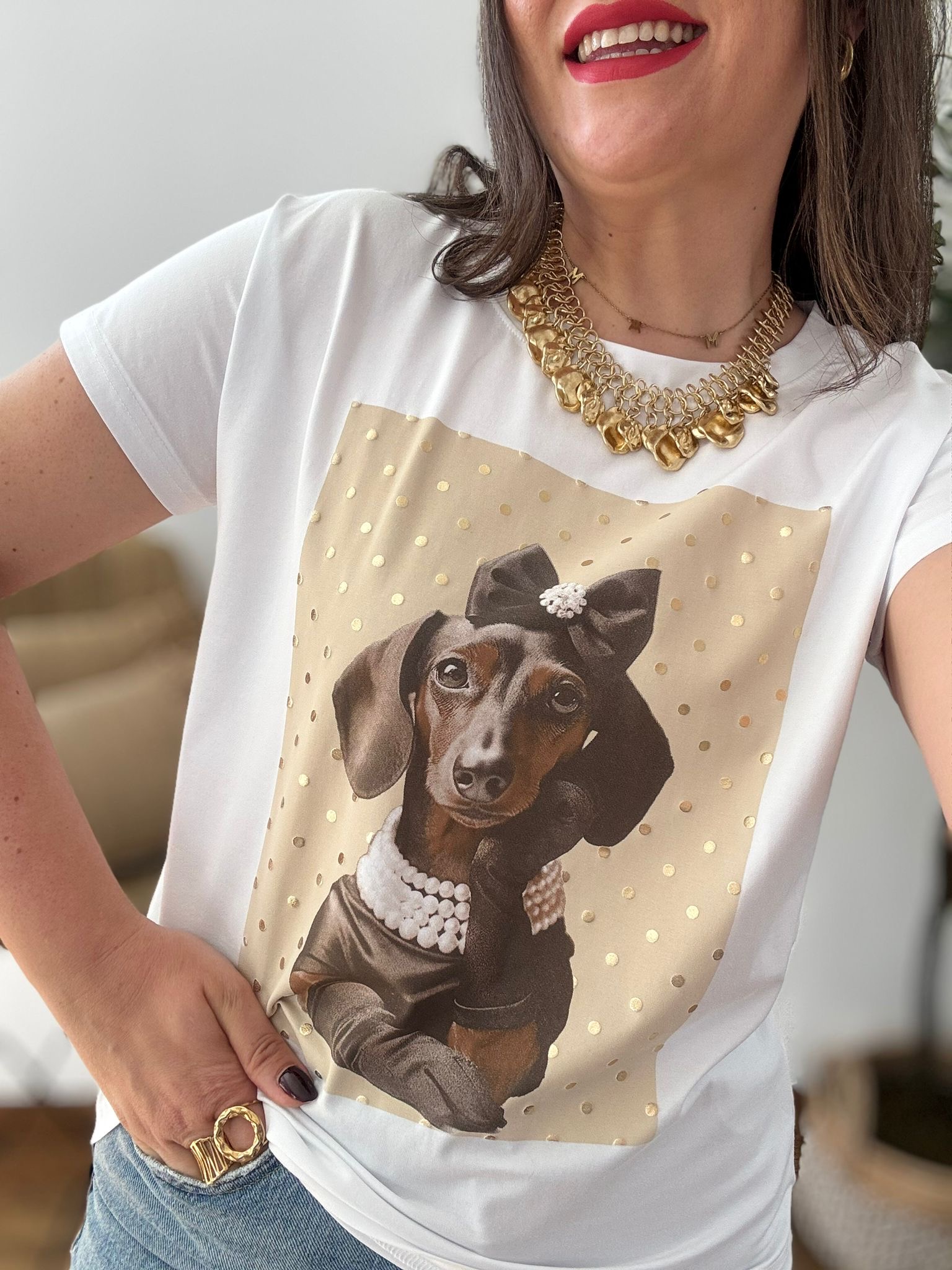Eleva tu básico con estilo y personalidad. Esta camiseta blanca de algodón destaca por su original ilustración de un perro con perlas y lazo, rodeado de un elegante estampado de lunares dorados. Es la mezcla perfecta entre el chic clásico y un toque divertido.