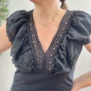 Camiseta de algodón con detalle de algodón perforado y volantes en el escote. TU RECOMENDADA 34/42. Ana lleva habitualmente talla 40/42. Medida de contorno de pecho de la camiseta hasta 110