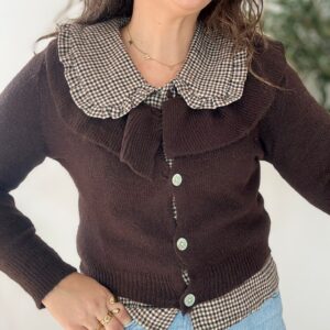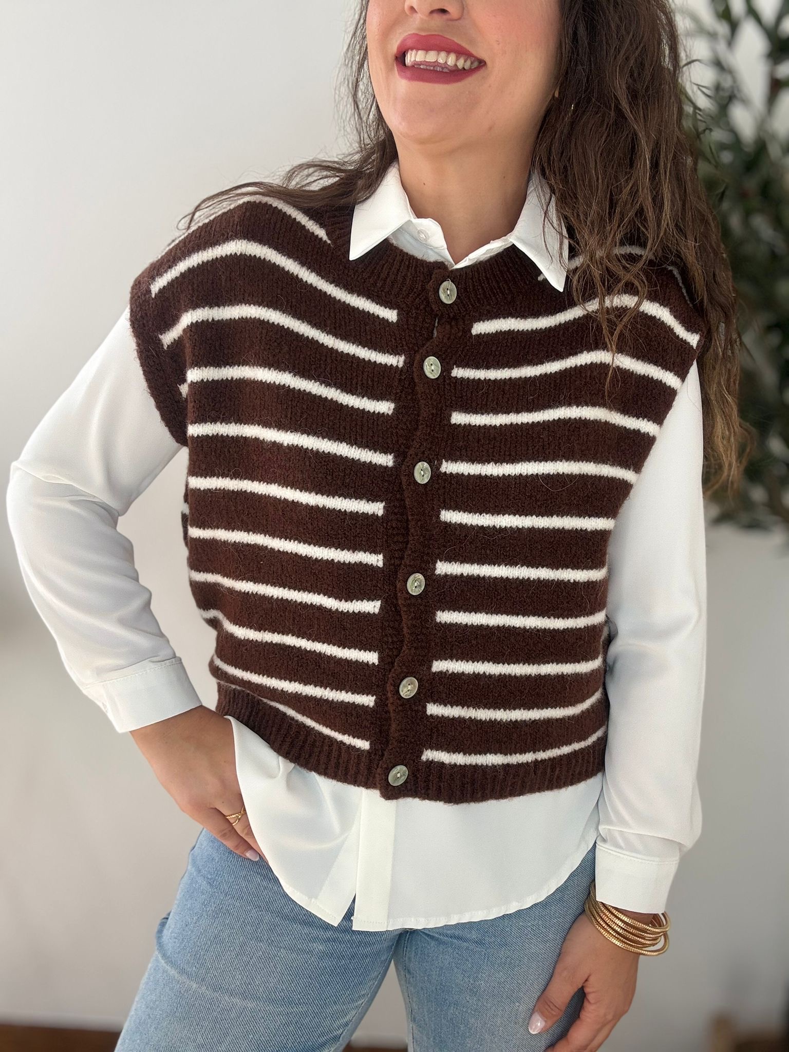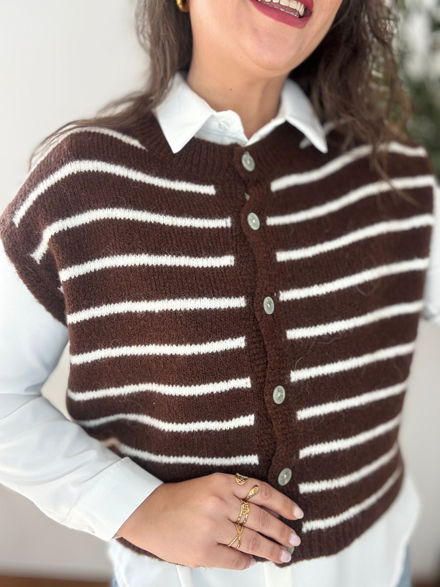Chaleco de lana TU RECOMENDADA 36/44. Ana lleva habitualmente talla L 40/42. Medidas del chaleco cerrado: contorno de pecho 120 y largo 52cm