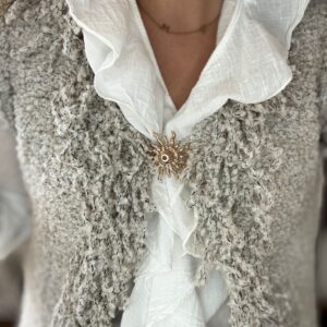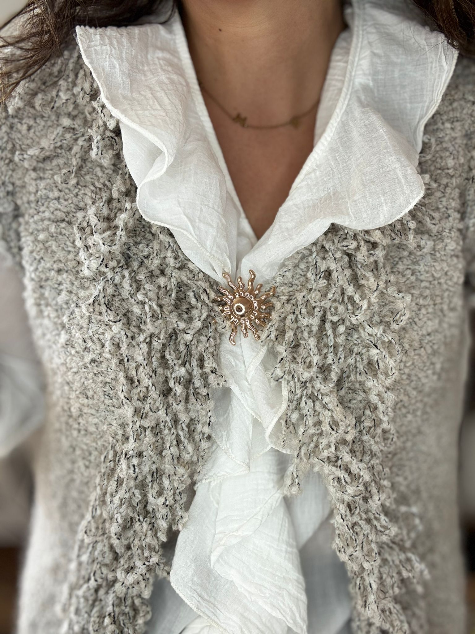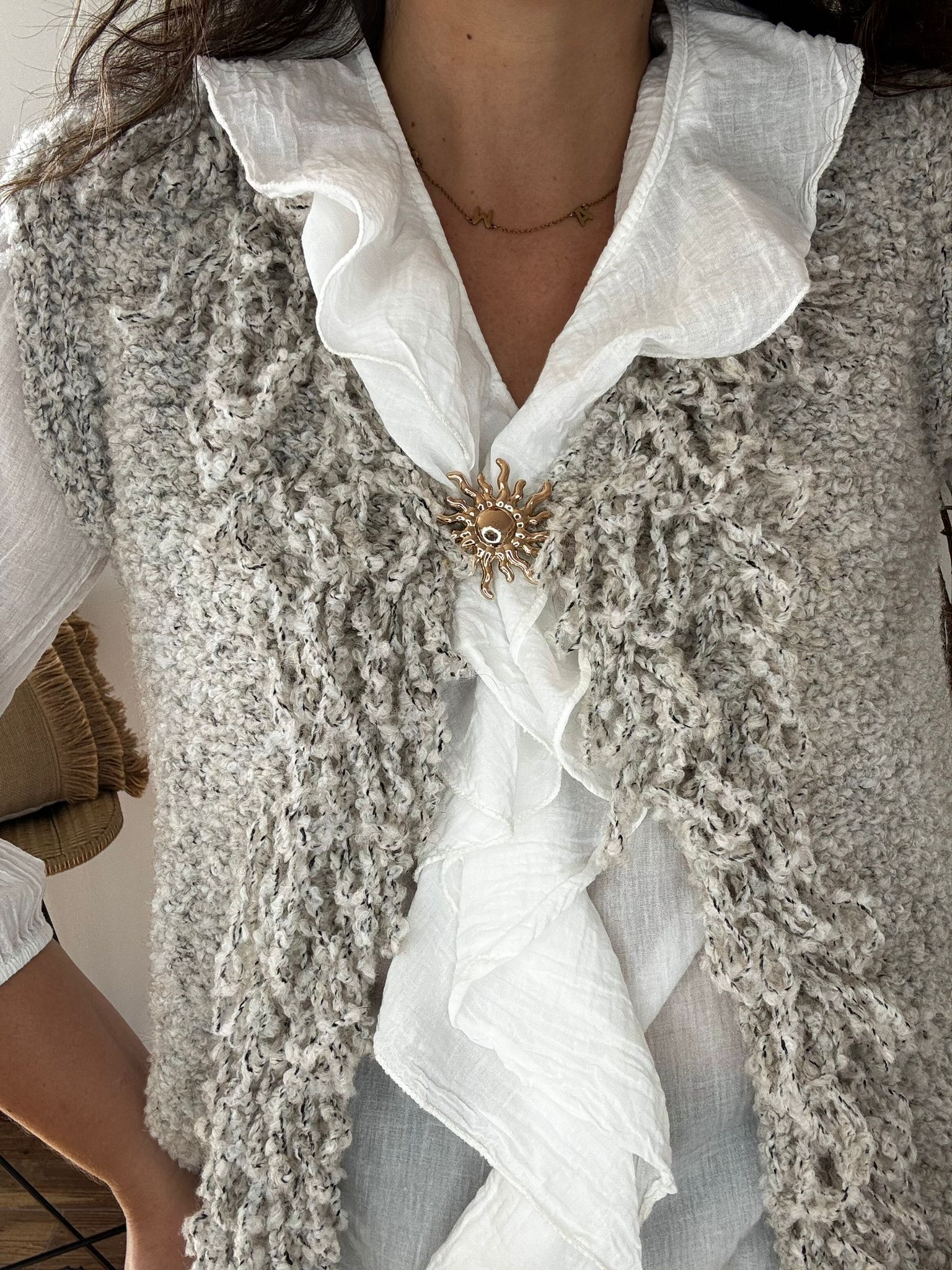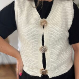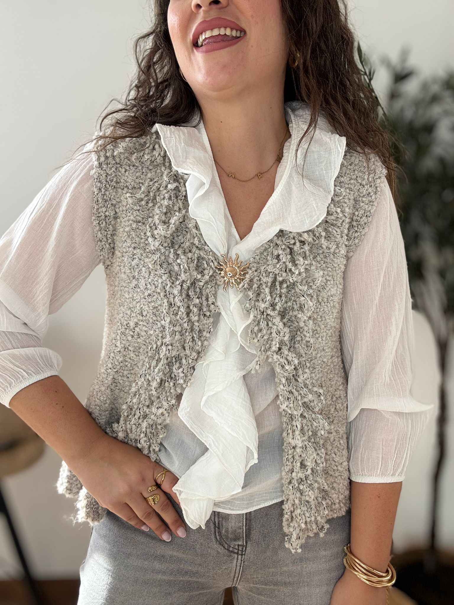 Chaleco de lanita jaspeado con flequillos y broche de quita y pon. TU RECOMENDADA 36/46. Ana lleva habitualmente talla L 40/42. Medidas del chaleco “cerrado” contorno de pecho 120 y largo 56cm