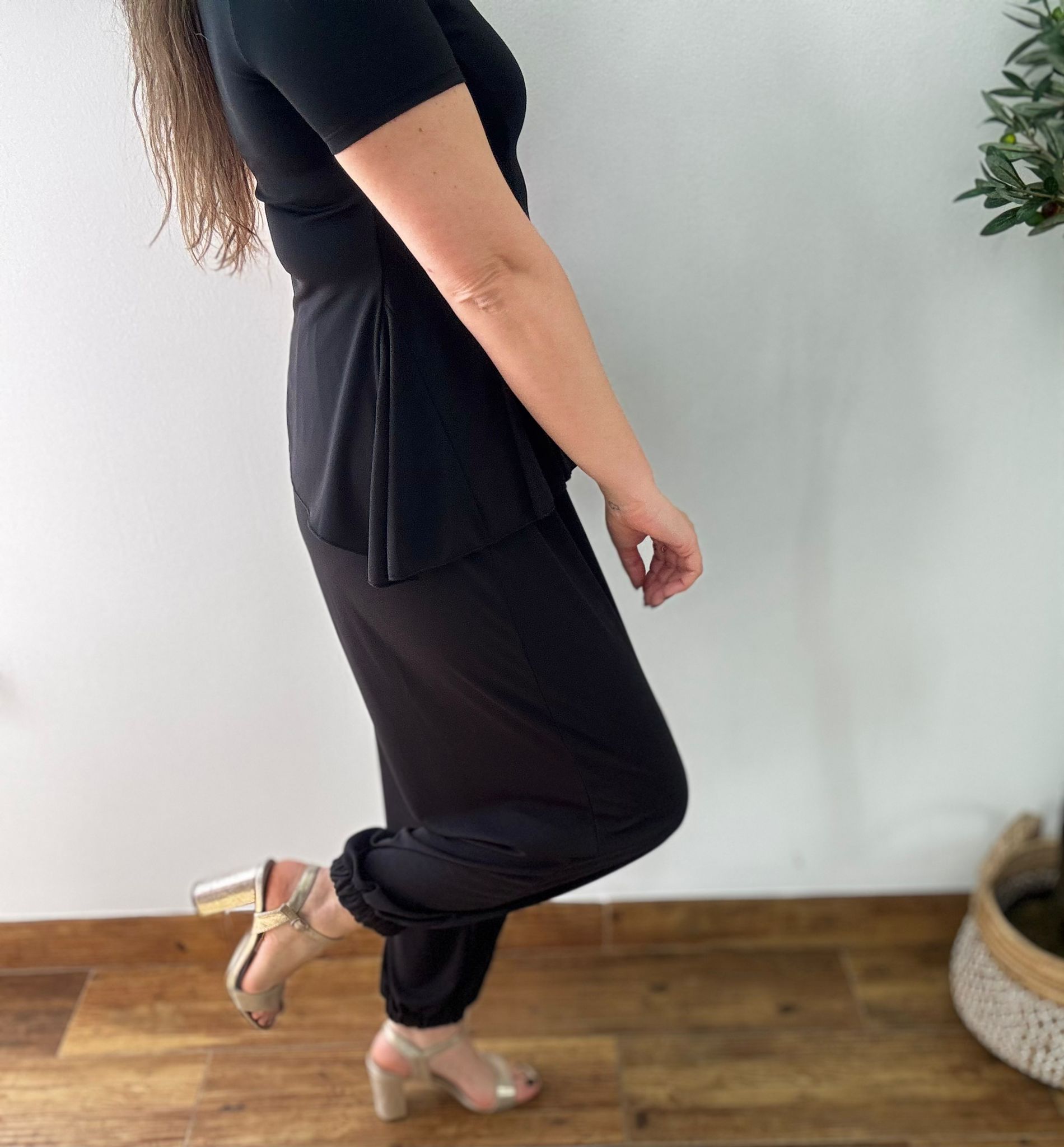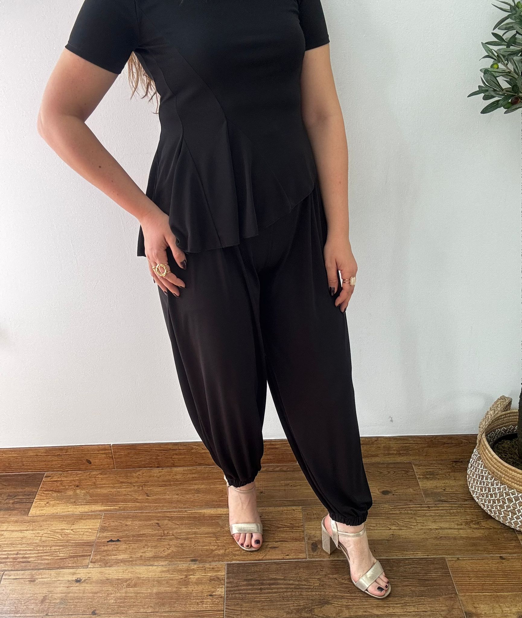 Conjunto de dos piezas top asimétrico y pantalón bombacho en licra.