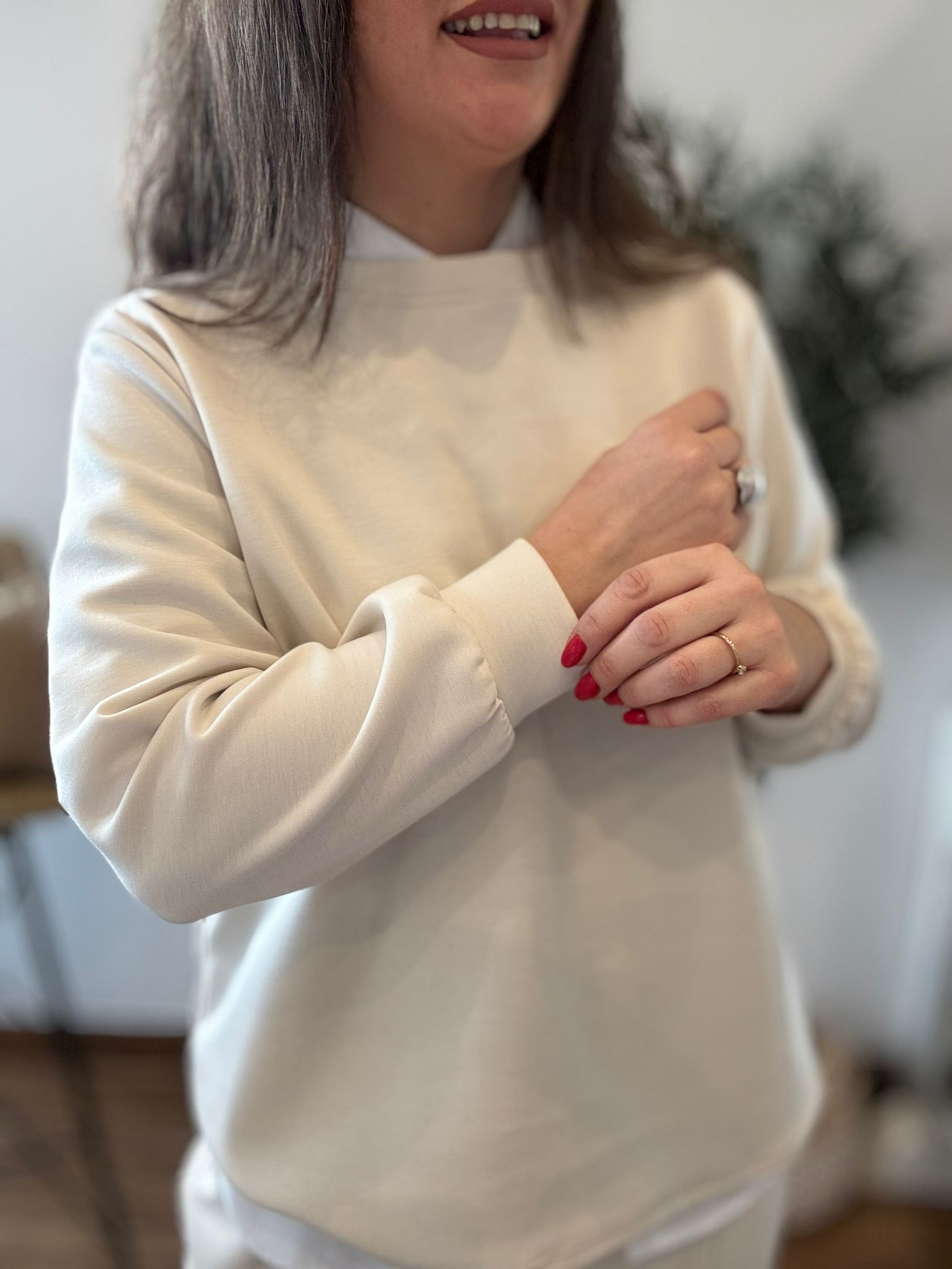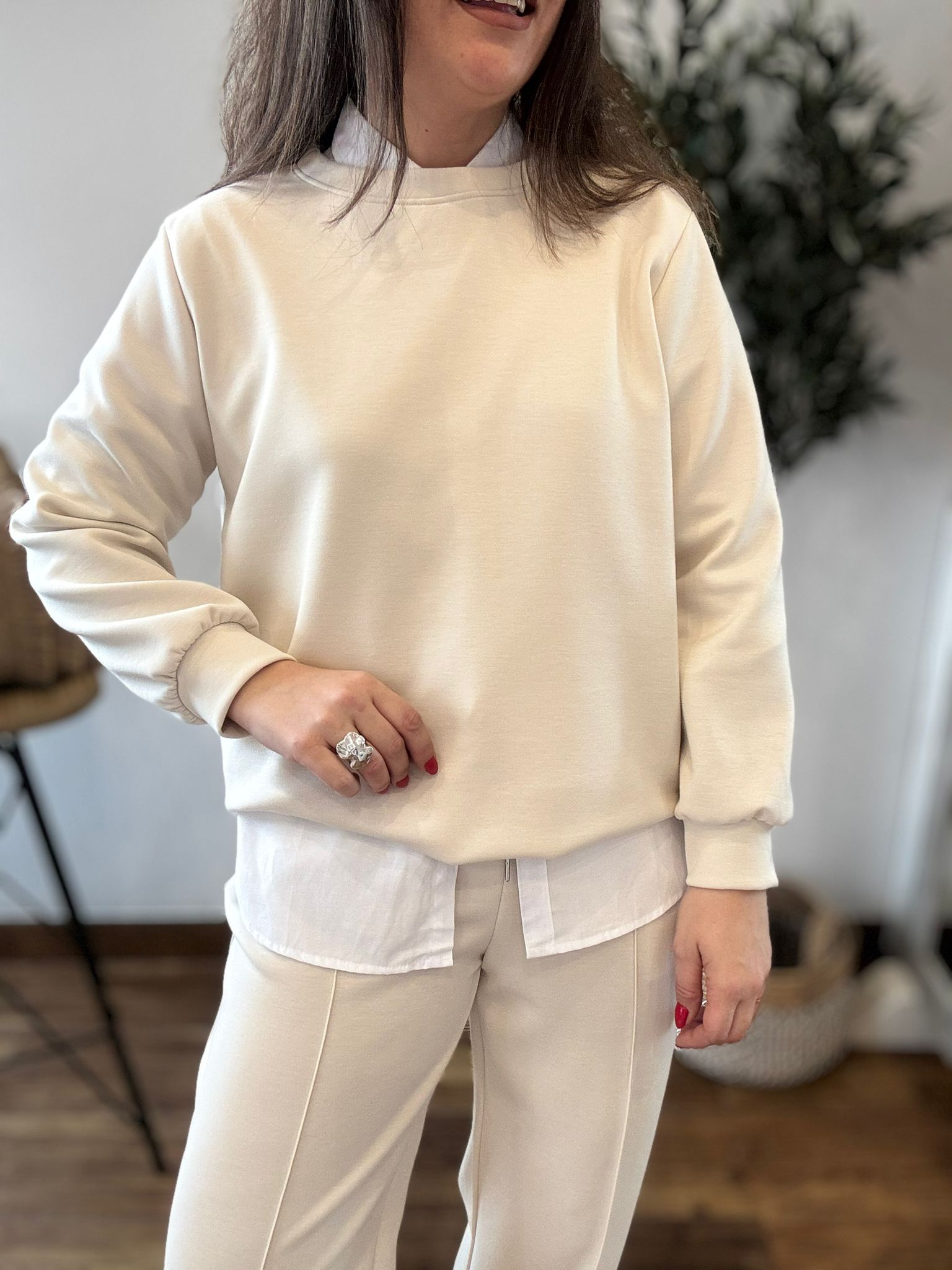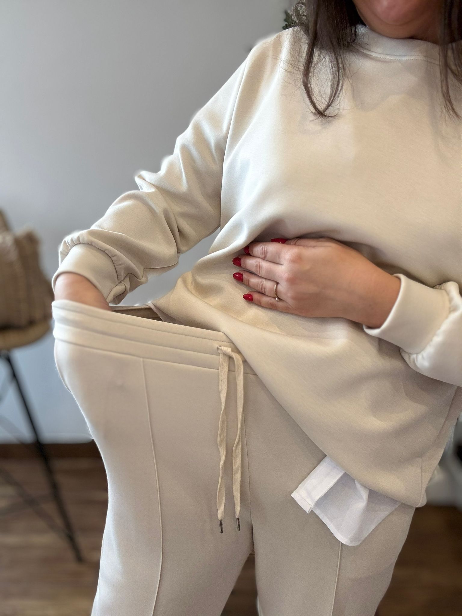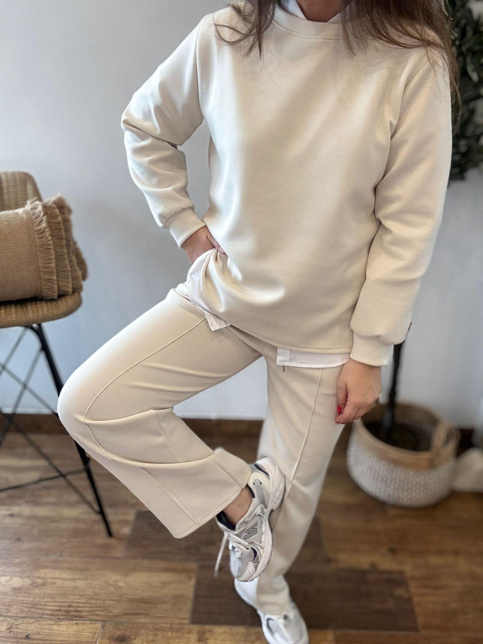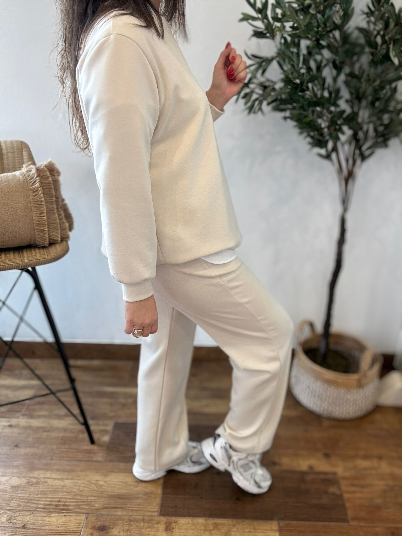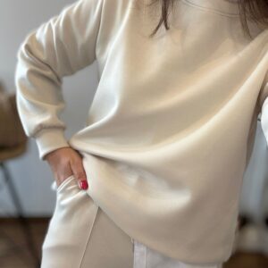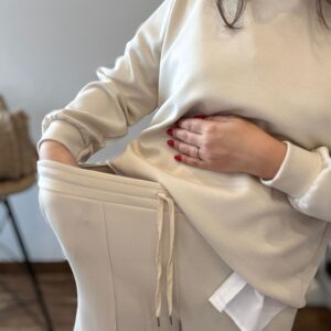 Conjunto tipo deportivo de sudadera y pantalón. Tejido suave que no se arruga! TU RECOMENDADA 36/44. El pantalón lleva bolsillos, goma y cinta para ajustar. Ana lleva habitualmente talla 40 y mide 1.71m Medidas del conjunto: sudadera contorno de pecho 120 y largo 65cm Pantalón cadera 120 y largo 101.