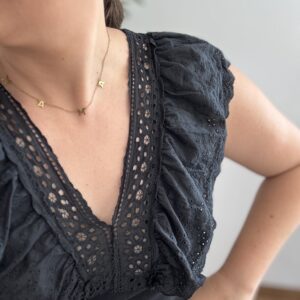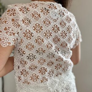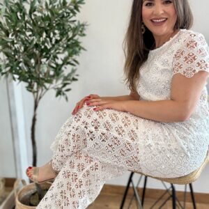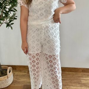 Conjunto blanco calado de top y pantalón. El top lleva forro por la parte delantera y el pantalón lleva un forro también. Ana mide 1.71 y lleva habitualmente talla 40/42, ha utilizado talla L/XL.