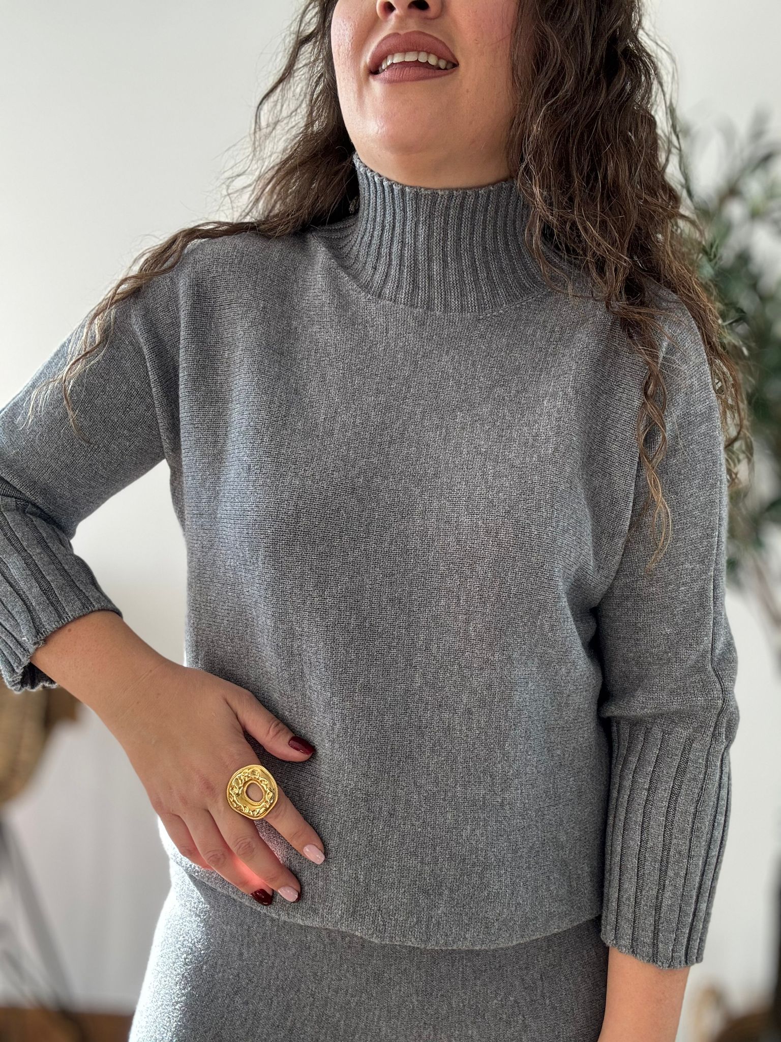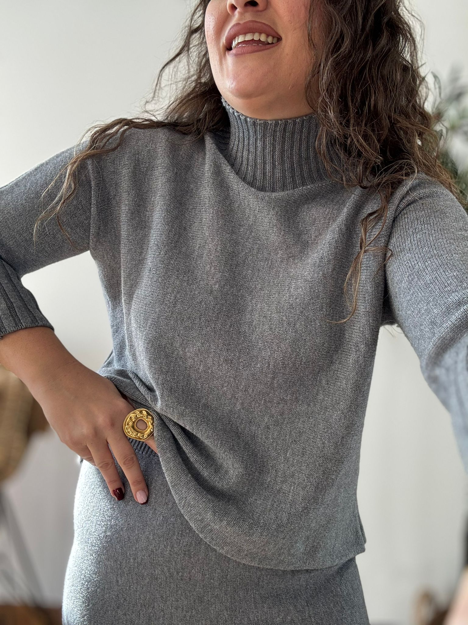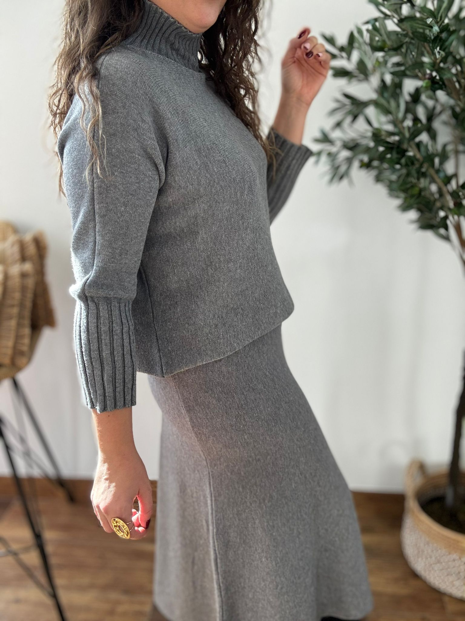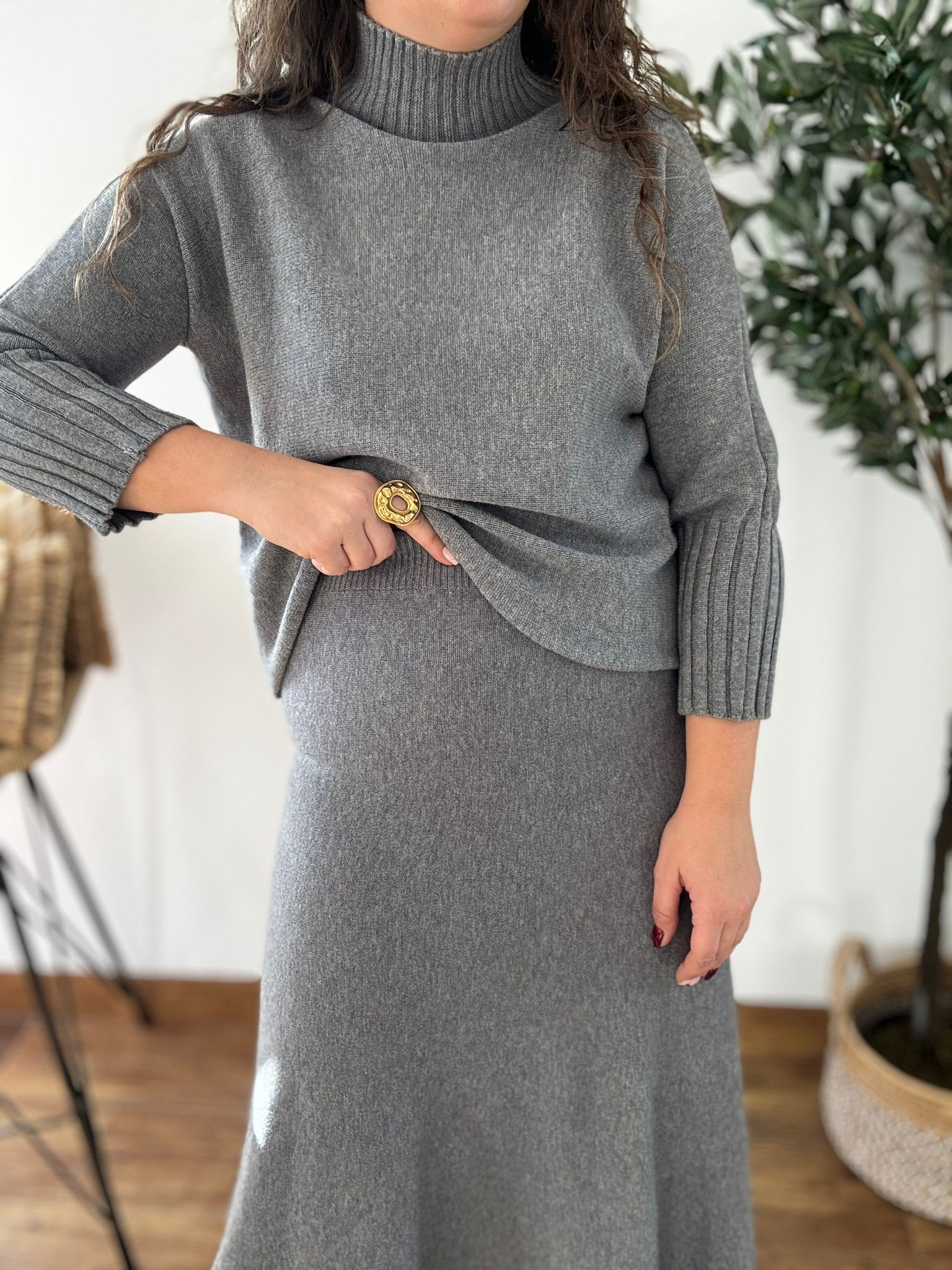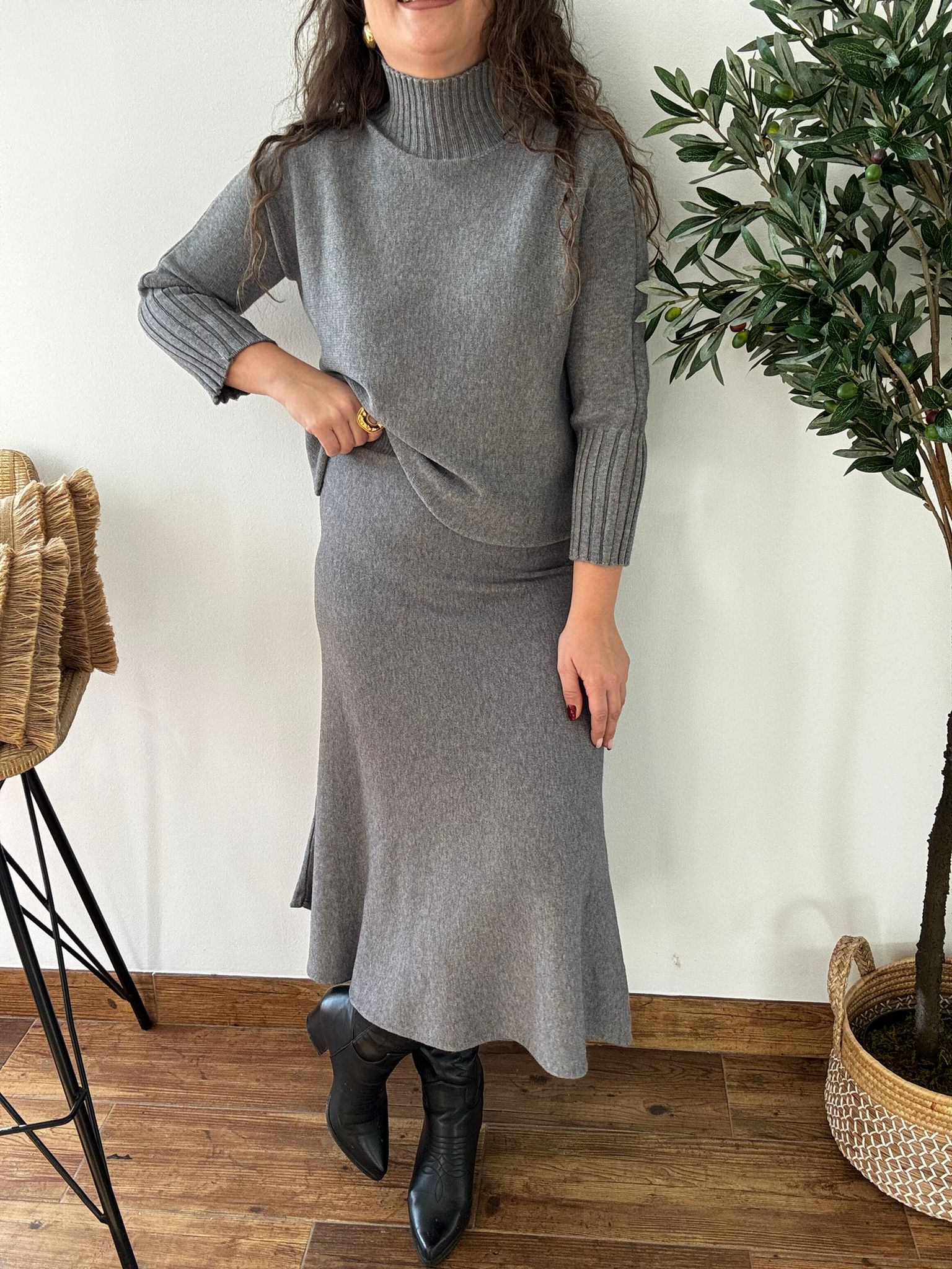 Conjunto de punto suave de jersey perkin y falda. La falda tiene cintura elástica. TU RECOMENDADA 36/44. Ana lleva habitualmente talla 40/42 y mide 1.71m