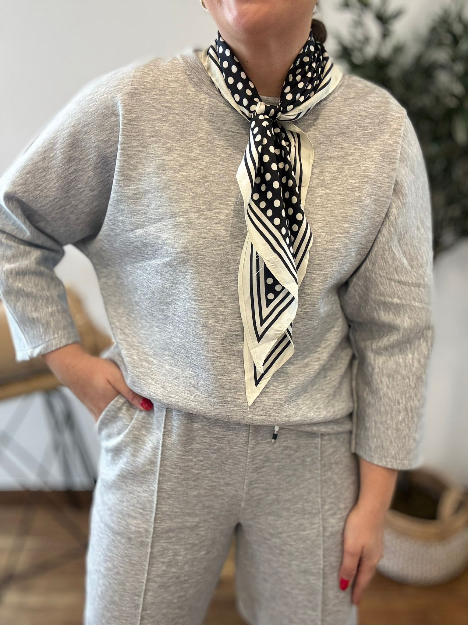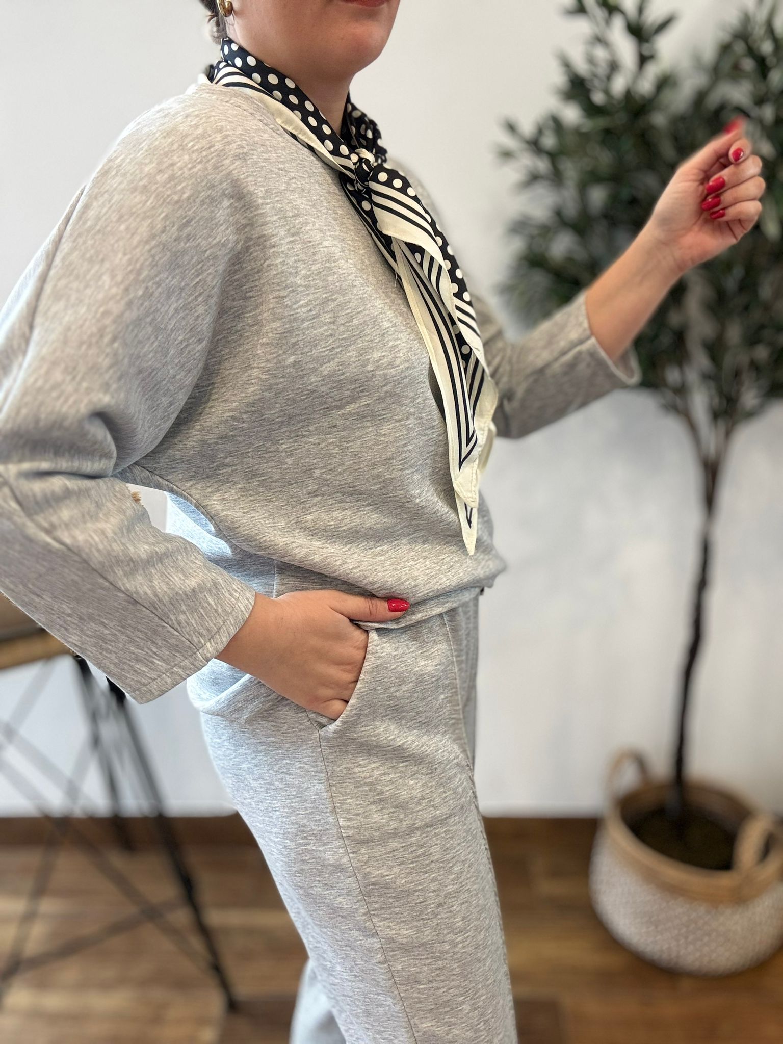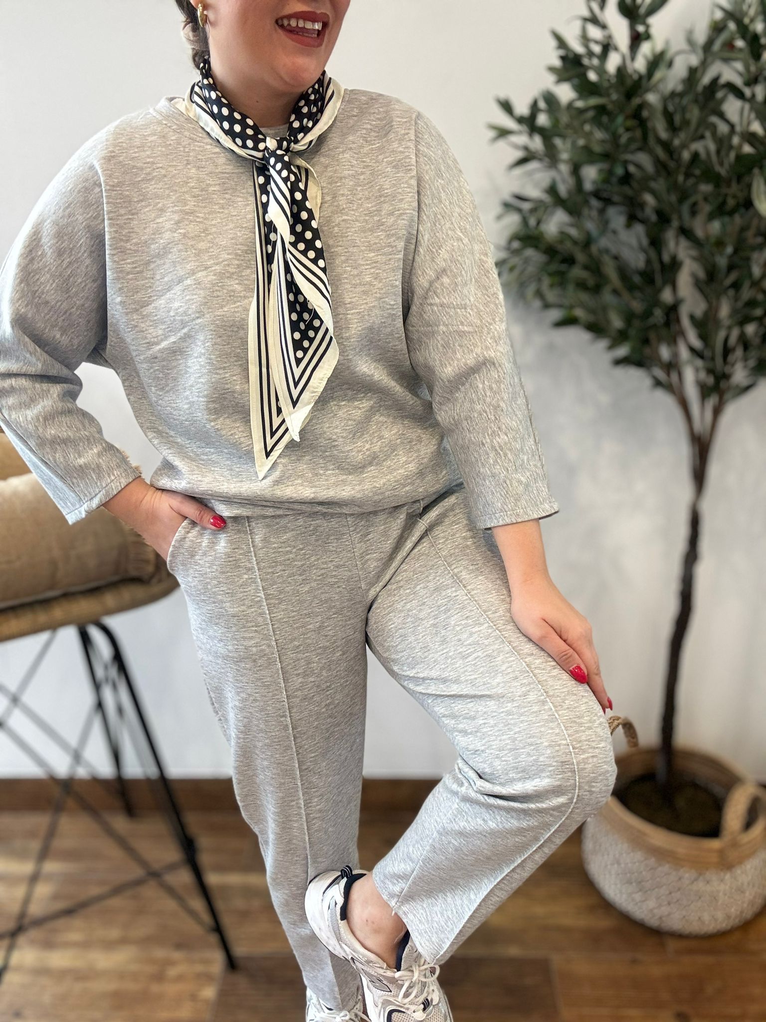 Conjunto sport de sudadera y pantalón. TU RECOMENDADA 36/44. La sudadera es oversize y el pantalón lleva cinta y goma en la cintura. Ana lleva habitualmente talla L/40 y mide 1.71m Medidas del conjunto: sudadera contorno de pecho 120 y largo 65cm. Pantalón cadera 130cm