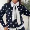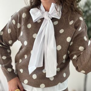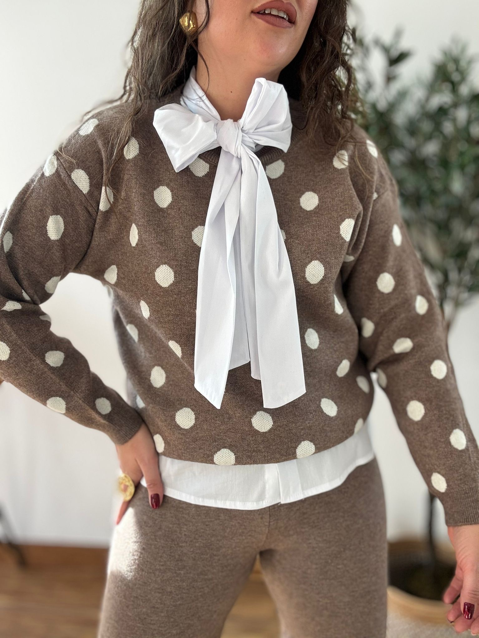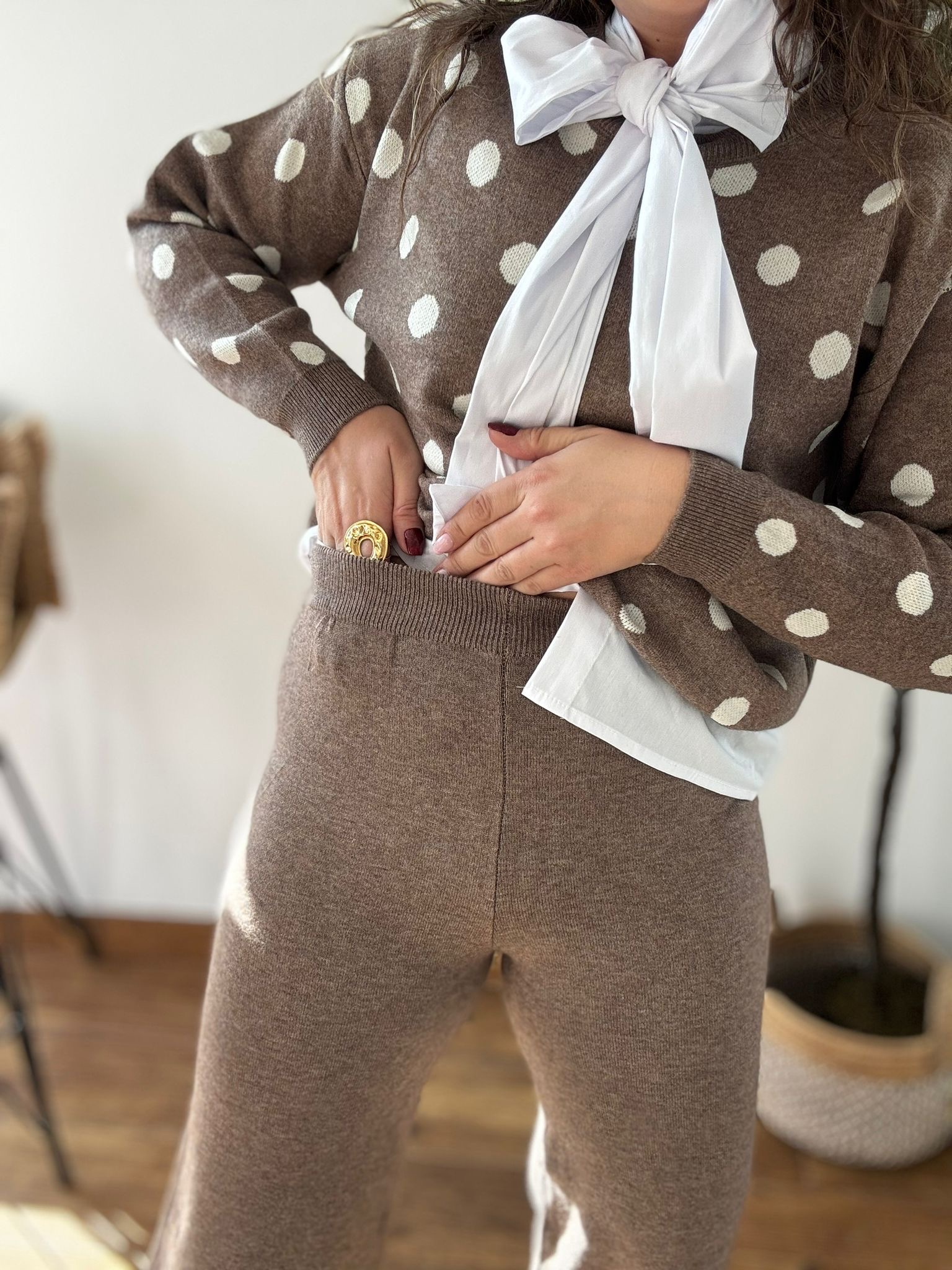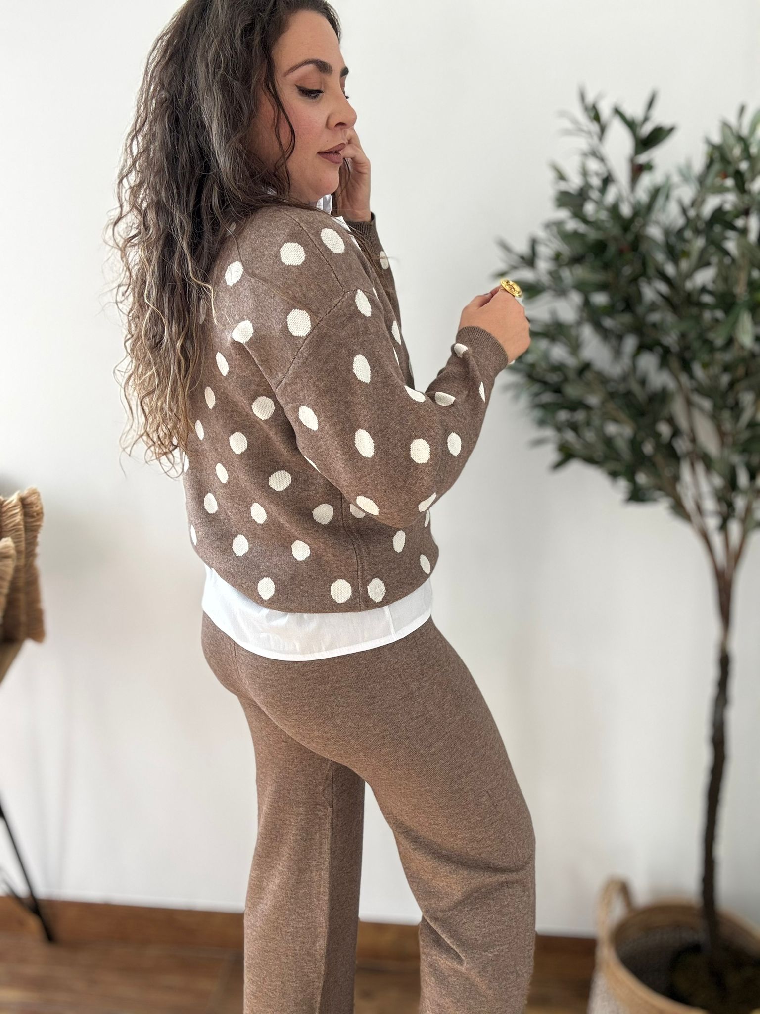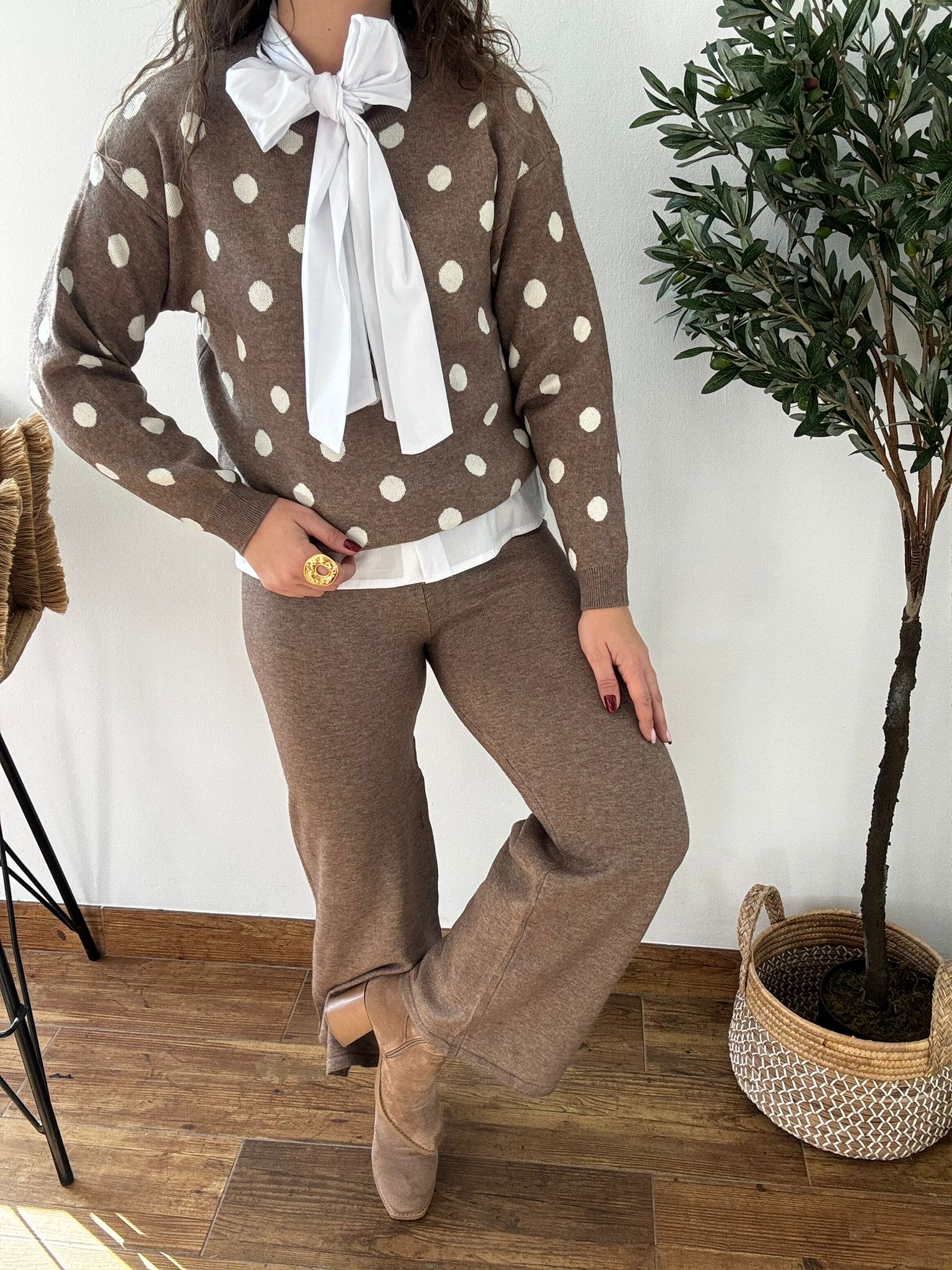 Conjunto de punto de pantalón y jersey estampado en lunares crema. TU RECOMENDADA 36/42. Ana lleva habitualmente talla 40/42 y mide 1.71m el pantalón lleva cintura elástica. Súper cómodo y precioso!! CAMISA LAZO NO INCLUIDA