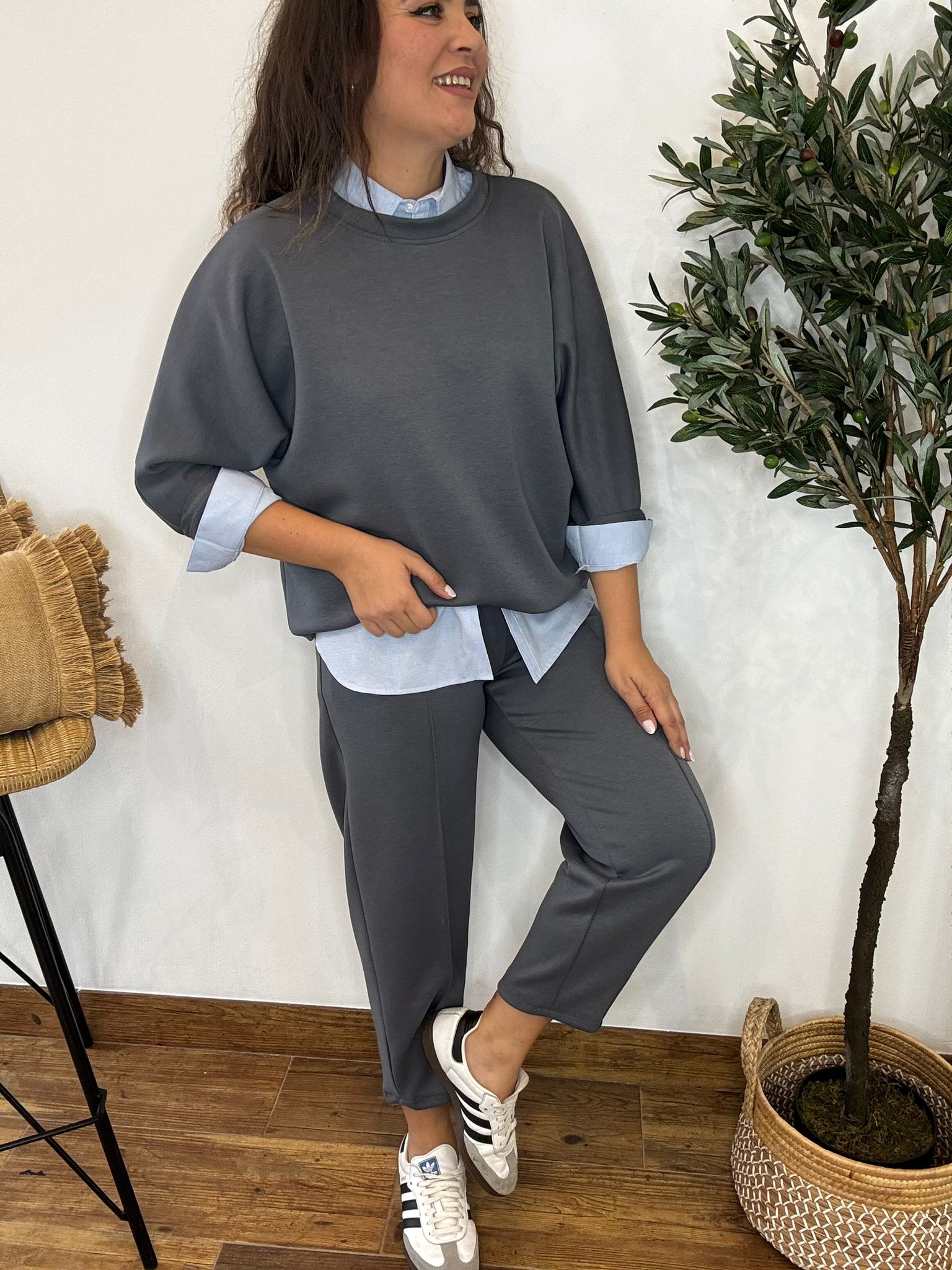 Conjunto deportivo de sudadera y pantalón. El pantalón lleva goma en la cintura y cuerda para ajustar, también lleva bolsillos. TU RECOMENDADA 36/44. Ana lleva habitualmente talla L 40/42 y mide 1.71m