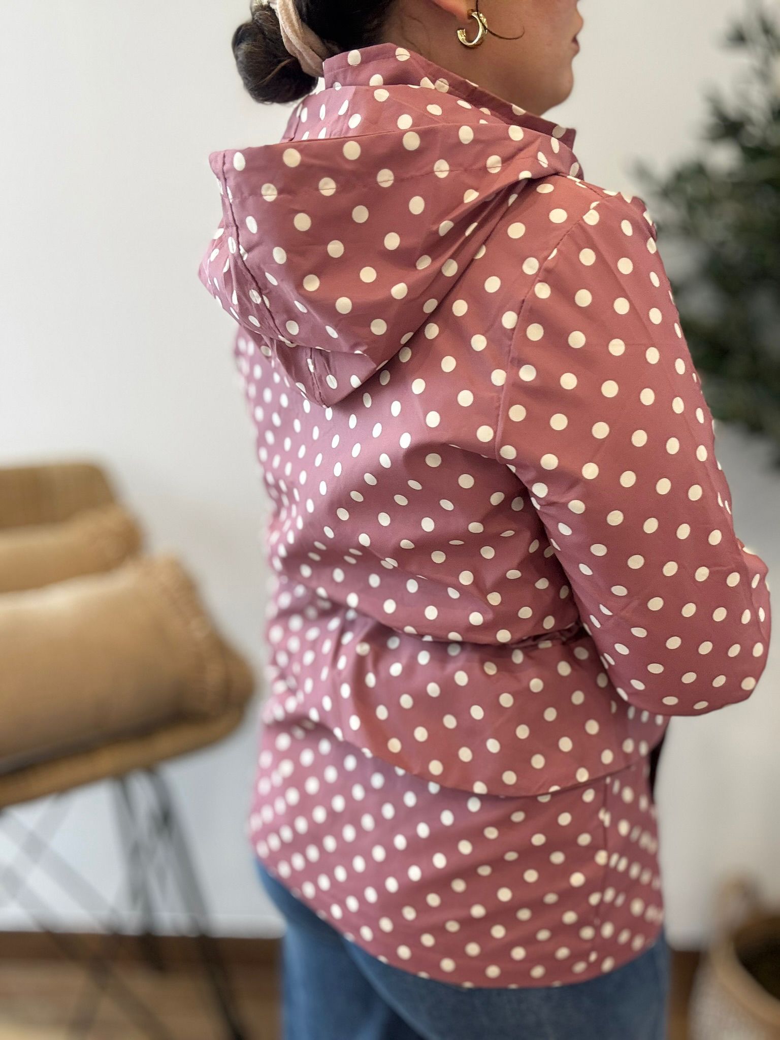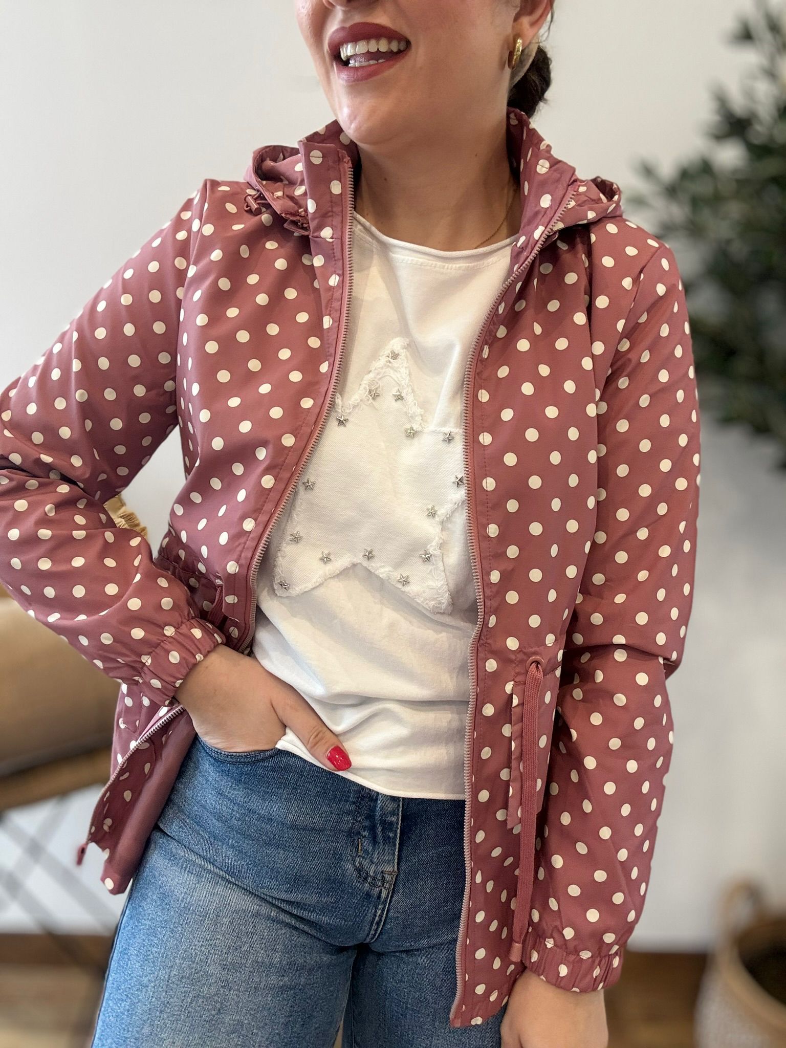 Chaqueta cortavientos estampada con detalle de volante en la cintura. Lleva cinta para ceñir la cintura y bolsillos. El gorro se quita con cremallera. Ana lleva habitualmente talla L/40 y de este modelo ha utilizado talla M. Medidas de contorno de pecho cerrado por tallas: S 100, M 108 y L 116cm