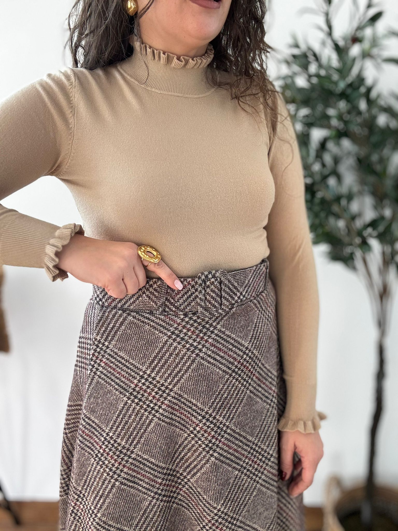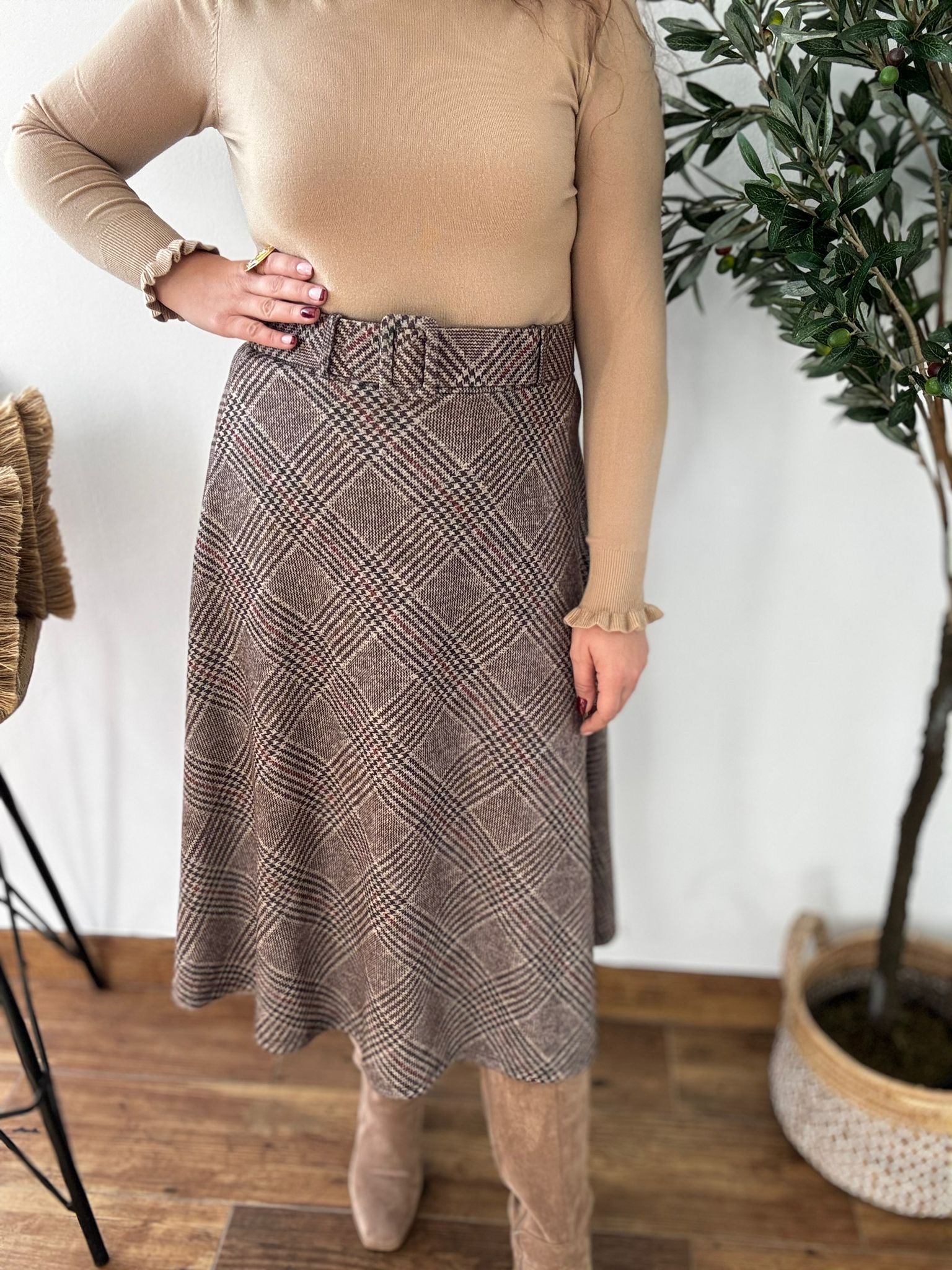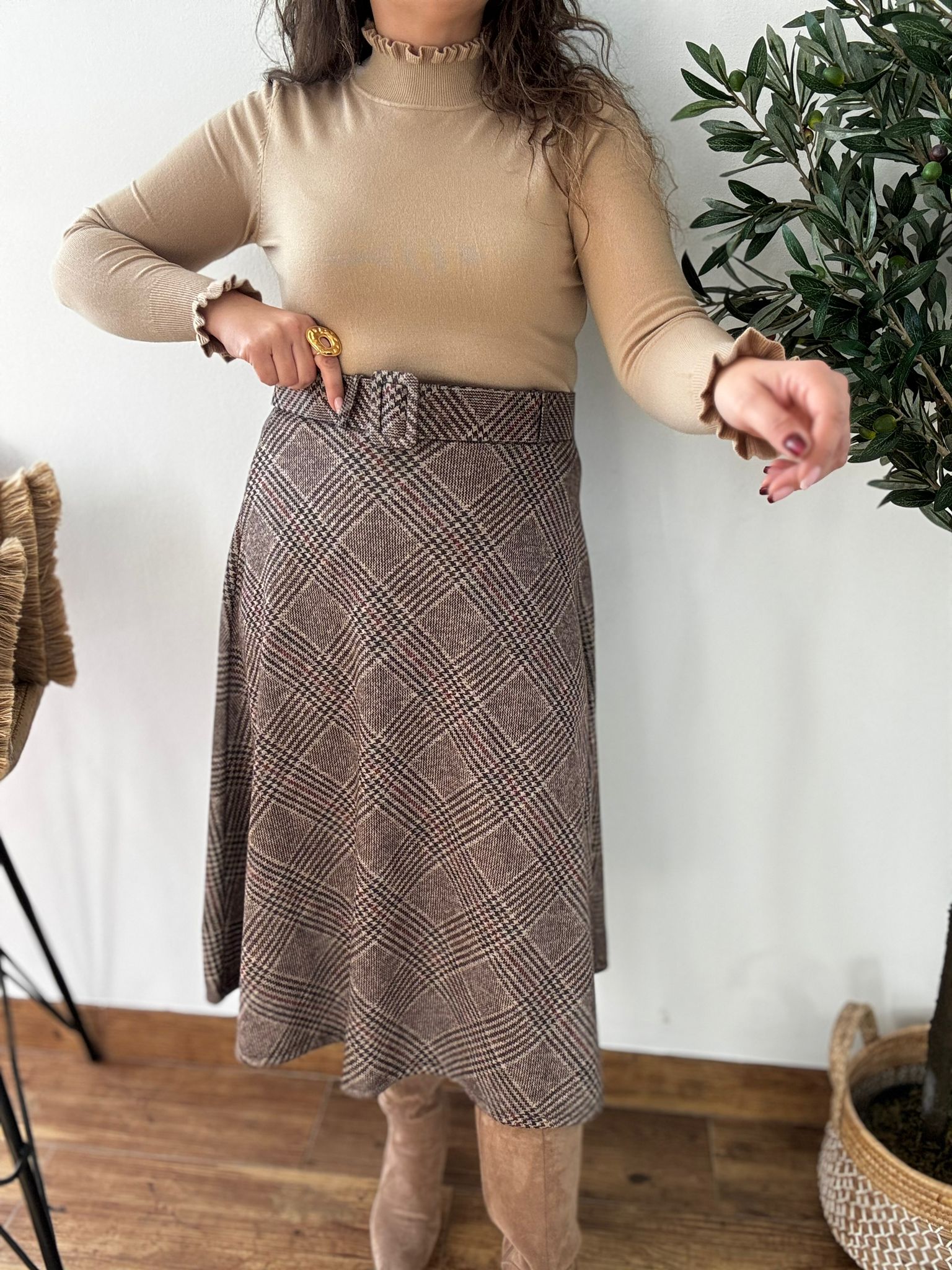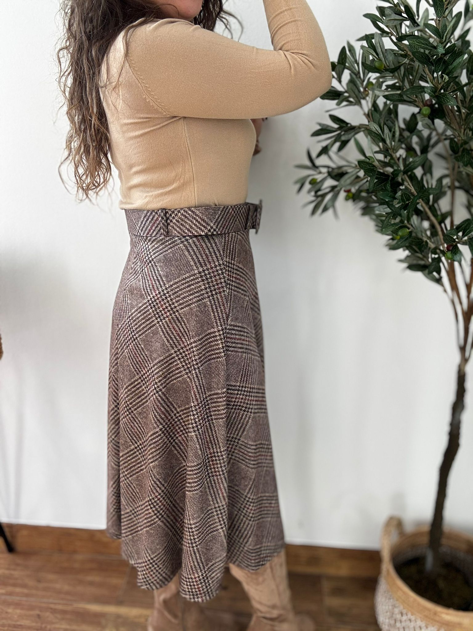 Falda de tejido calentito con cinturón incluido en el mismo tejido. Tiene cintura elástica.TU RECOMENDADA 36/42. Ana lleva habitualmente talla 40/42 y mide 1.71m Medida de la falda: cintura estirada 110, cadera 136 y largo 84cm