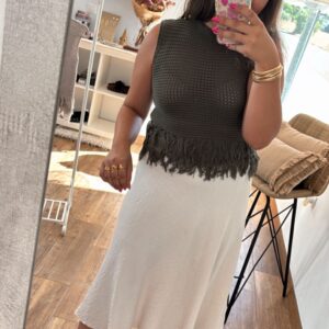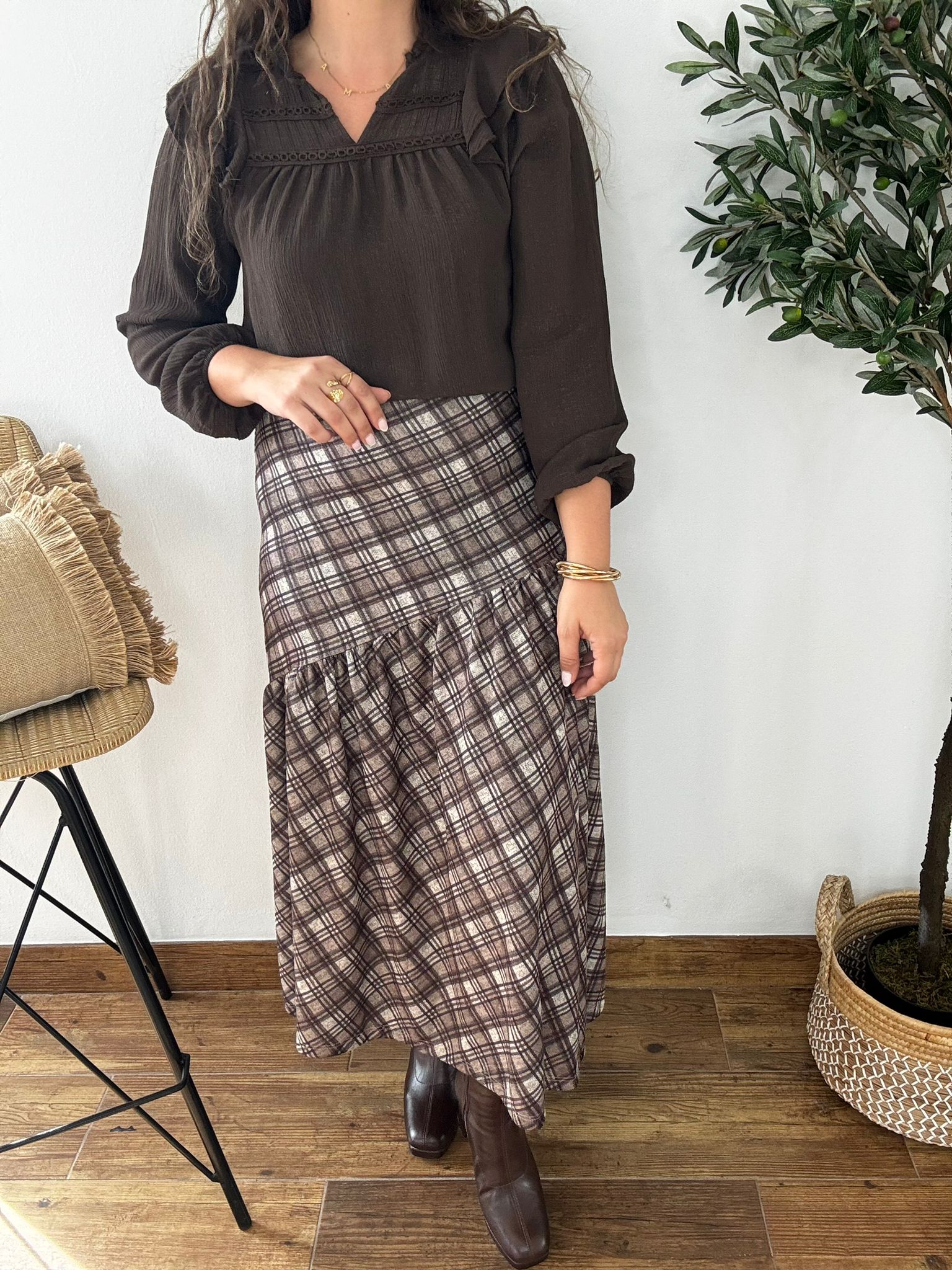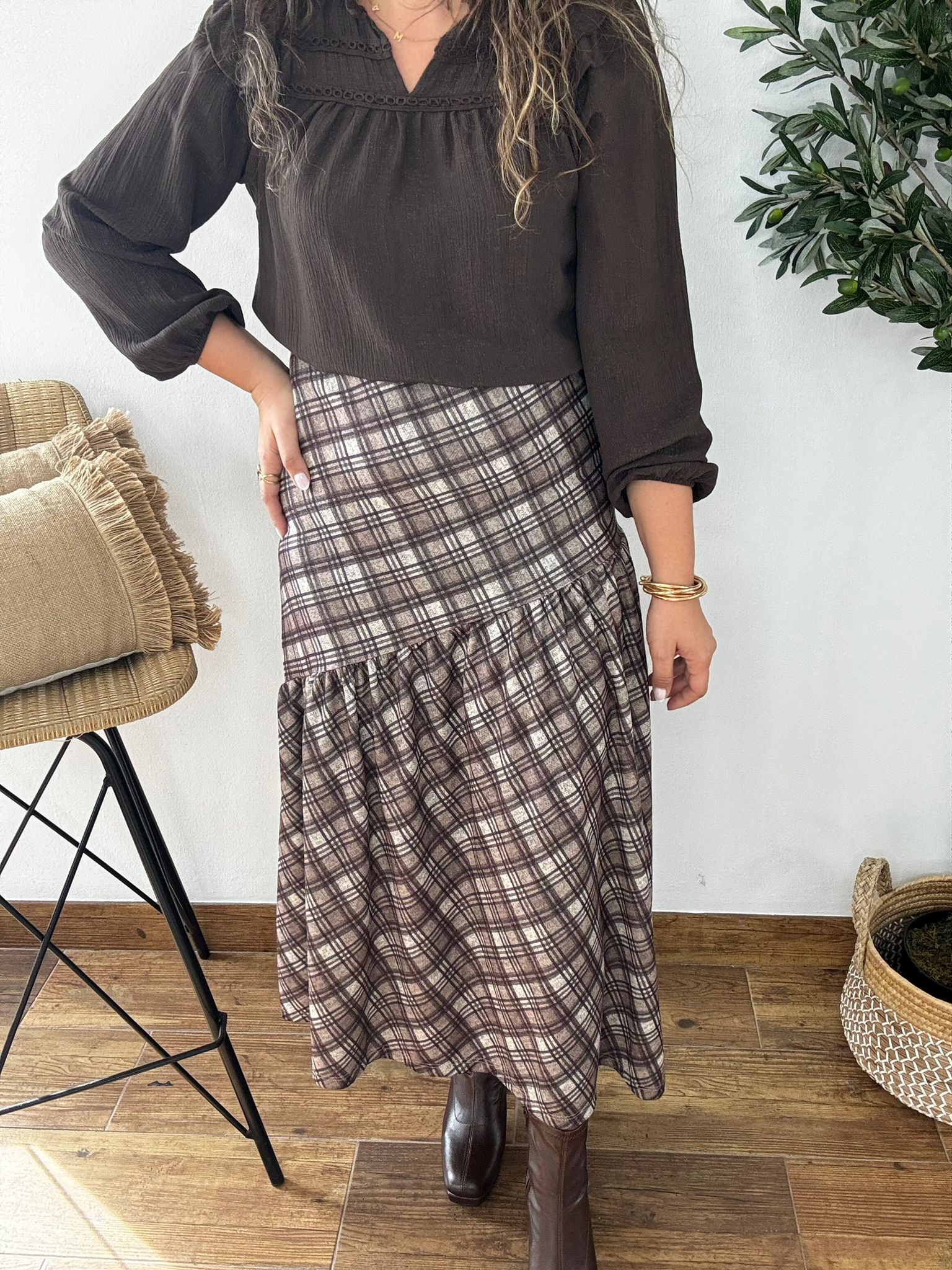 Falda de cuadros de tejido grueso. Lleva cinturilla elástica. TU RECOMENDADA 36/42. Ana lleva habitualmente talla L 40/42 y mide 1.71m Medidas de la falda: cintura estirada 100, cadera 120 y largo 94cm