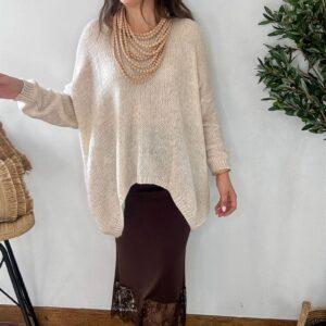 Falda de punto suave con cinturilla elástica y bajos de encaje en el mismo color. TIENE ELÁSTICO. TU RECOMENDADA 36/44. Ana lleva habitualmente talla L 40/42 y mide 1.71m Medidas de la falda: cinturilla estirada 120, cadera estirada 150 y largo 90cm